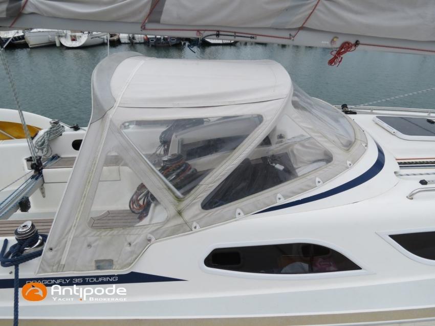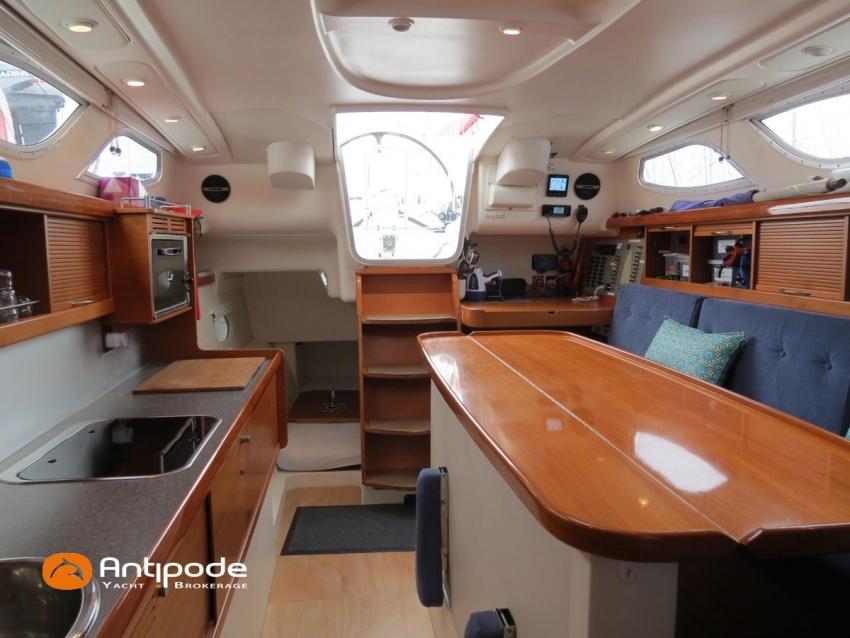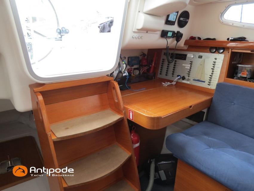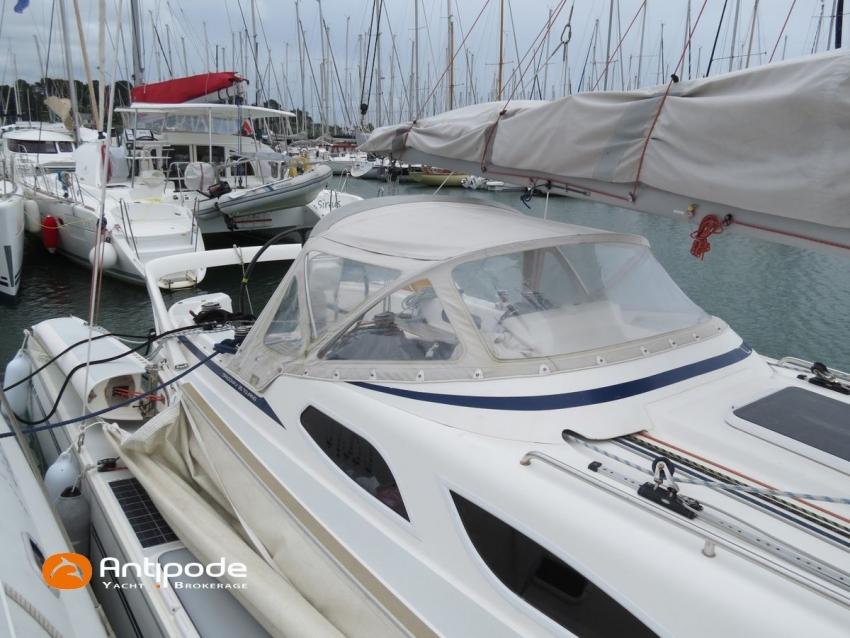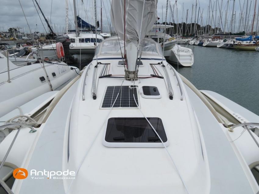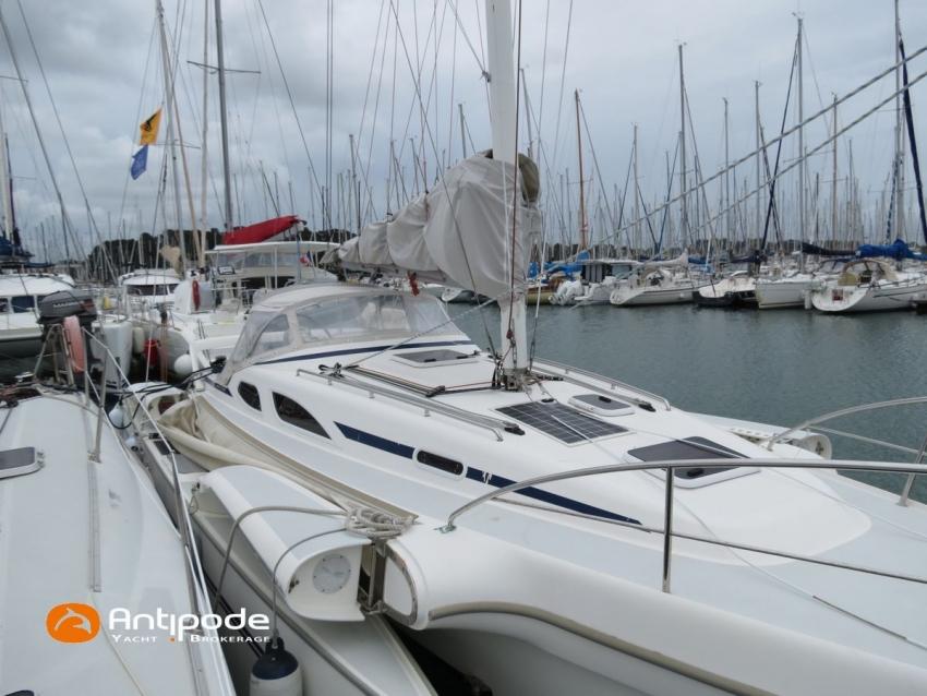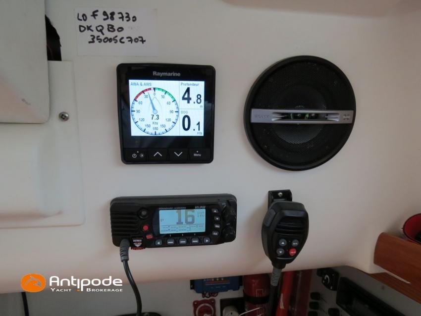DRAGONFLY 35, 2007, VOLVO D1-30HP (REPLACED in 2021) 28 hp (221 hrs), retractable bow thruster, Waterstays - 2017, Trampolines replaced 2025, Lifting straps, 2 electric genoa winches (electrification 2021) - Andersen 46, Carbon steering wheel - Jefa, Winter covering (center hull), Electric windlass - Quick, Aluminium boom 2020, Stainless steel cable standing rigging - 2017, Square head full batten main sail - Elvstrom Epex 2020, Main sail mast track + batten cars, Furling genoa - Elvstrom Epex 2020, Genoa anti-UV protection cover - 2020, Asymmetric spinnaker - 2007, Furlable gennaker 52 sqm - X VOILES 2020, Gennaker furler - facnor FX 2500 2020, Raymarine in board autopilot - EVO P70 S 2023, Navigation system 4 displays - Raymarine I70 S 2023, GPS and chartplotter (cockpit) - Raymarine AXIOM 7 2023, Electronic navigation charts - Navionnics 2023, AIS Transponder CLASS B (emission and reception), VHF at chart table - Standard Horizon 2021, VHF Multiplexer, Wifi Interface - Raymarine, Distress beacon (bat.exp. 2029) - Mc Murdo G8 2020, 220 V shore power + battery charger - victron Bluesmart 30 amp 2023, Service batteries - 2 X 100 amp LITHIUM 2021, 12 V to 220 V Inverter - 2023, Heating system EBERSPACER 3 outlets, Solar panels - 50 W X 3, Leds interior lights (saloon) - 2021, Liferaft (next service due 2026) - Seasafe 4 p. < 24 h 2023, Copper coat antifouling 2025, Located Brittany. For more information or to make an appointment for a visit, contact : Jérôme Le Joubioux +33 6 07 45 71 73 - jerome@antipode-yachts.com
