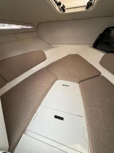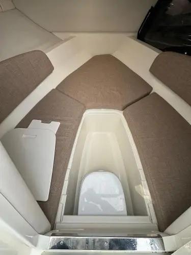 The VR5 is a great all-rounder with a fantastic cockpit layout. It includes a large L-shaped seating area, a single helm seat, and a huge sunbed at the aft. Under every seat and the sun pad, there are storage lockers. The cockpit also features a sink and a walk-through transom. This boat has a very high specification, including a Simrad GPS Chartplotter, SeaDeck flooring, tonneau cover, and a full cockpit canvas enclosure. Below deck, it has a spacious double V-berth with a deck hatch and a porta-potty.