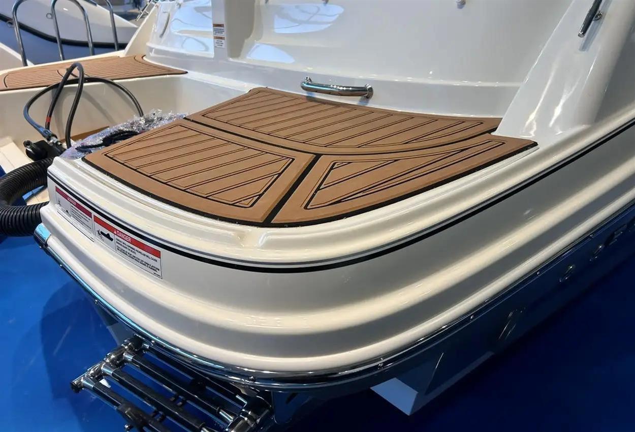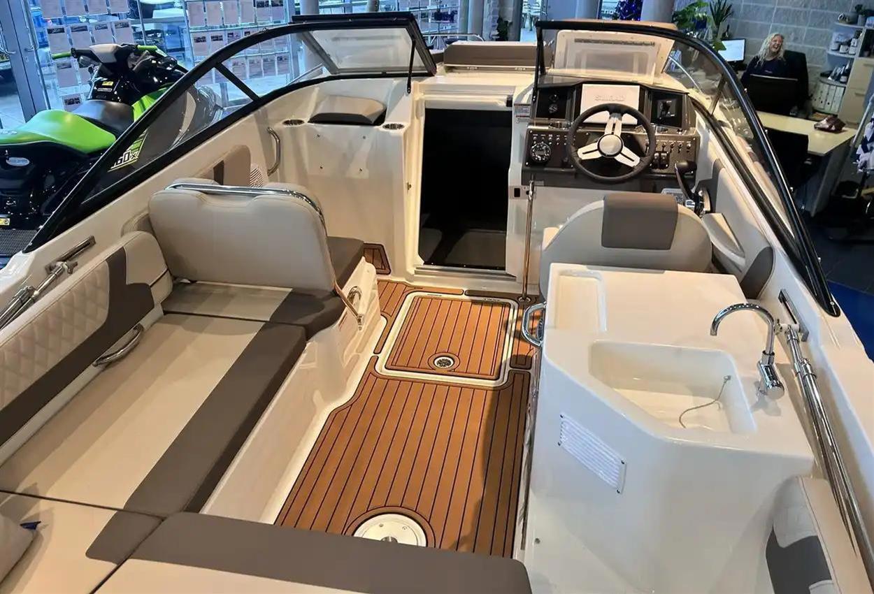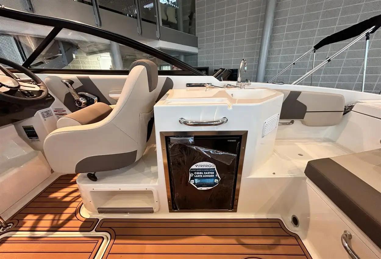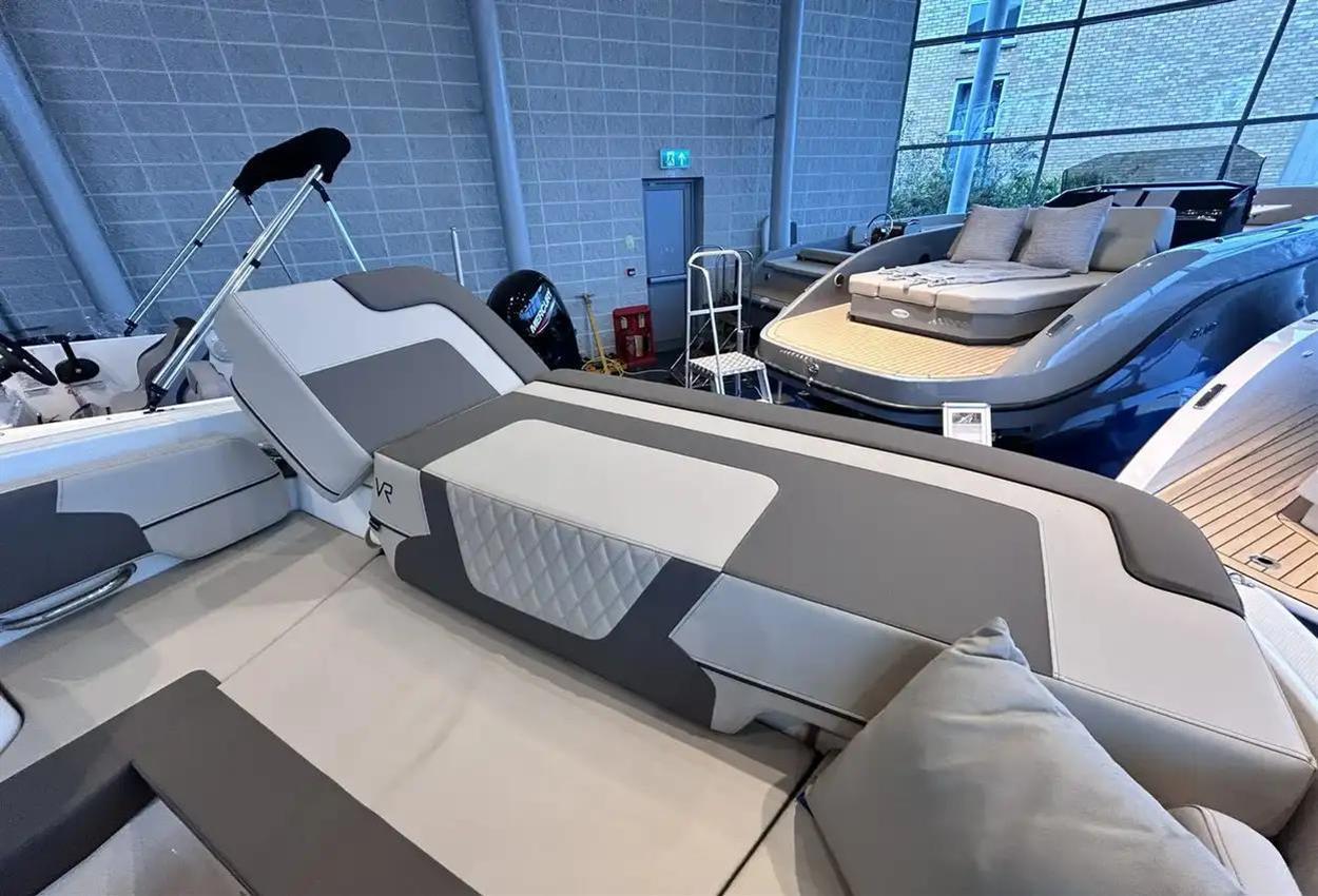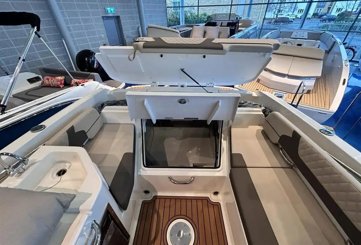Bayliner VR6 Cuddy Outboard The VR6 Cuddy combines the distinct styling and space maximization Bayliners popular VR Series is known for. The cuddy cabin features an enclosed head and access door with molded steps for easy foredeck access. Relax on the foredeck sun lounger with adjustable backrest or gather in the cockpits wraparound seating with an optional entertainment area. VIEW NOW IN OUR CHERTSEY SHOWROOM! TOTAL BOAT VALUE: PS90,440 // STOCK BOAT PROMOTION: PS82,950 Key Features Cockpit seating is maximized with room for an optional entertainment area Wraparound cockpit seating allows for filler cushions and storage Foredeck sun lounging area with adjustable backrest Standard Features Cockpit Integrated Cooler Standard Speakers (2) Cup Holders (6) Grab Handles (5) Mooring Cleats (6) Fuel Fill w/ Integrated Vent Glove Box Waterproof 120-Watt AM/FM Stereo w/ mp3 Capability Helm Seat w/ 180 Degree Swivel Self-Bailing Cockpit Engine Compartment & Electrical Battery Switch 500 GPH Bilge Pump (Automatic) 12V Blower Helm Multi-Function Gauges w/ Fog-Resistant Glass Lenses: Fuel, Speedometer, Tachometer, Voltmeter 12V Accessory Outlet 12V Horn Analog Trim Indicator Side-Mounted Engine Controls w/ Trim & Tilt Switch in Handle Tilt Steering Custom Sport Steering Wheel Hydraulic Steering System (115 HP and Below Outboard Only) Hull & Deck Bow & Transom Eyes (3) 12V Navigation Lights Stainless Steel Tow Ring Non-Skid Fiberglass Floor Sport Windshield w/ Opening Center Panel Swim Platform w/ Telescoping Ladder (Outboard Only) Anchor Roller Transom Shower w/ On-Demand Water System Bow Rail Cabin Fiberglass Ceiling Liner Deck Hatch Deck-Side Windows (2) Sleeping Cabin for 2 Head Portable Head Seating & Upholstery Removable Cockpit Cushions Factory Fitted Extras Grey Hull with Grey Waterline Tape Bow Thruster Canvas Pack - Enclosure (Bimini Top / Enclosure Curtains / Cockpit Cover) Ski Pole Desert Sand Interior Swim Platform Teak Mat Cockpit Flooring Teak Mat Cockpit Entertainment Centre Package Digital Dash with Vesselview 9'' Upgrade Electric Windlass with Anchor & Chain Hydraulic Trim Tabs Preferred Equipment Package (Teak Table / Stainless Steel Pack) Cushion Package (Helm Bucket Seat Upgrade / Bow Sunpad) Head - Manual Flush Macerator with Seacock Interlock System Uk Extras UK PDI & Delivery Ex Bates Wharf Commissioning Kit Trailer Options Euro Bunk Trailer R4/3000B - PS6,550 inc. VAT Euro Roller Trailer R4/3000EL - PS7,000 inc. VAT Disclaimer The Company offers the details of this vessel in good faith but cannot guarantee or warrant the accuracy of this information nor warrant the condition of the vessel. A buyer should instruct his agents, or his surveyors, to investigate such details as the buyer desires validated. This vessel is offered subject to prior sale, price change, or withdrawal without notice.