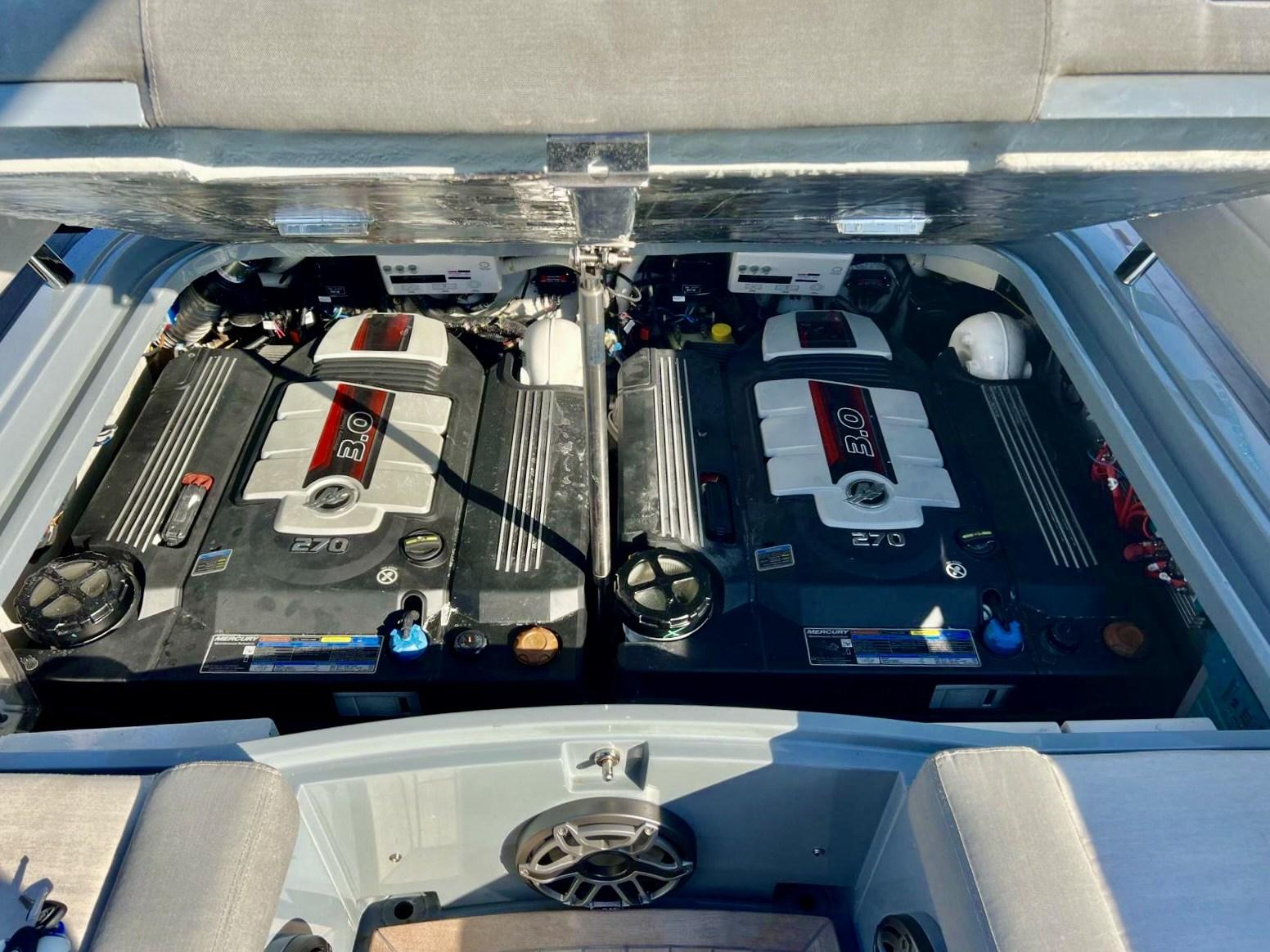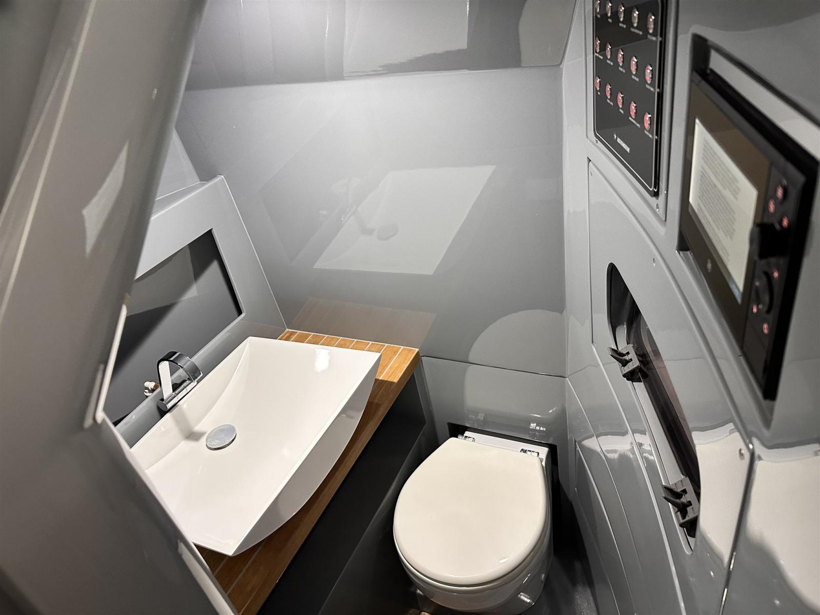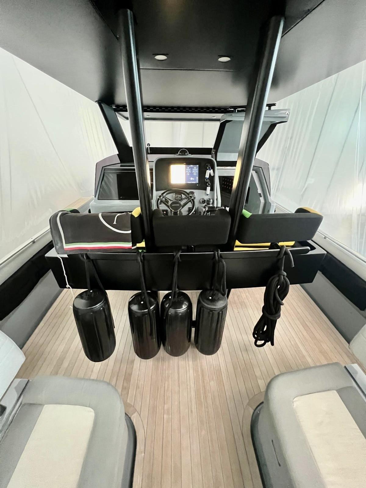 Bilge Alarm, Anchor (inox 316 con catena inox), Electric Engine Compartment Opening, Water pressure pump, 4 Batteries (1 Start 1 service, 1 elica di prua), Battery charger (Mastervolt), Bow Thruster (Side Power SE 60/185S2), Directional Spotlight (Marinco 100 w Con attuatore elettrico), Underwater lights, Teak deck, Teak Cockpit, Shorepower connector, Electric Windlass (Con controllo remote e videocamera), swimming ladder, Horn, T-Top (Carbonio).