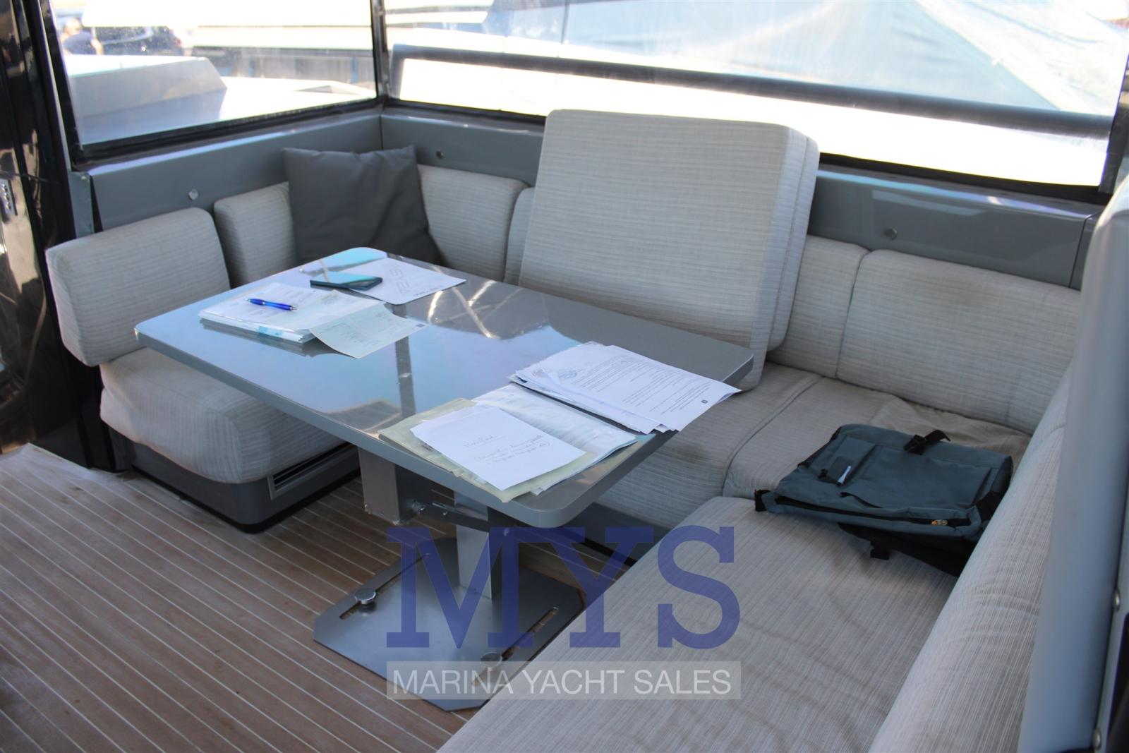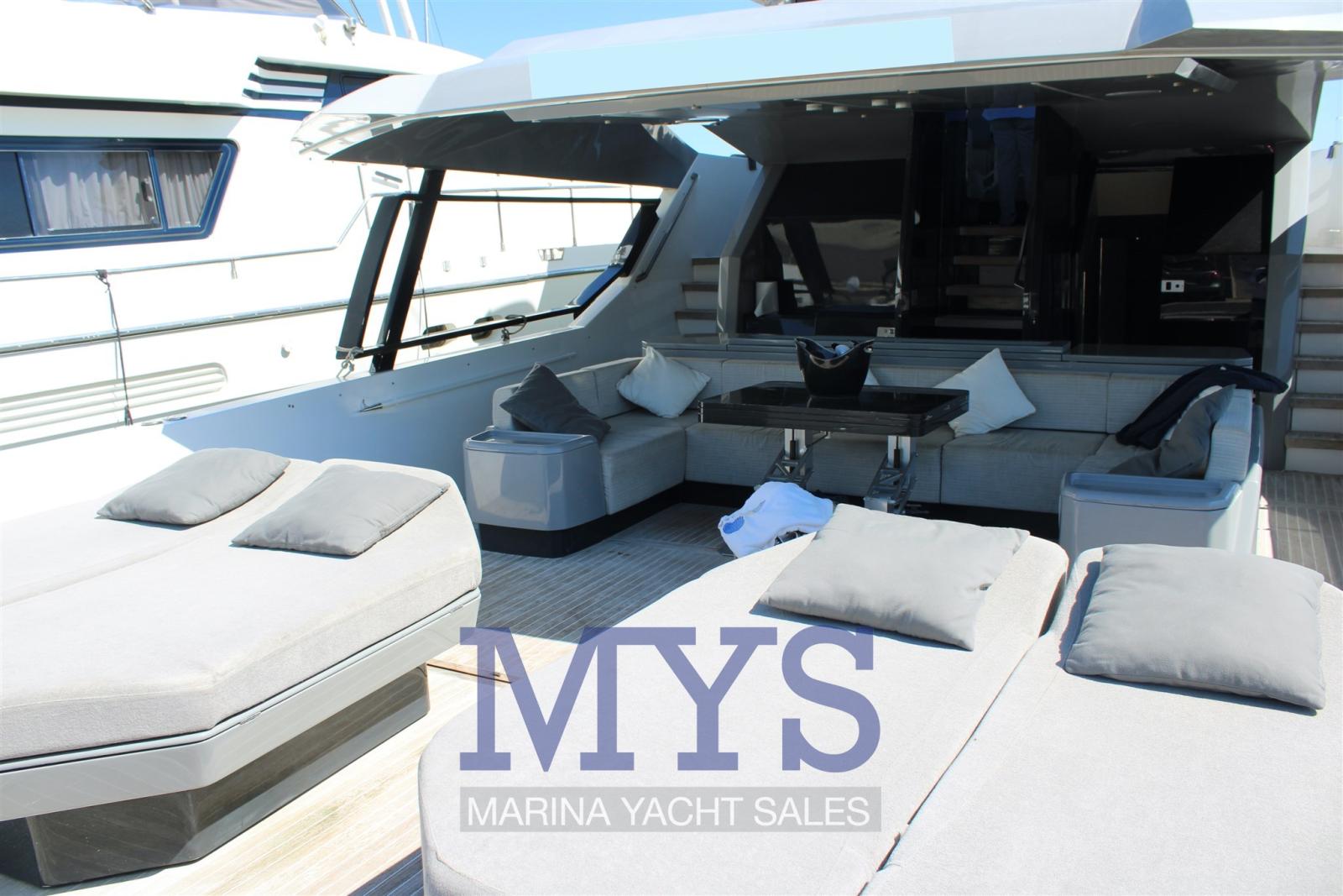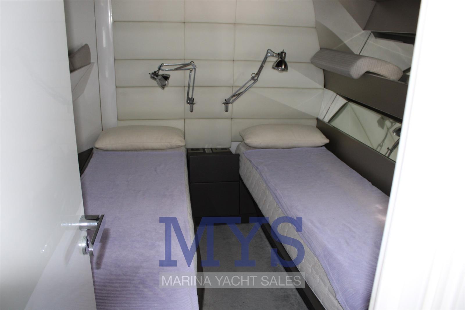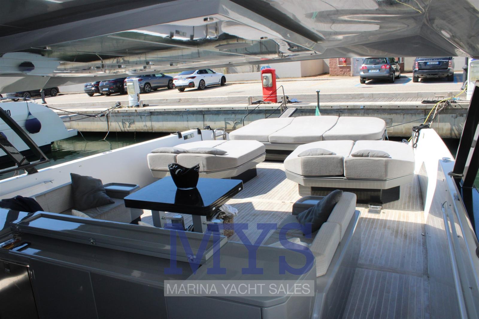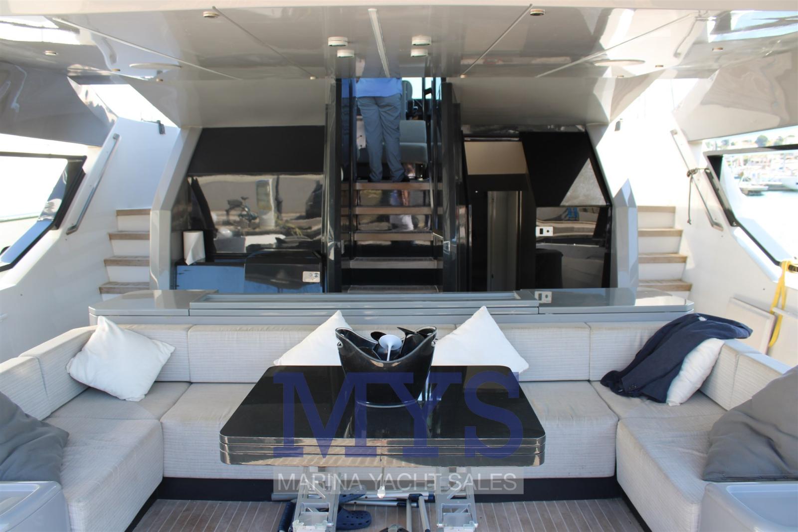 Engine Alarm, Alternator, Electric Engine Compartment Opening, Water pressure pump, Auto-Trim, Teak Side Decks, Special Colour, Deck Shower, Directional Spotlight, Tender Garage, Tender Crane, Fire Extinguishing System, Flaps Indicators, Washbasin in the cockpit, Courtesy Lights, Underwater lights, Solar panels, Gangway, Platform, Automatic Bilge Pump, Teak deck, Teak Cockpit, Shorepower connector, Water harbor connector system, Electric Windlass, swimming ladder, Stabilizers, cockpit table, Horn, T-Top, Stern Winches.