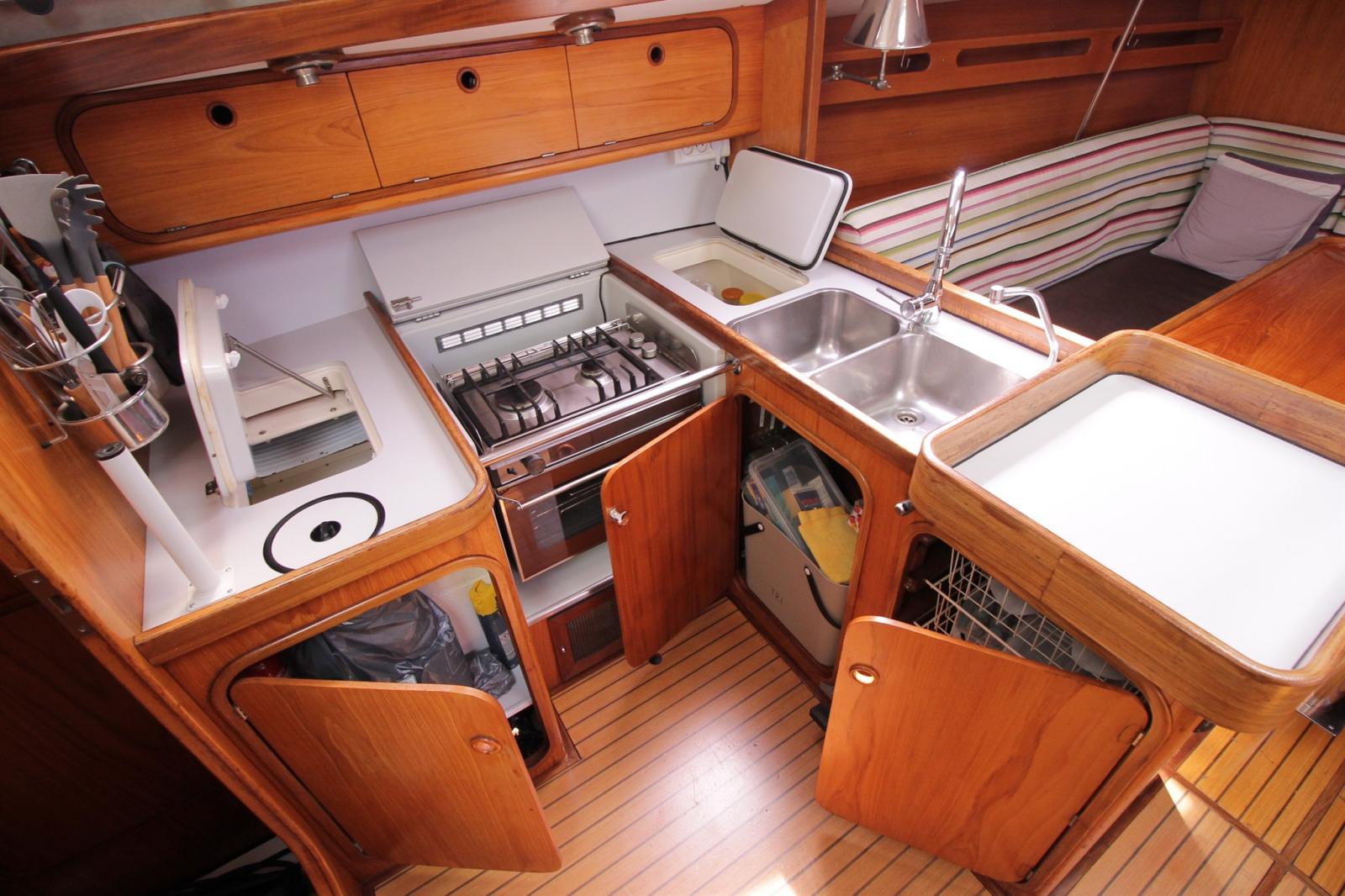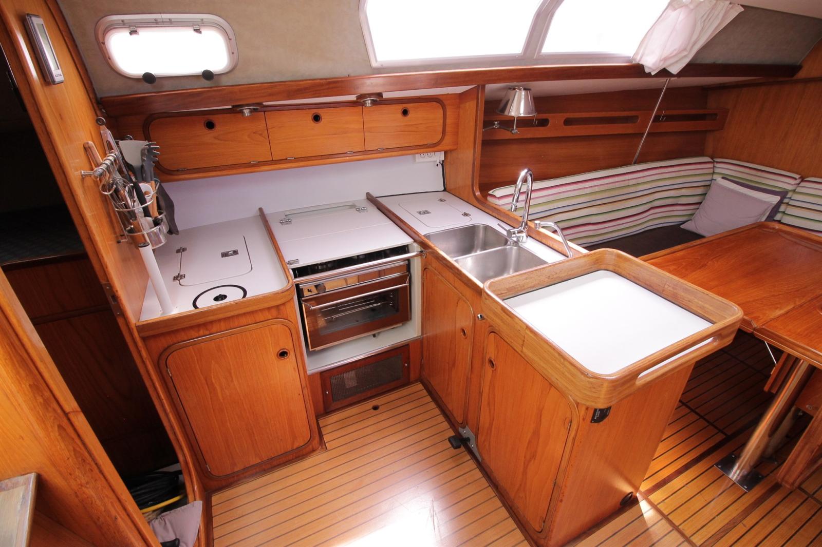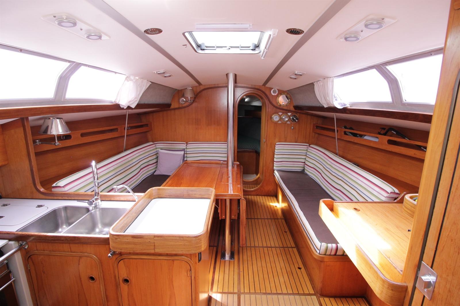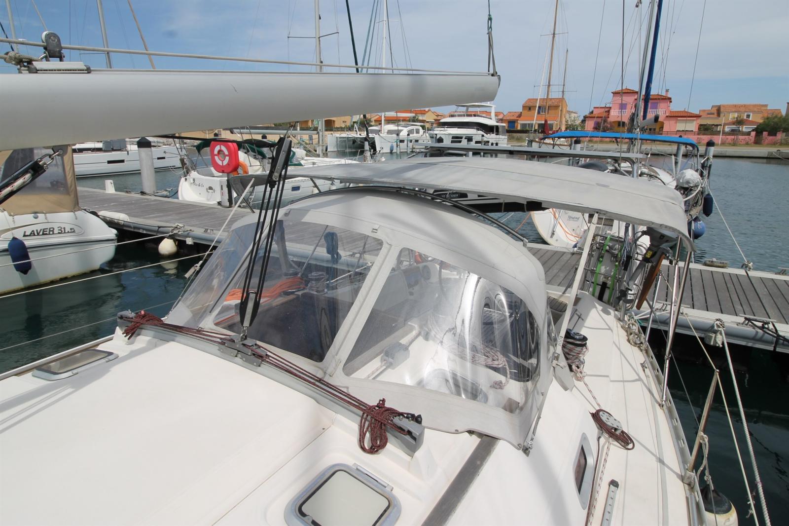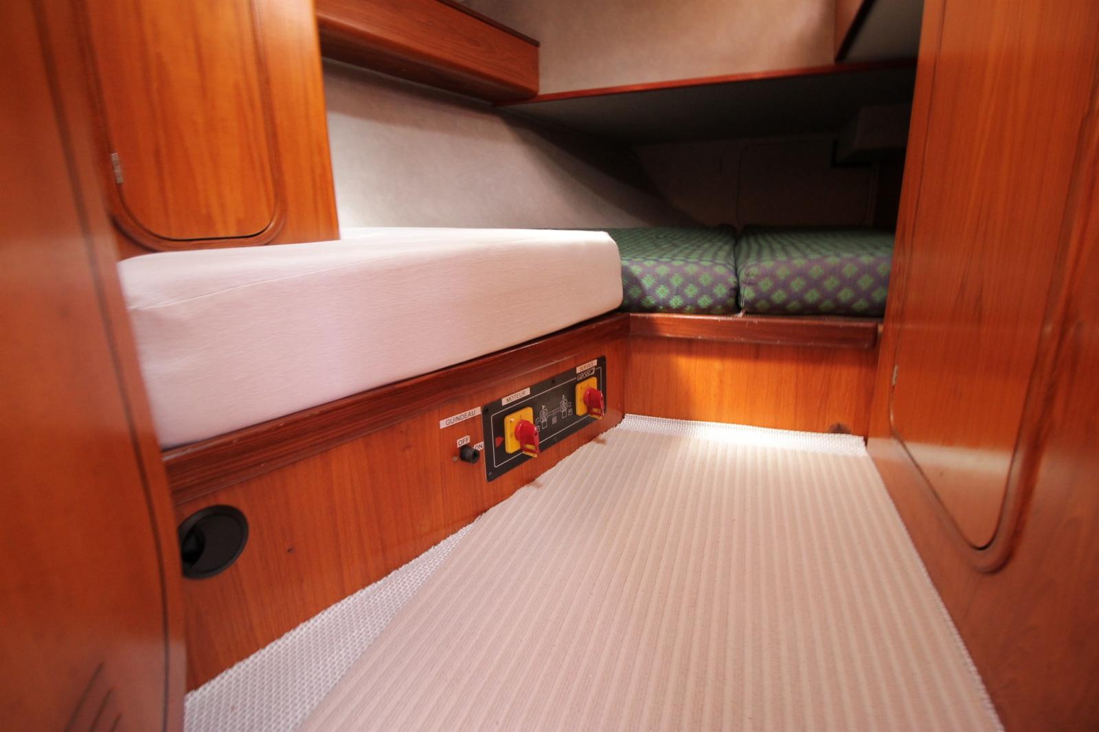 Anchor (ancre charrue avec 70m de chaine en 10 + 2eme mouillage avec ancre CQR), Water pressure pump, 3 Batteries (130ah de 2024), Deck Shower, Tender Crane (sur portique inox), Auxiliary Engine (honda 2,3cv), 2 Solar panels (x100w), Manual Bilge Pump, Shorepower connector, Electric Windlass (1000w chaine de 10 + télécommande), Strand rigging (remplacé en 2025), Outboard Engine Support Bracket, cockpit table, Tender (2m de 2023), 6 Winch (HARKEN).