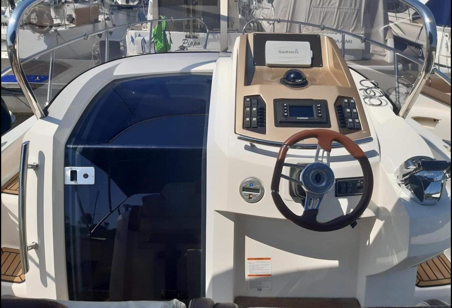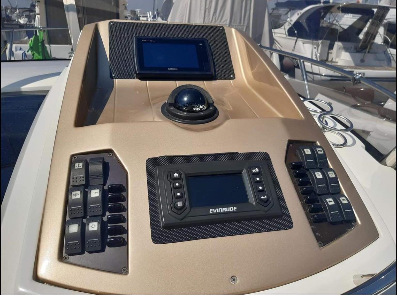 Engine Alarm, 3 Batteries, Teak Side Decks, Special Colour (blu verniciatura 2023), Deck Shower, Hydraulic Flaps, Flaps Indicators, Washbasin in the cockpit, Gangway, Platform, Manual Bilge Pump, Entry door, Teak Cockpit, Shorepower connector, Water harbor connector system, Electric Windlass, swimming ladder, cockpit table, Tender, Horn.