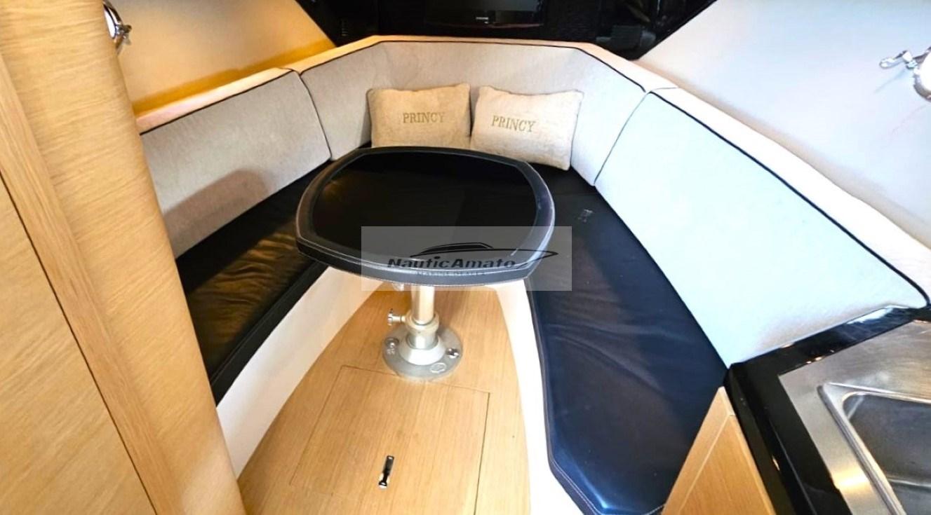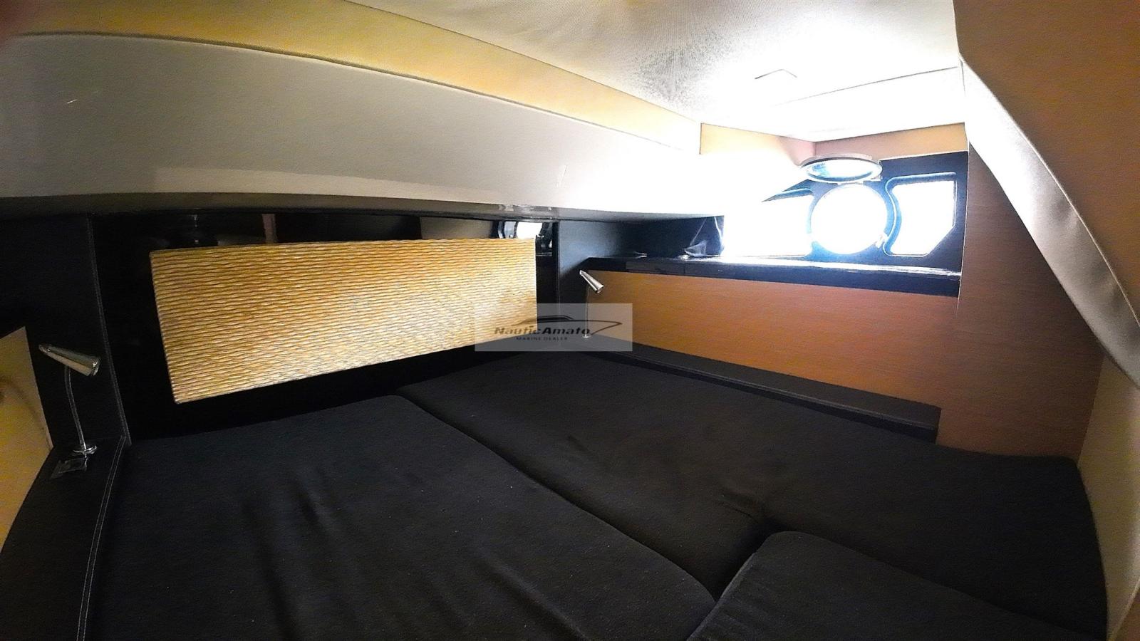 Inside cabin: The living area is well designed, with a generous dinette in the bow that can be converted into a comfortable bed. The internal kitchen is equipped with a stainless steel top, a large refrigerator, an oven, a large sink and a worktop that can be easily replaced with a double stove if desired. The full bathroom has a shower. The interior is finished with high-quality materials, creating a cozy atmosphere. The large side windows of the aft cabin offer brightness and sea views.