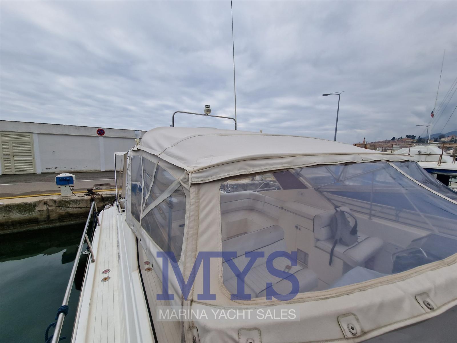 Fume/Gas Detector, Engine Alarm, Bilge Alarm, Anchor (Bruce + 75 mt. catena), Water pressure pump, 8 Batteries (3 mot. 3 serv. 2 inverter), Battery charger (Semiautomatico), Deck Shower (Calda/Fredda), Directional Spotlight, Hydraulic Flaps, Fire Extinguishing System, Flaps Indicators, Anchor Chain Washdown, Courtesy Lights, Gangway (Idraulica), Platform, Automatic Bilge Pump, Manual Bilge Pump, Shorepower connector, Water harbor connector system, Voltage Rectifier, Rollbar, Electric Windlass, swimming ladder, cockpit table, Living Room Foldable Table, Tender (3 mt), Horn, Winch Electric (a prua).