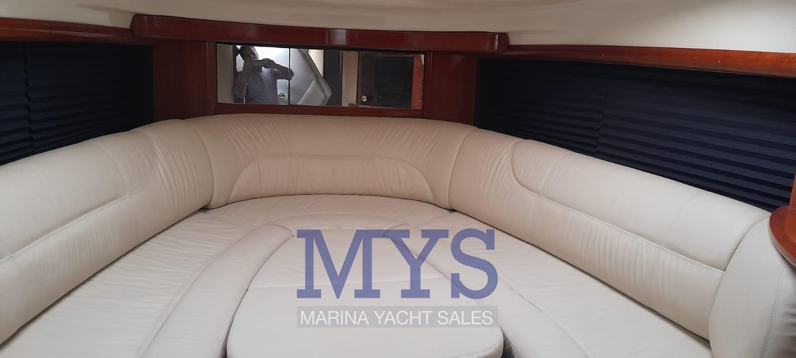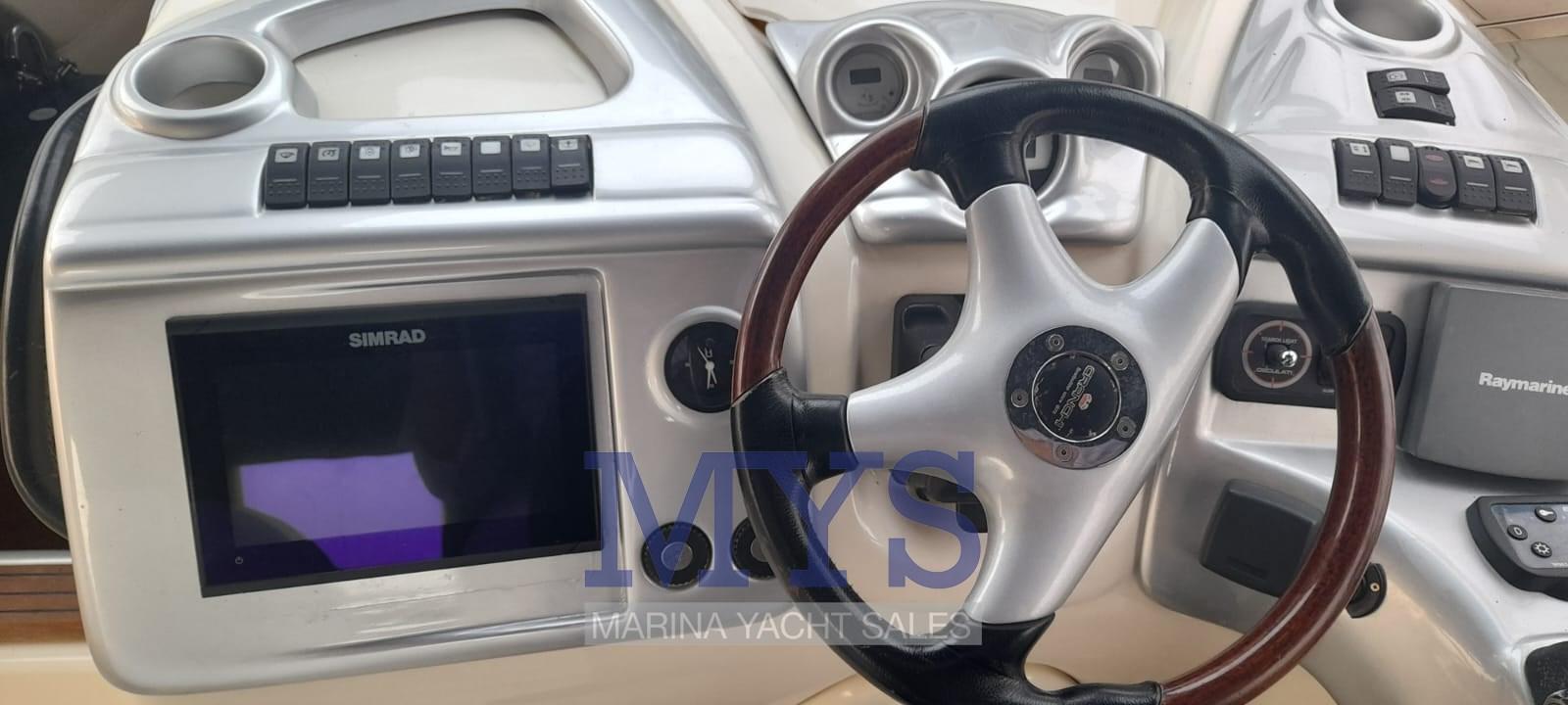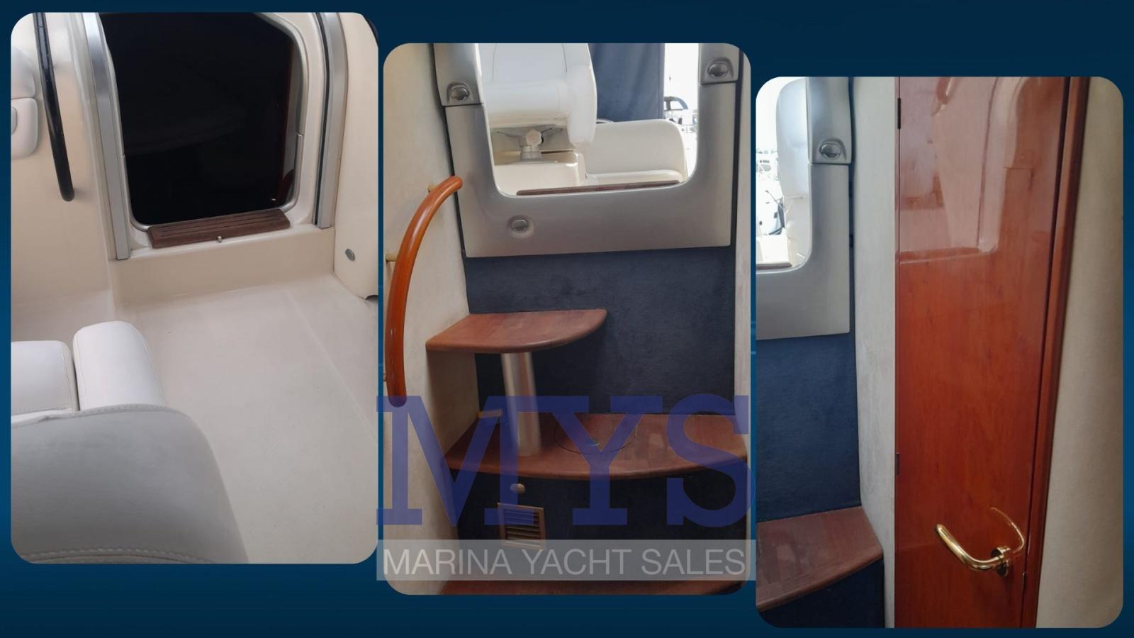 Engine Alarm, Bilge Alarm, Anchor (+ 100 mt di catena), Electric Engine Compartment Opening, Water pressure pump, Batteries (3 x 100 Ah), Deck Shower, Directional Spotlight, Electric Flaps, Tender Garage, Washbasin in the cockpit, Courtesy Lights, Gangway, Platform, Automatic Bilge Pump, Manual Bilge Pump, Entry door, Teak Cockpit, Shorepower connector, Rollbar, Electric Windlass, swimming ladder, cockpit table, Living Room Foldable Table, Horn.