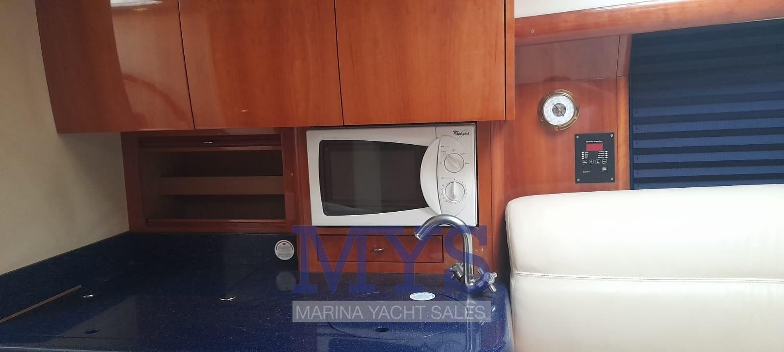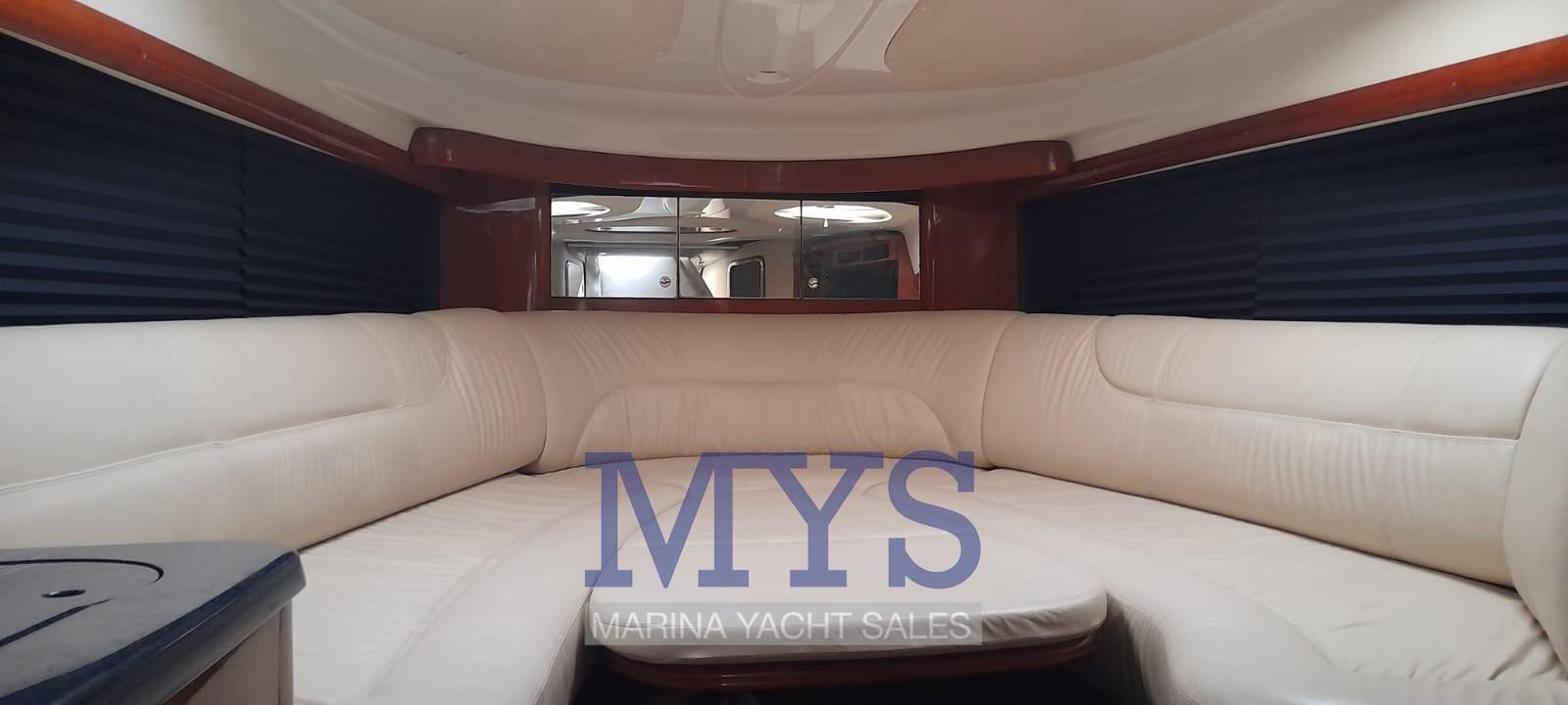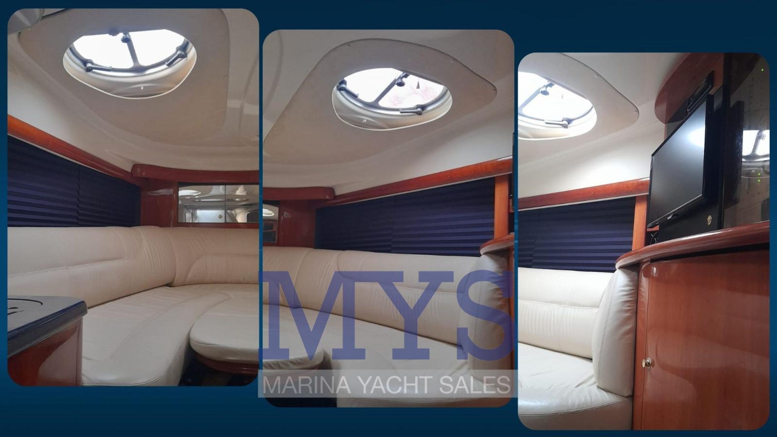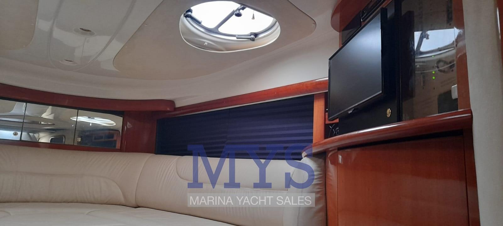 Engine Alarm, Bilge Alarm, Anchor (+ 100 mt di catena), Electric Engine Compartment Opening, Water pressure pump, Batteries (3 x 100 Ah), Deck Shower, Directional Spotlight, Electric Flaps, Tender Garage, Washbasin in the cockpit, Courtesy Lights, Gangway, Platform, Automatic Bilge Pump, Manual Bilge Pump, Entry door, Teak Cockpit, Shorepower connector, Rollbar, Electric Windlass, swimming ladder, cockpit table, Living Room Foldable Table, Horn.