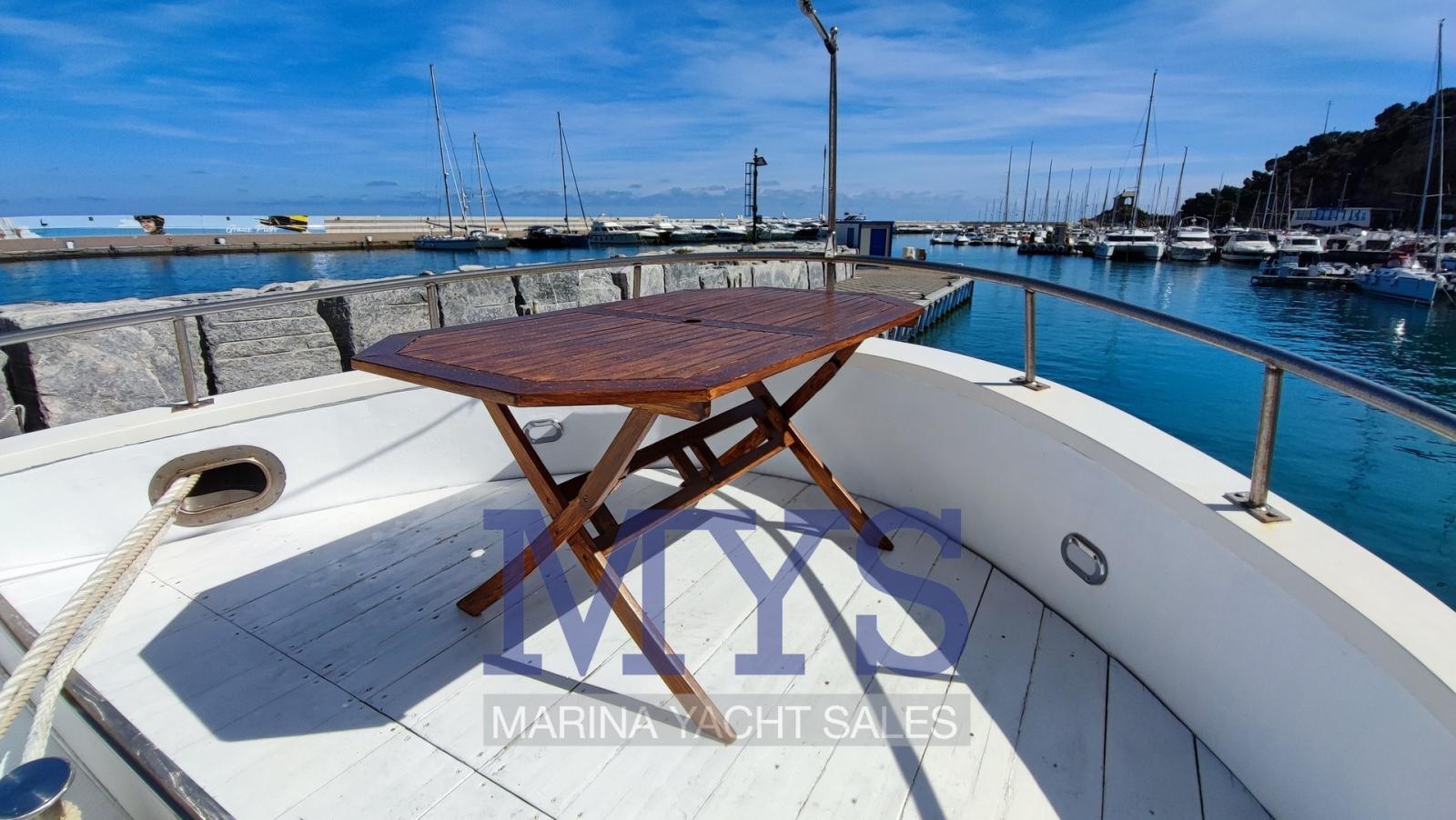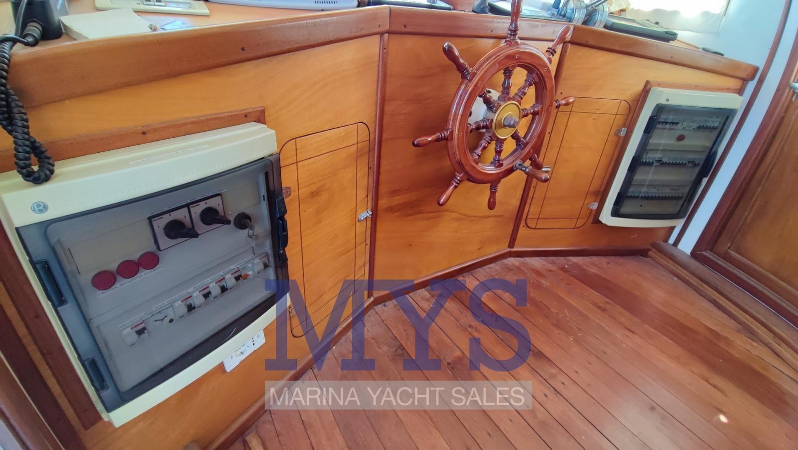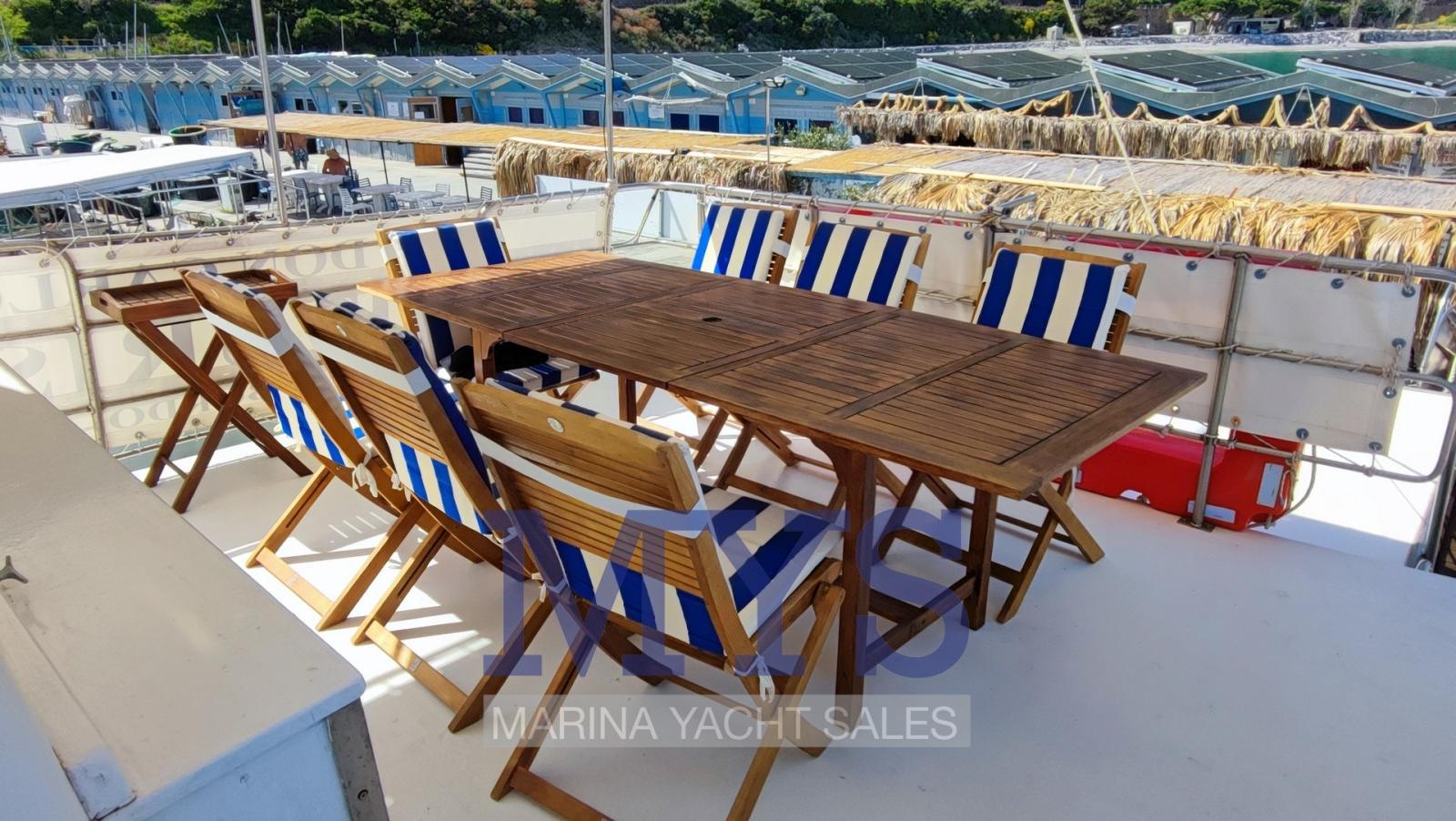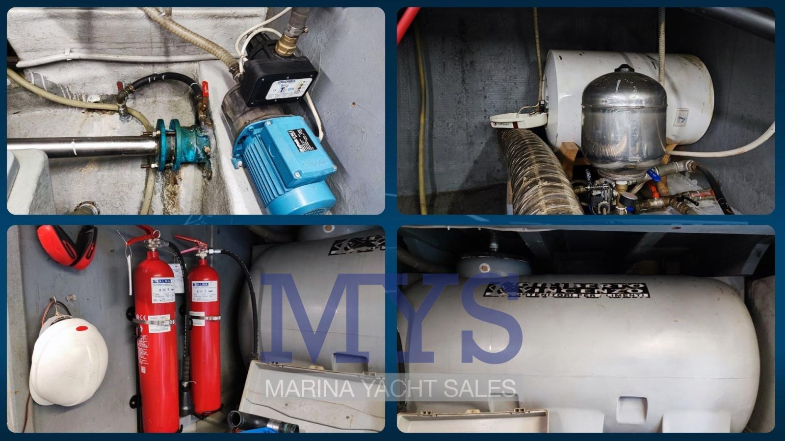 Engine Alarm, Bilge Alarm, Anchor (CQR + 100 mt cima + 2 mt catena), Water pressure pump, Batteries (6x 180 Ah), Draining System, Deck Shower, Twin Steering, 2 Crane, Washbasin in the cockpit, Courtesy Lights, Gangway, Automatic Bilge Pump, Manual Bilge Pump, Entry door, Side door, Shorepower connector, Water harbor connector system, swimming ladder, 2 cockpit table (+ tavolo a prua), Horn.