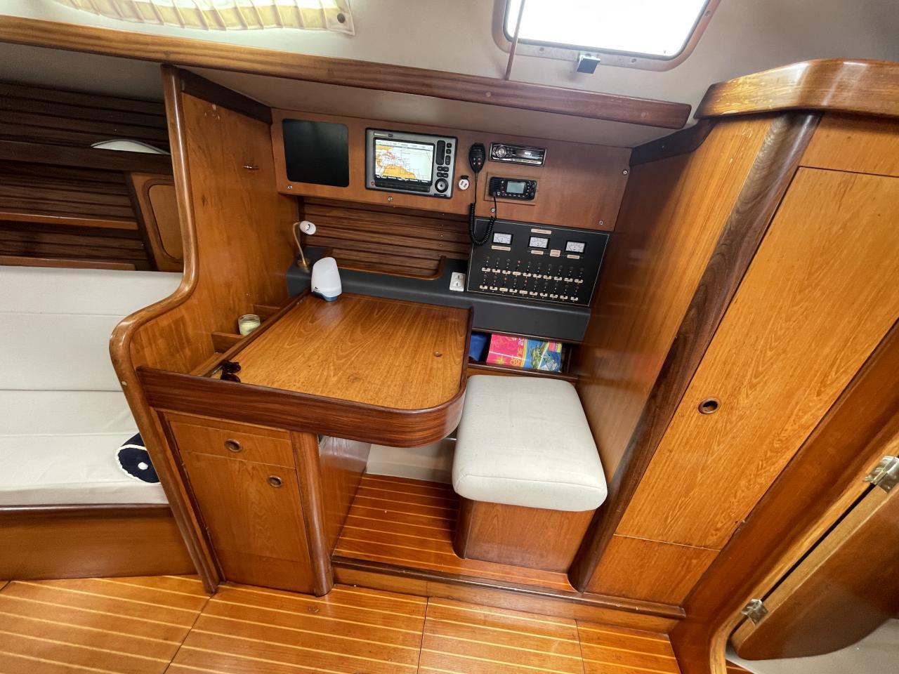 Large chart table on the starboard side with electronics