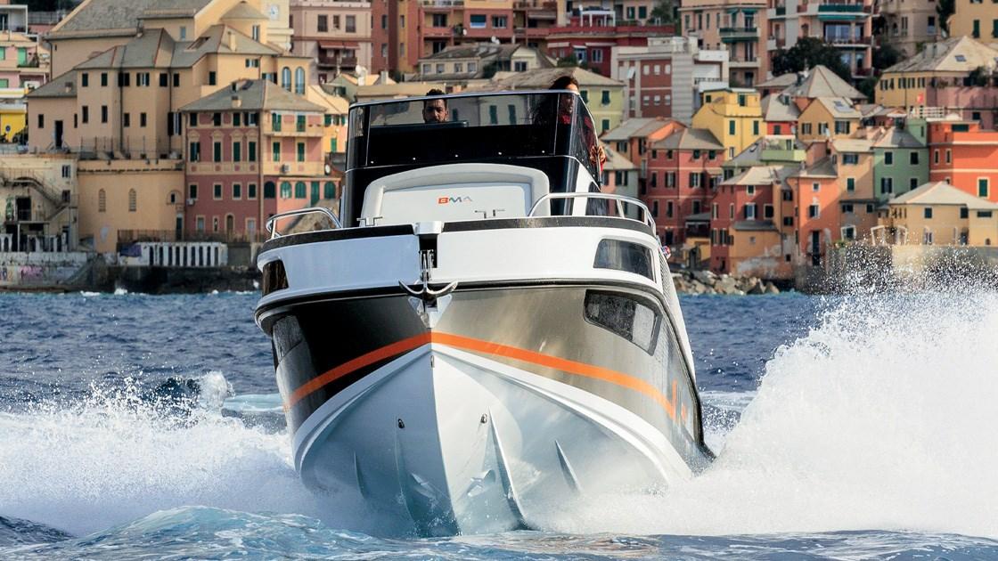 BMA X 299 stainless steel bollards cabin compass suite with complete Top Class furnishings special total extension hull Perlage painted dashboard, sunbathing cushions in the bow, stove, external shower system, system for service battery, stainless steel roller in the bow, space-saving aft bench