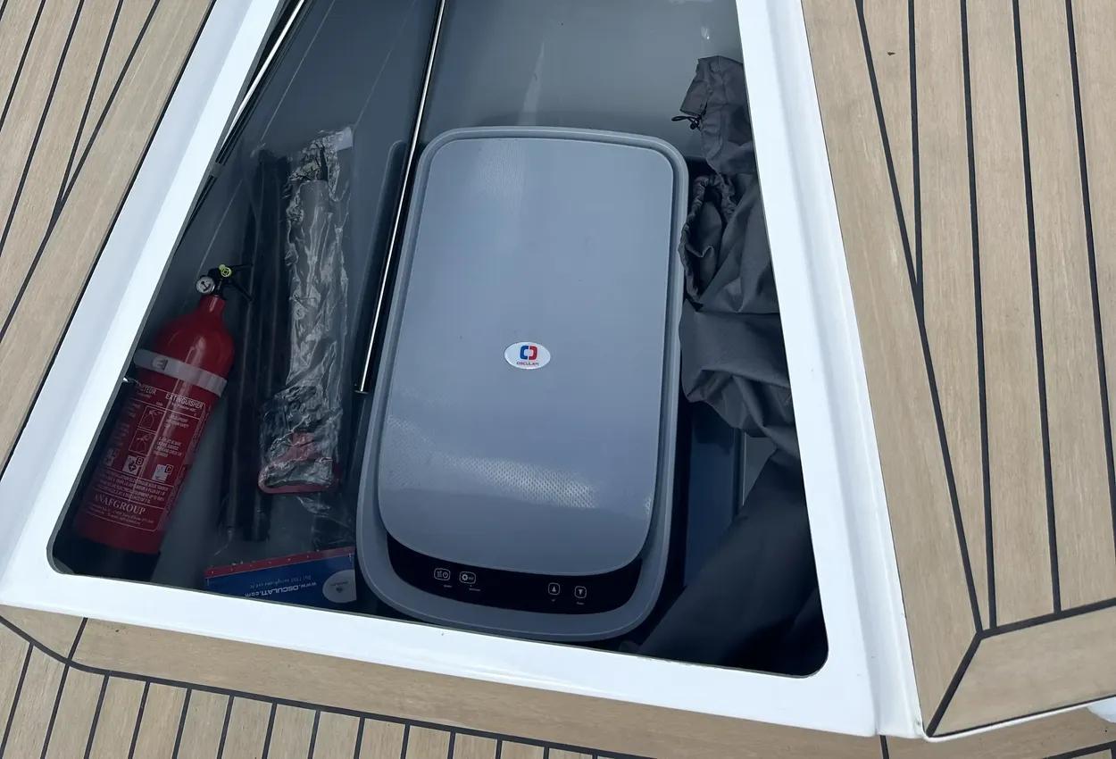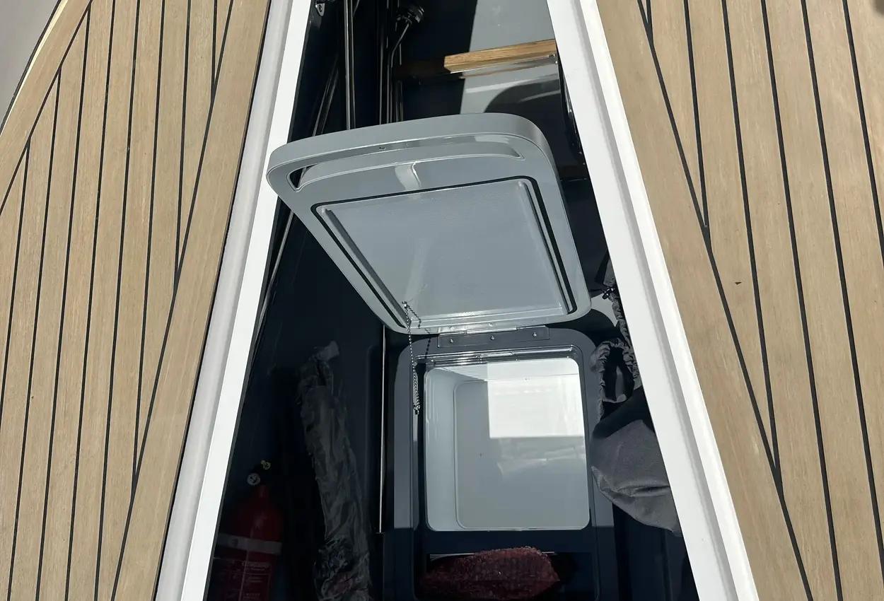 Source 22 is equipped with two 1000 L storage rooms with massive space for watersport equipment and other things you need for your trip. As a part of the big storage rooms, an optional transportable cooler box gives the flexibility to carry cold beverages from your home directly to the boat and then further to the beach or other destinations you are heading to.