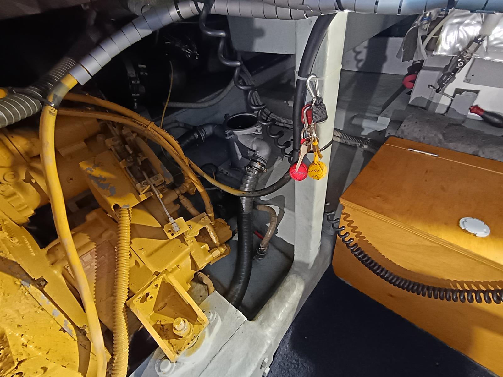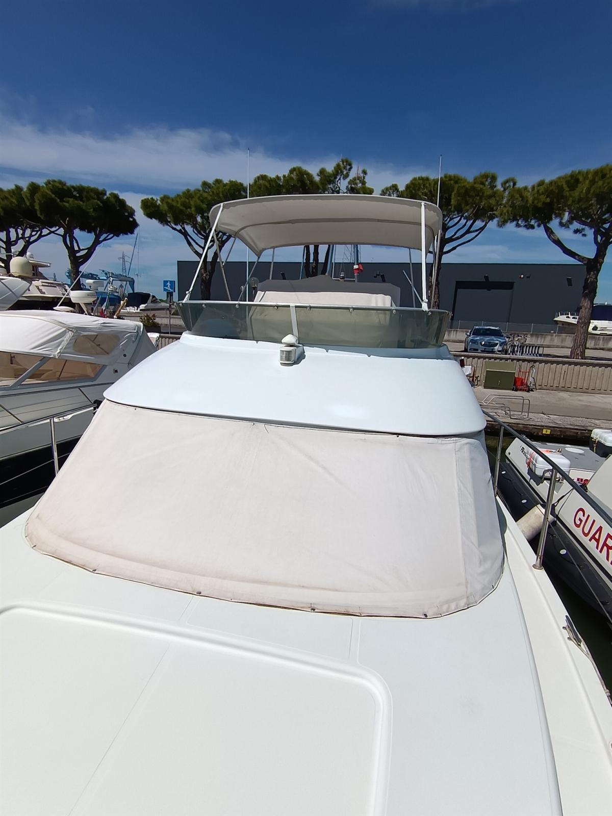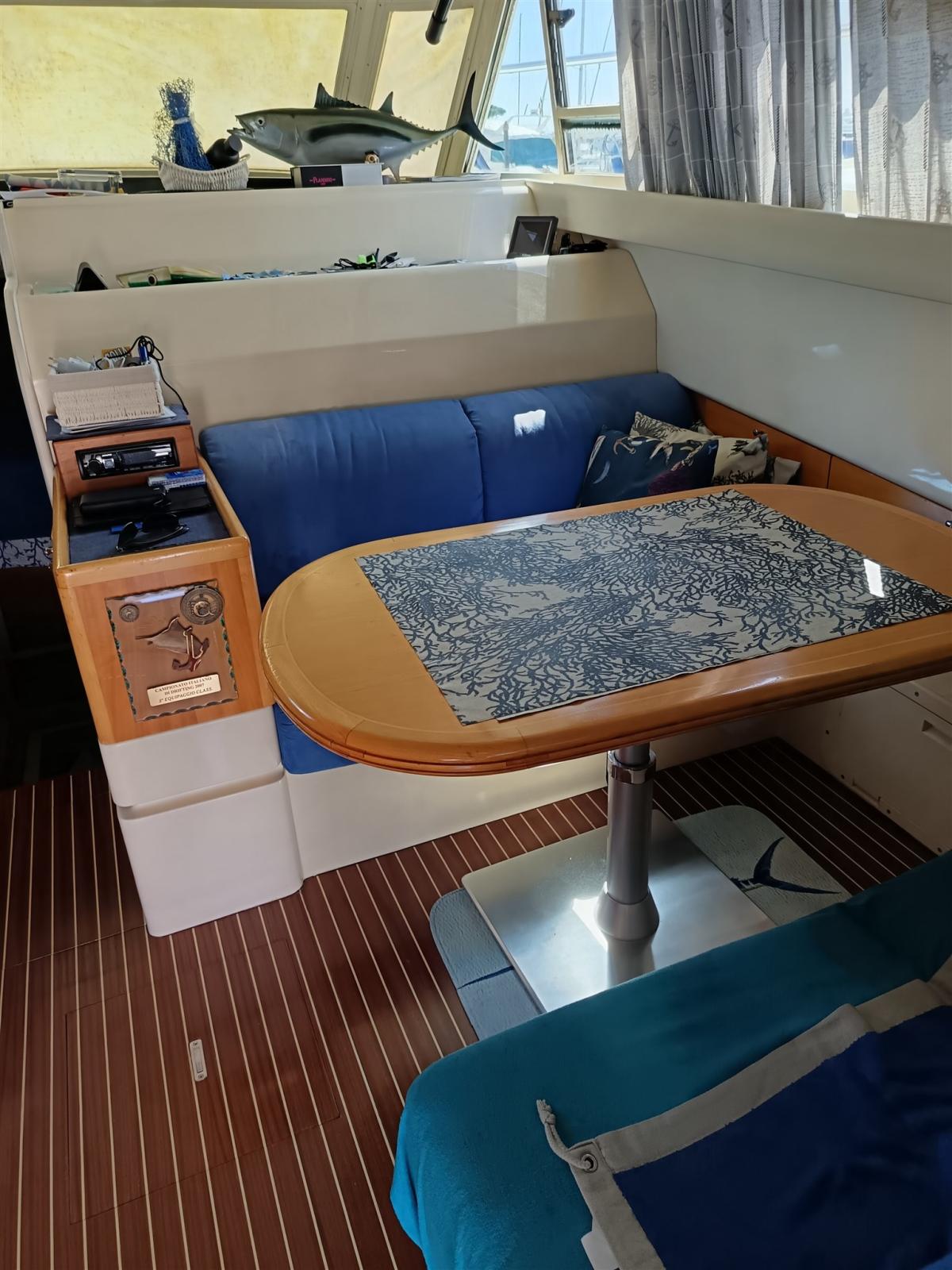 Engine Alarm, Bilge Alarm, Water pressure pump, 3 Batteries, Deck Shower, Headlights fixed on the stem, Directional Spotlight, Hydraulic Flaps, Fire Extinguishing System, Anchor Chain Washdown, Courtesy Lights, Underwater lights, Gangway (Idraulica), Platform, Automatic Bilge Pump, Entry door, Teak Cockpit, Shorepower connector, Water harbor connector system, Electric Windlass, swimming ladder, Waste Water Purifier System, Living Room Foldable Table, Horn.