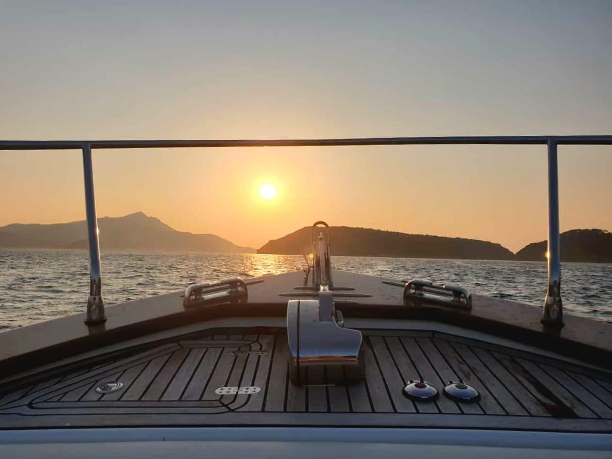 Thanks to the presence of a comfortable "U" shaped sofa and a table, the aft part is configured as a comfortable convivial area where you can enjoy sailing. The bow area, which is easily located, well protected by a stainless steel handrail, houses the other and comfortable sunbathing area.