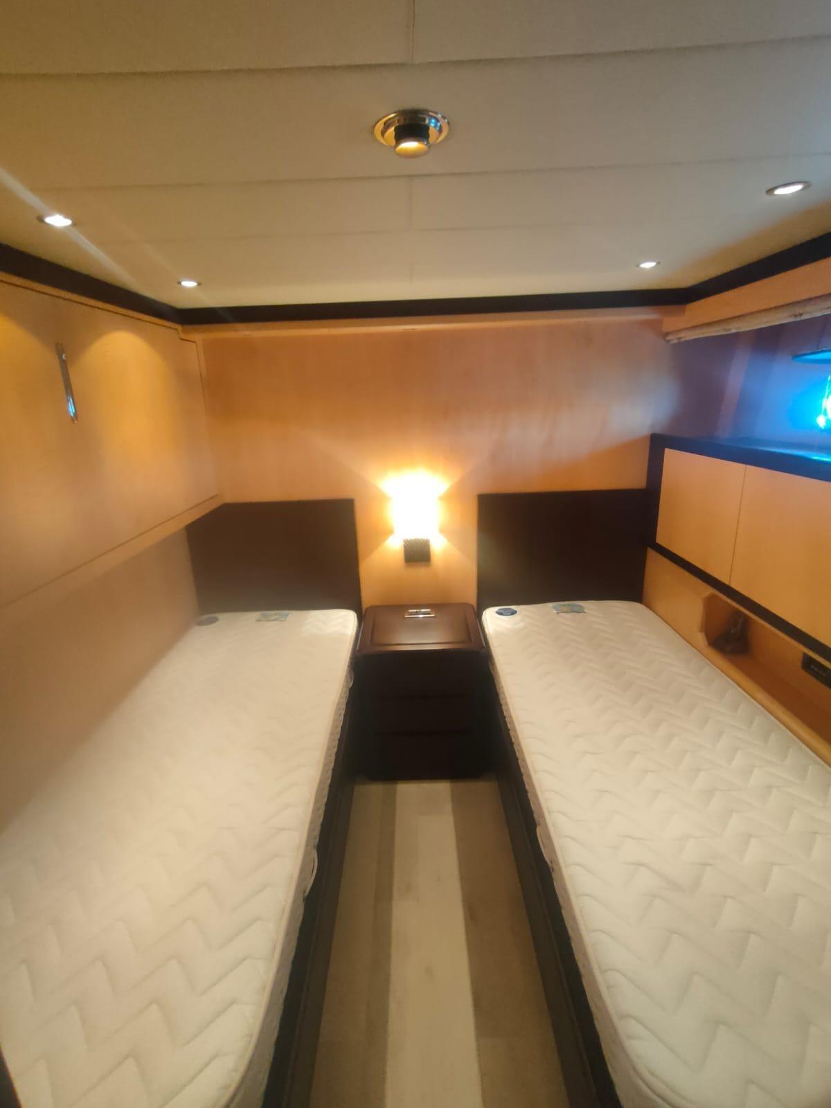 Fume/Gas Detector, Engine Alarm, Bilge Alarm, Alternator, Water pressure pump, Draining System, Teak Side Decks, Deck Shower, Directional Spotlight, Hydraulic Flaps, Tender Garage, Hard top, Fire Extinguishing System, Flaps Indicators, Anchor Chain Washdown, Washbasin in the cockpit, Courtesy Lights, Underwater lights, Gangway, Platform, Automatic Bilge Pump, Manual Bilge Pump, Teak deck, Teak Cockpit, Shorepower connector, Water harbor connector system, Voltage Rectifier, Electric Windlass, swimming ladder, Saddles for tender, cockpit table, Tender, Horn, Stern Winches.