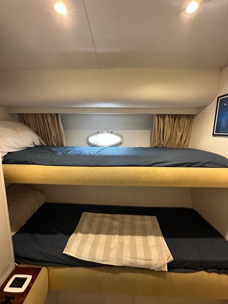 Master cabin with double bed and bathroom - guest cabin with two flat beds and bathroom - guest cabin with two bunk beds and bathroom.