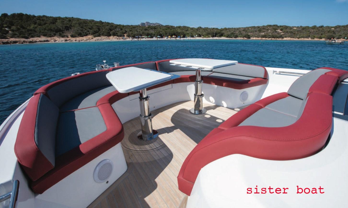 Joystick - Dynamica 6 kW generator - air conditioning - carbon t-top - cockpit galley cabinet with sink, fridge/freezer, two-burner electric hob - bow dinette convertible into a sundeck - stern dinette convertible into a sundeck - inverter - battery charger - deck covered with synthetic teak - stern shower - manual gangway - large aft storage locker - TV antenna - LCD TV.