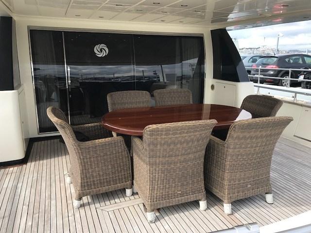Engine Alarm, Water pressure pump, Draining System, Teak Side Decks, Deck Shower, Twin Steering, Hydraulic Flaps, Davits for tender on fly, Fire Extinguishing System, Flaps Indicators, Courtesy Lights, Gangway, Platform, Manual Bilge Pump, Entry door, Side door, Teak Cockpit, Shorepower connector, Water harbor connector system, Rollbar, Electric Windlass, swimming ladder, cockpit table, guard rails with gates, Horn, Stern Winches.