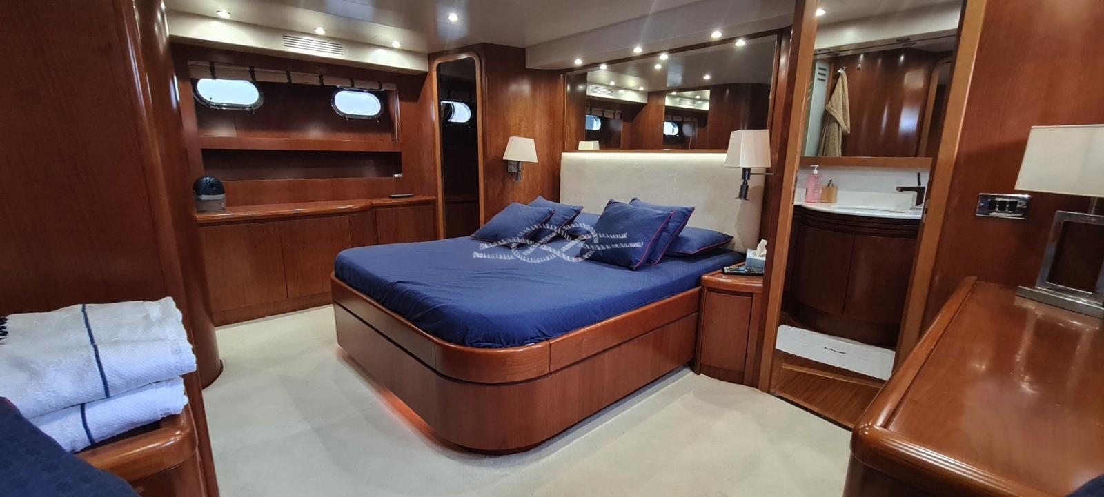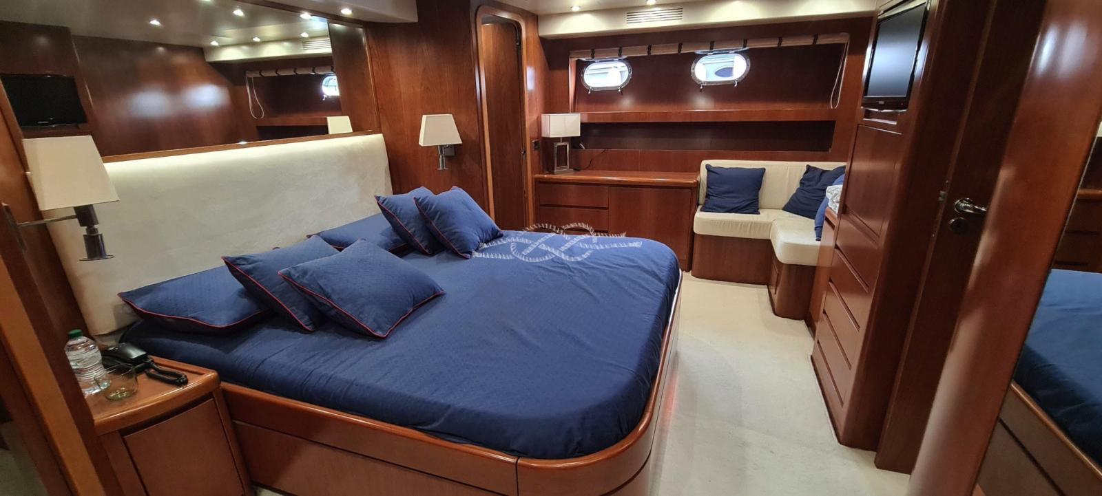 Saloon with L-shaped sofa and dining table - day toilet - bridge with dinette - galley - master cabin with double bed, bathroom with separate shower, walk-in closet - VIP cabin with double bed, bathroom with separate shower, wardrobe - guest cabin with French bed, pullman bed, bathroom and separate shower - guest cabin with flat beds, pullman bed, bathroom with separate shower.