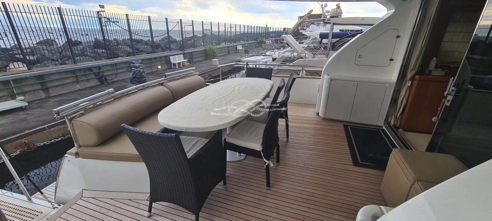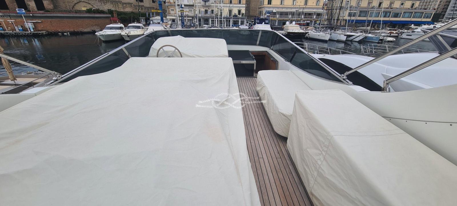 Engine Alarm, Bilge Alarm, Water pressure pump, 22 Batteries, Teak Side Decks, Deck Shower, Twin Steering, Secondary Propeller, Directional Spotlight, Hydraulic Flaps, Davits for tender on fly, Fire Extinguishing System, Anchor Chain Washdown, Courtesy Lights, Gangway (elettroidraulica), Platform, Automatic Bilge Pump, Entry door, Side door, Teak Cockpit, Shorepower connector, Water harbor connector system, Rollbar, Electric Windlass, swimming ladder, cockpit table, Tender (Zodiac Yacht Line 3), guard rails with gates, Horn, Stern Winches.