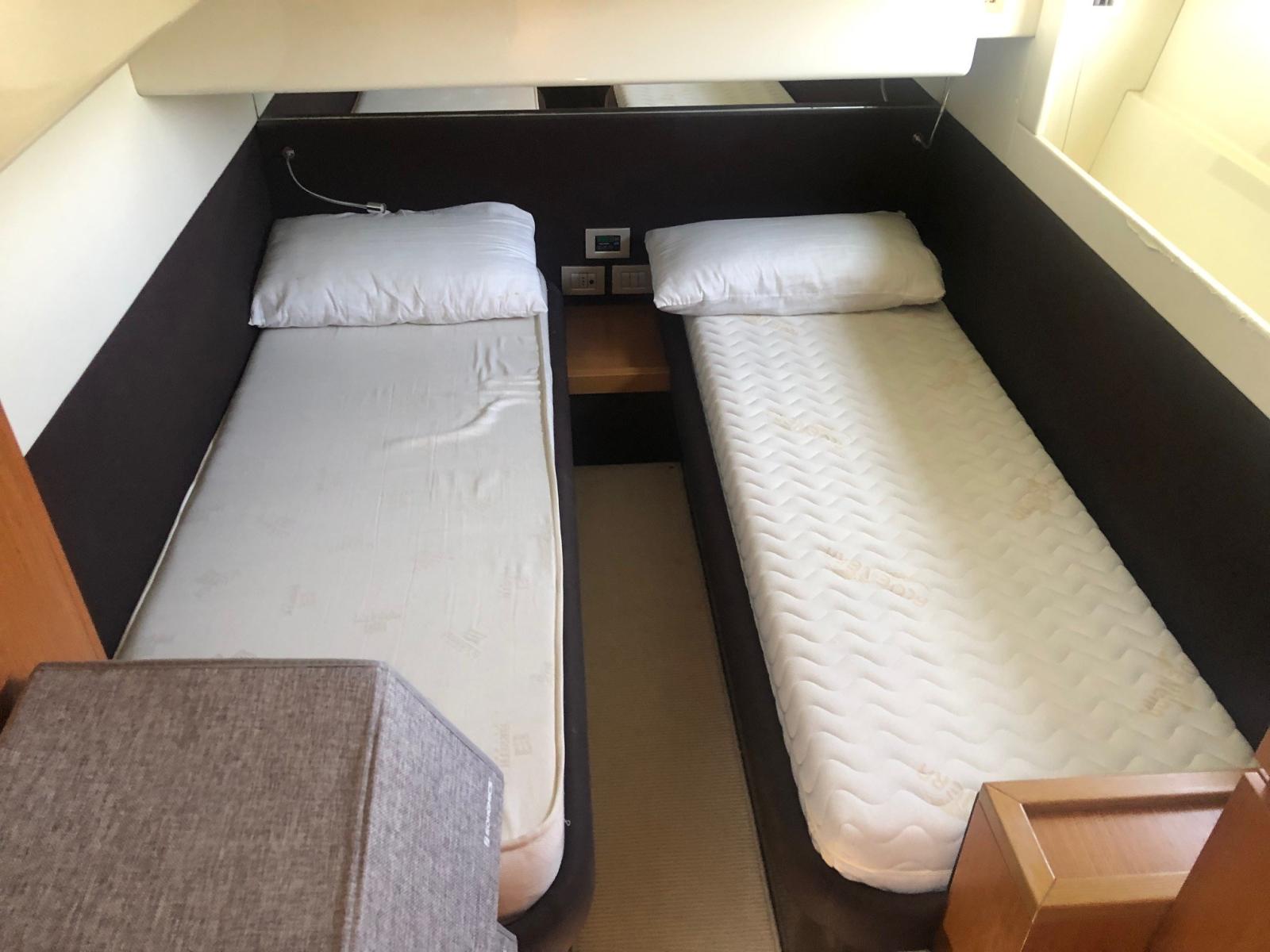 Master cabin with double bed and bathroom - guest cabin with two beds on the floor - guest cabin with two beds on the floor - guest bathroom.