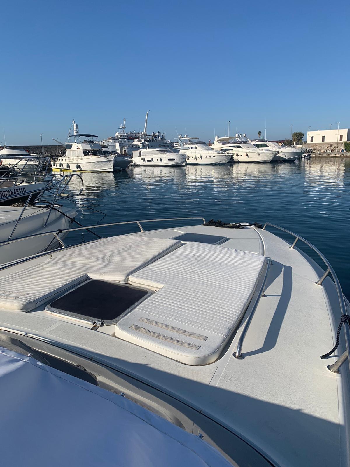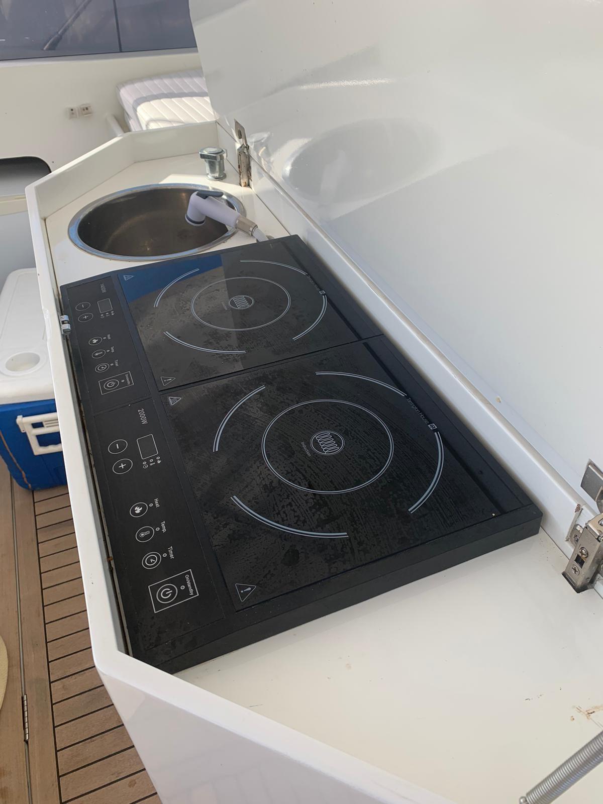 Electro-hydraulic gangway - outdoor cabinet with sink and electric two-burner hob - fridge - electric bow thruster - tender.