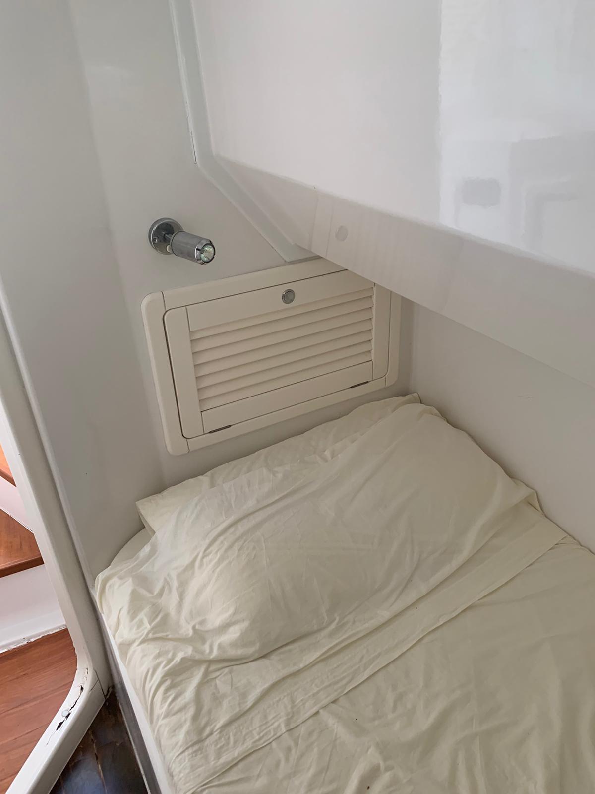 Master cabin with double bed - guest cabin with two crossed beds - bathroom.