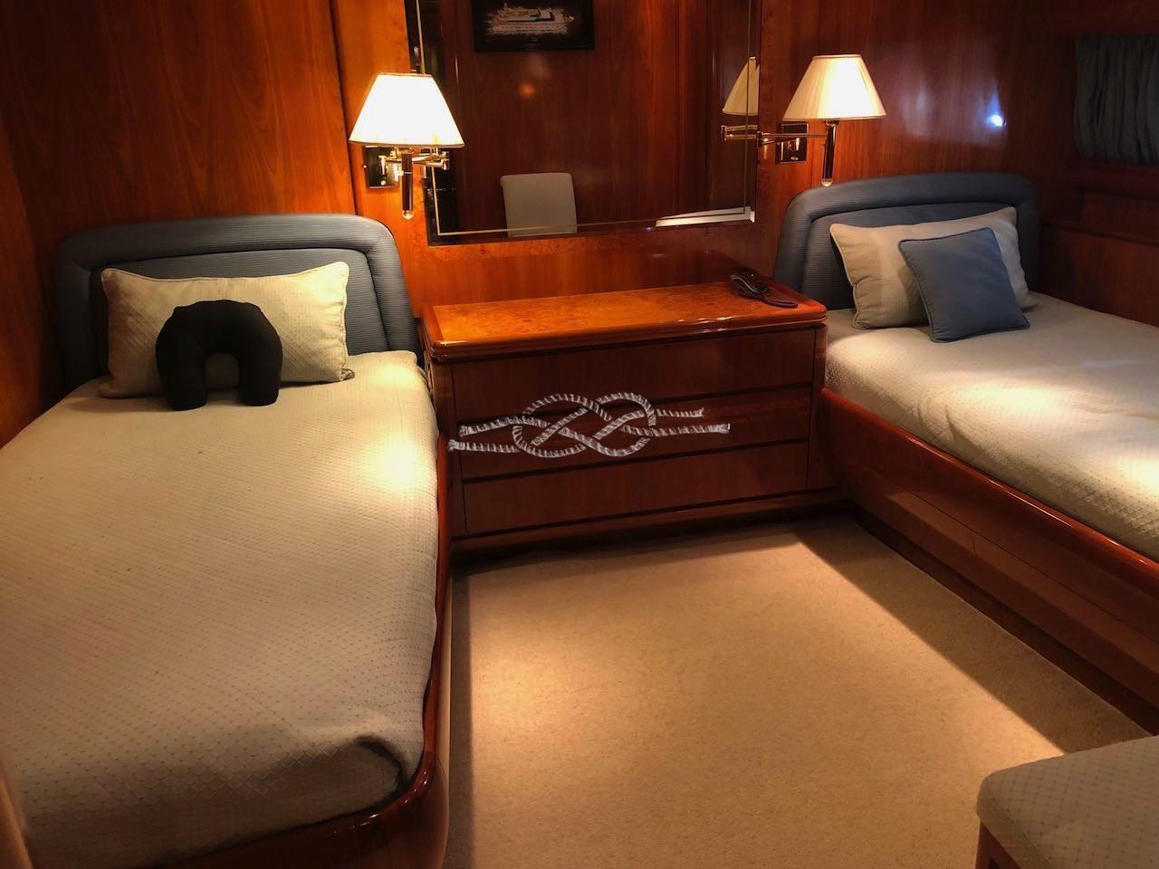 Forward crew cabin with two beds and bathroom - aft crew cabin with single bed and bathroom.