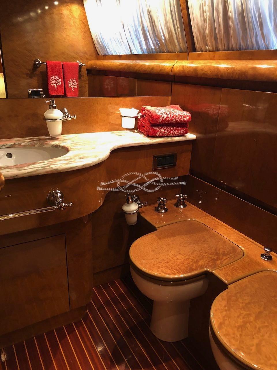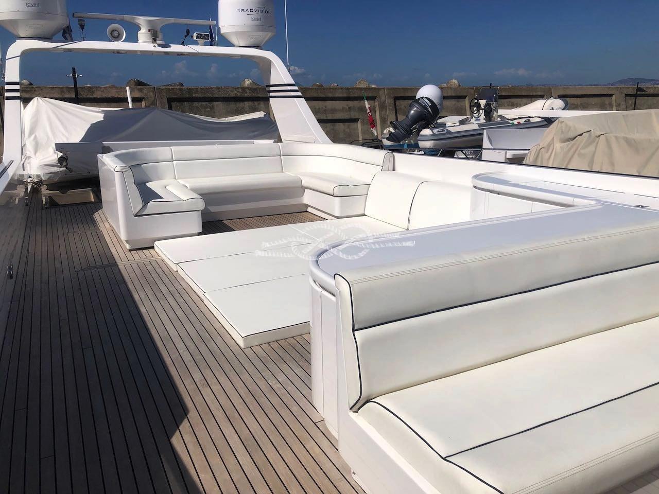 Engine Alarm, Bilge Alarm, Water pressure pump, 23 Batteries, Draining System, Teak Side Decks, Deck Shower, Twin Steering, Bow Thruster (idraulica), Hydraulic Flaps, Davits for tender on fly, Fire Extinguishing System, Flaps Indicators, Underwater lights, Gangway, Platform, Entry door, Side door, Teak Cockpit, Shorepower connector, Water harbor connector system, Rollbar, Electric Windlass, swimming ladder, Saddles for tender, cockpit table, Tender (con fuoribordo), Horn, Stern Winches.