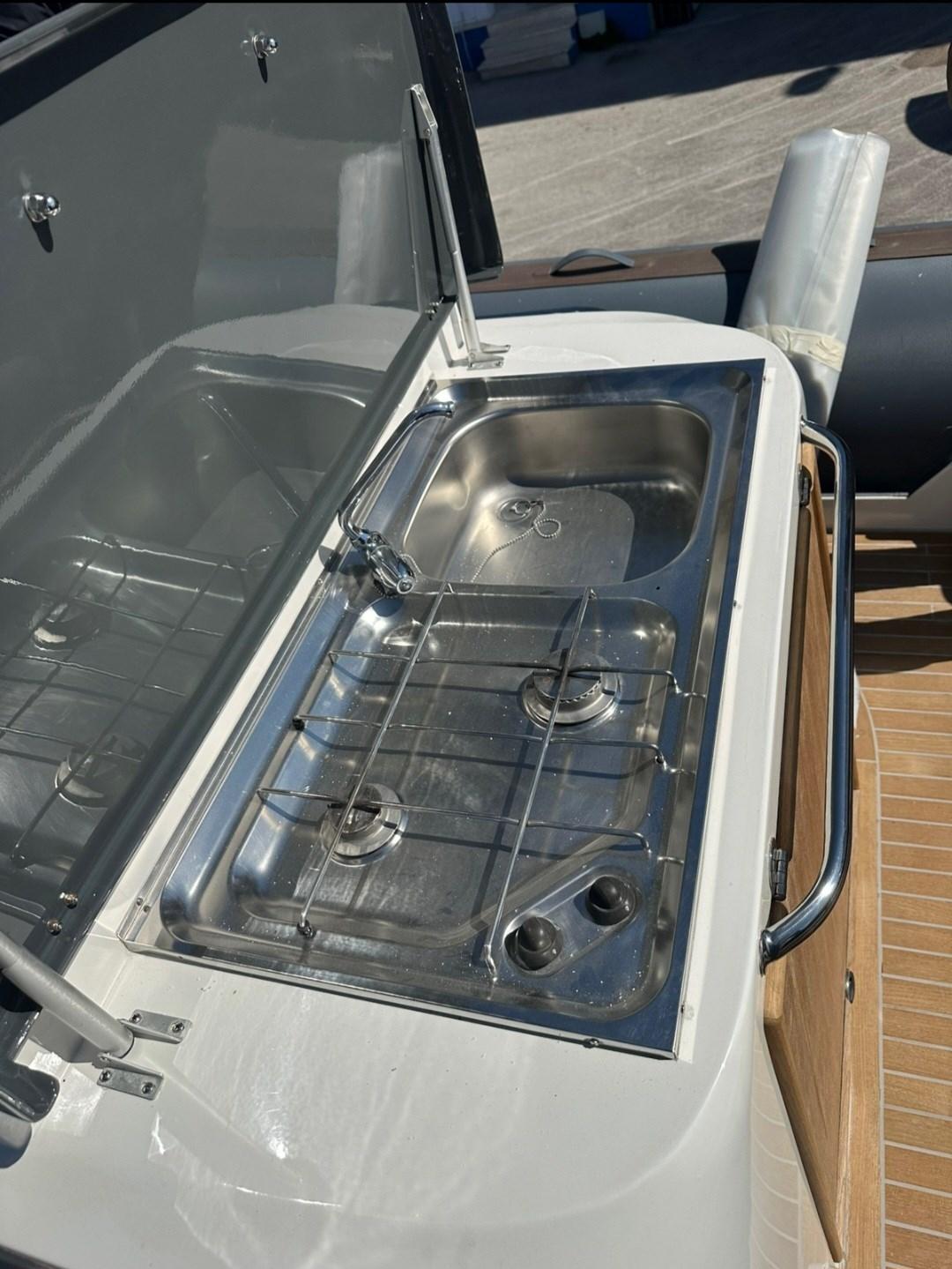 Electric bow thruster - fridge - sink - 2-burner gas hob - windlass winch - underwater lights - folding stern table - Fusion stereo - awning with carbon poles for the bow - compressor for tubulars - shore power socket - battery charger.