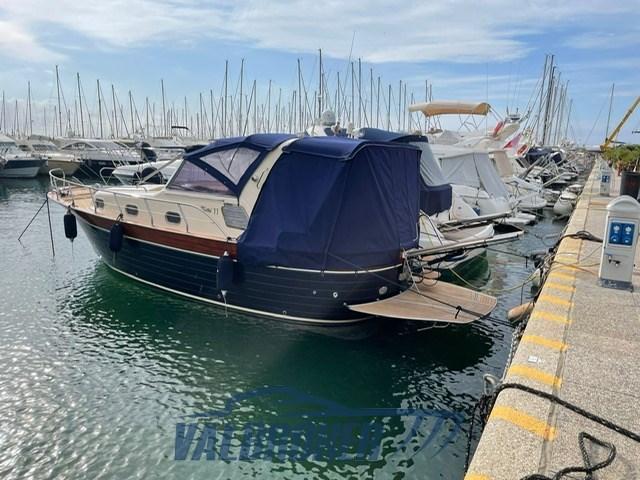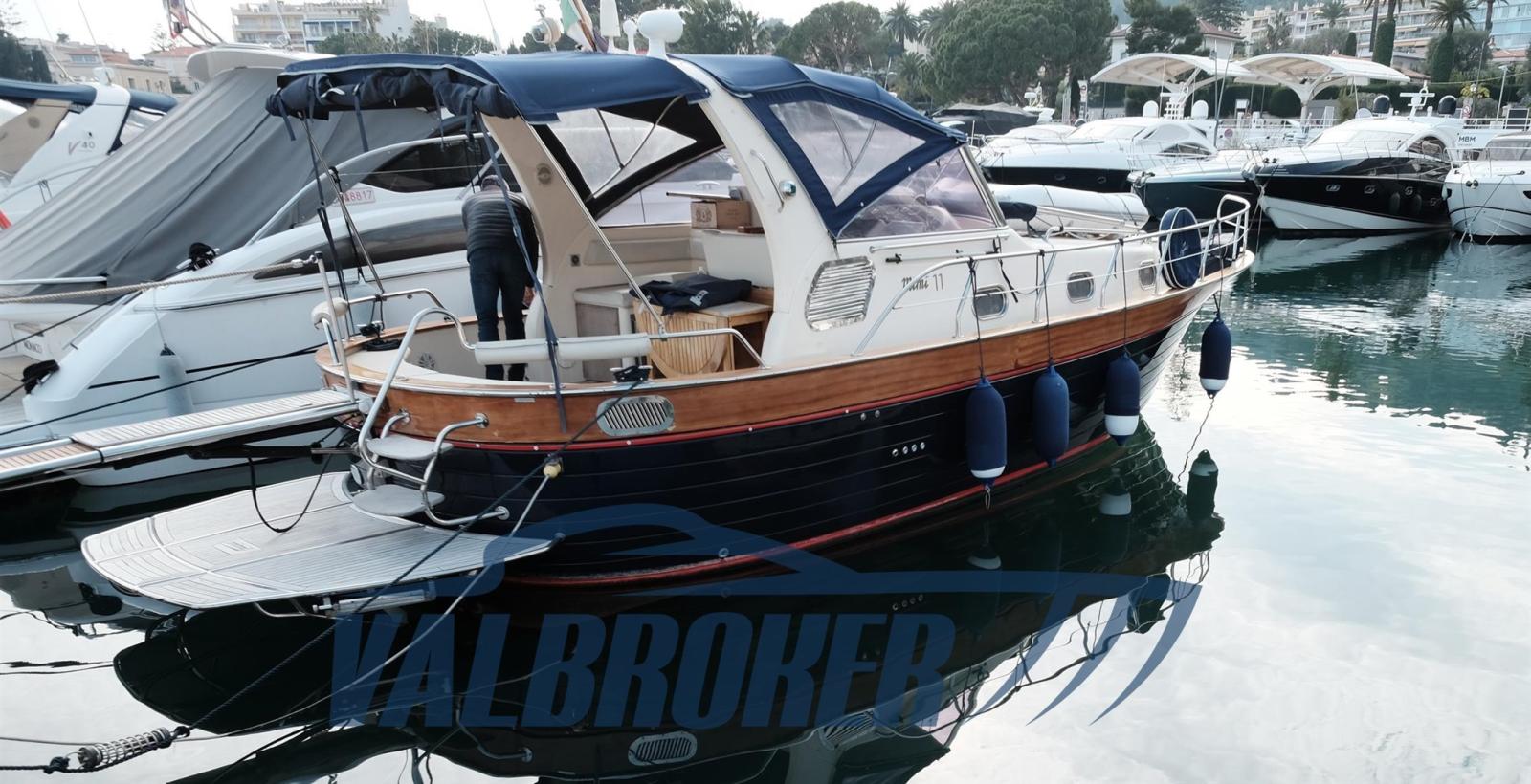 Boat in classic Mediterranean style, Mimi Libeccio 11, 2x300HP VM MD 706 LH engines, visible on the French Riviera. Forward cabin with door, galley and dinette convertible into a double bed. Bathroom with shower. Large cockpit.