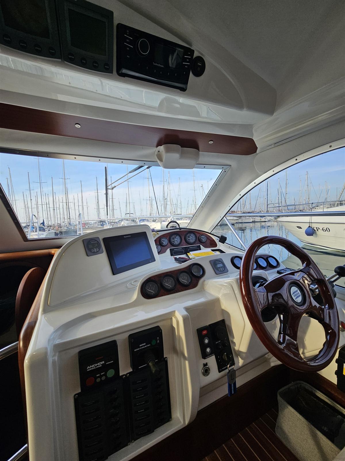 Rudder angle indicator, Radar Antenna, On-Board Computer, Chain counter, Display, GPS (Raymarine 11" Touch).