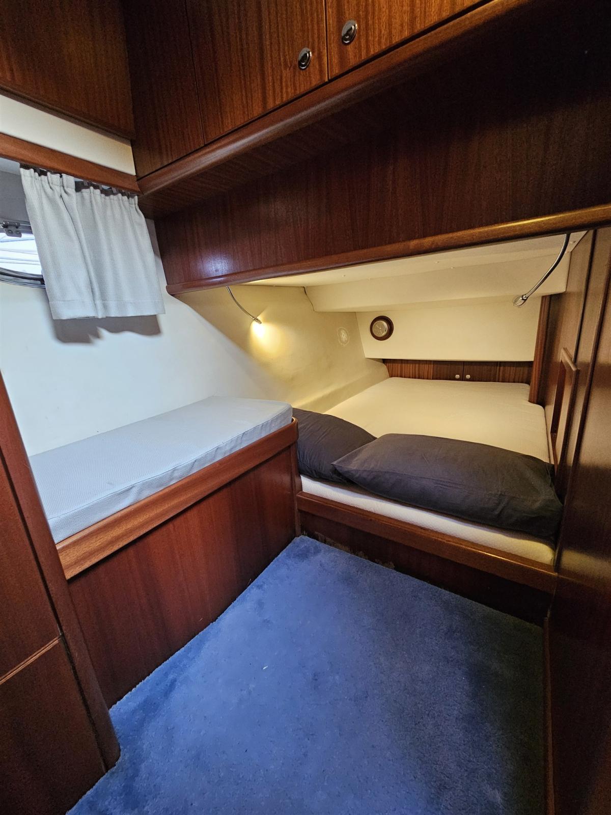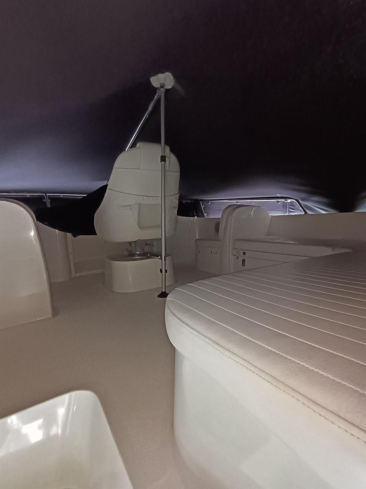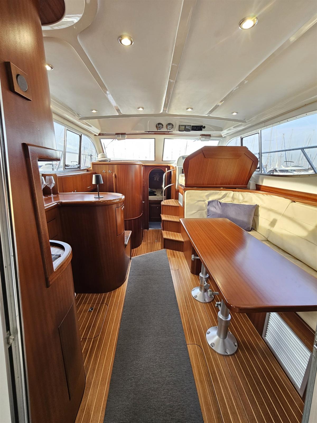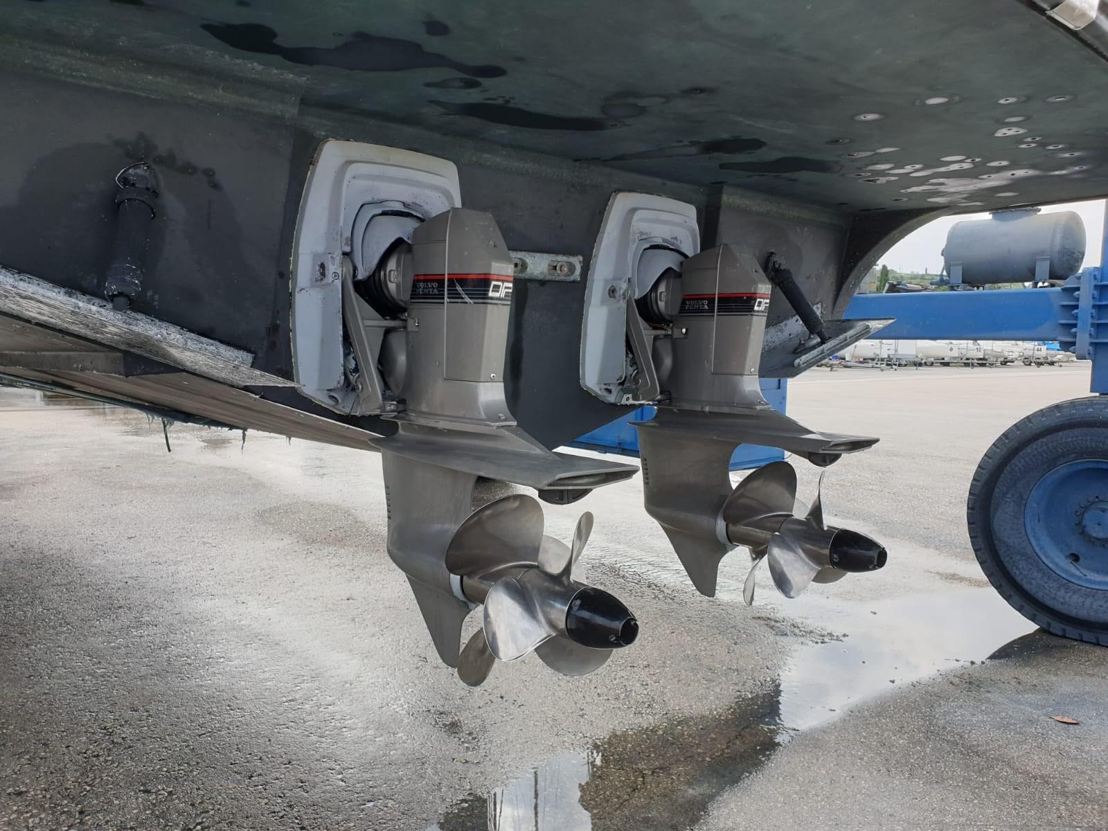 Engine Alarm, Bilge Alarm, Water pressure pump, 3 Batteries, Deck Shower, Directional Spotlight, Hydraulic Flaps, Fire Extinguishing System, Flaps Indicators, Anchor Chain Washdown, Courtesy Lights, Gangway (Idraulica), Platform, Automatic Bilge Pump, Teak Cockpit, Shorepower connector, Water harbor connector system, Rollbar, Electric Windlass, swimming ladder, Waste Water Purifier System, Living Room Foldable Table, Horn.