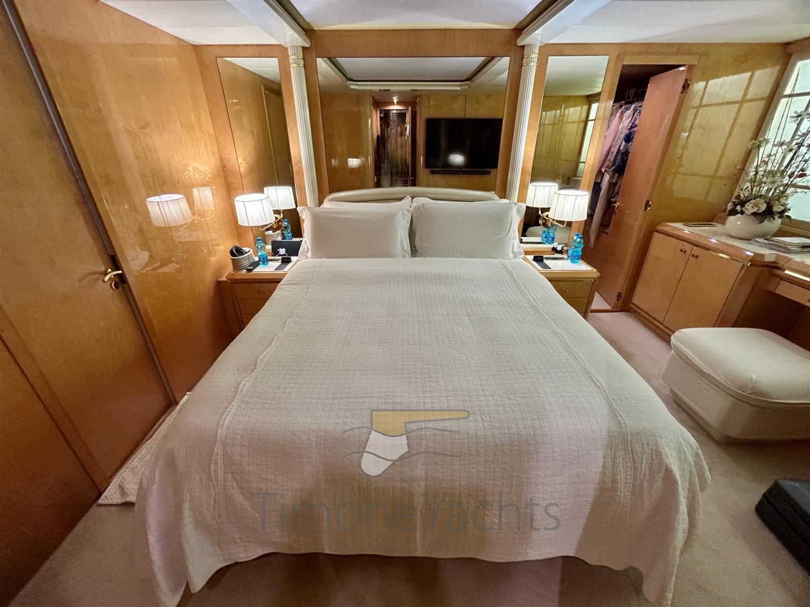 This 1995 Mangusta 92 is surprisingly still in her first Owner's hands. And during my inspection it was quite easy for me to understand why he kept the unit so long. We're in front of a pure open boat, with the bliss of stern sunpads and airy cockpit, naturally voted for entertaining in style right overwater. But yet the interiors benefits of the comfort that a large motoryacht can offer. The interior salon is lowered and reminds of the one coming (many) years later on the Mangusta 130.