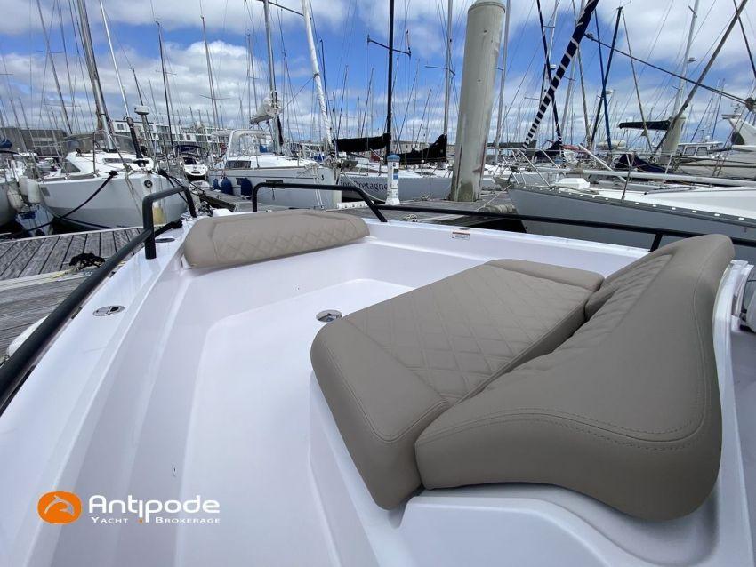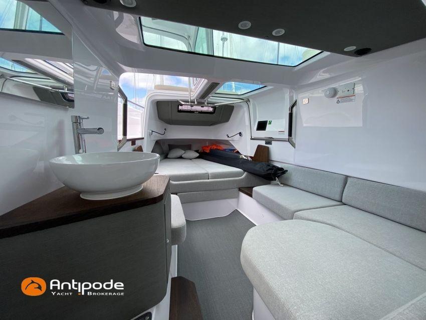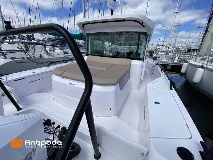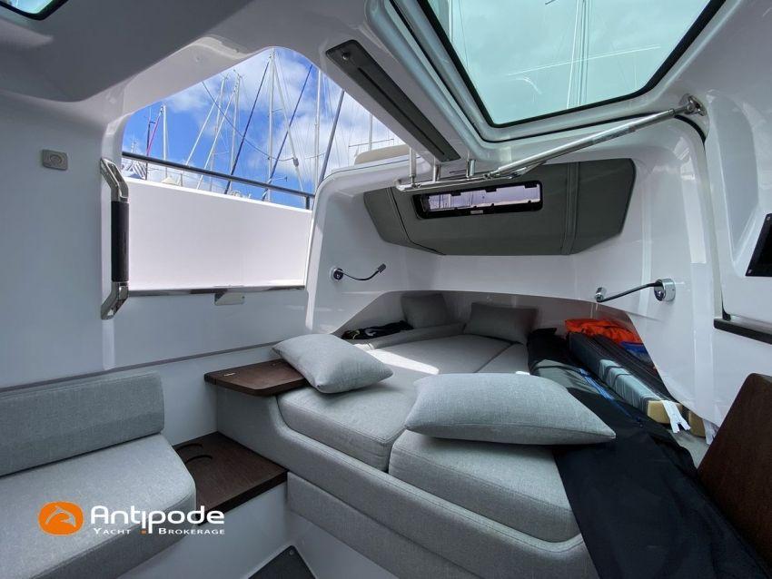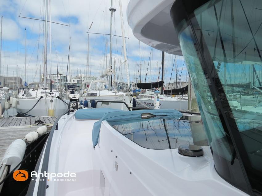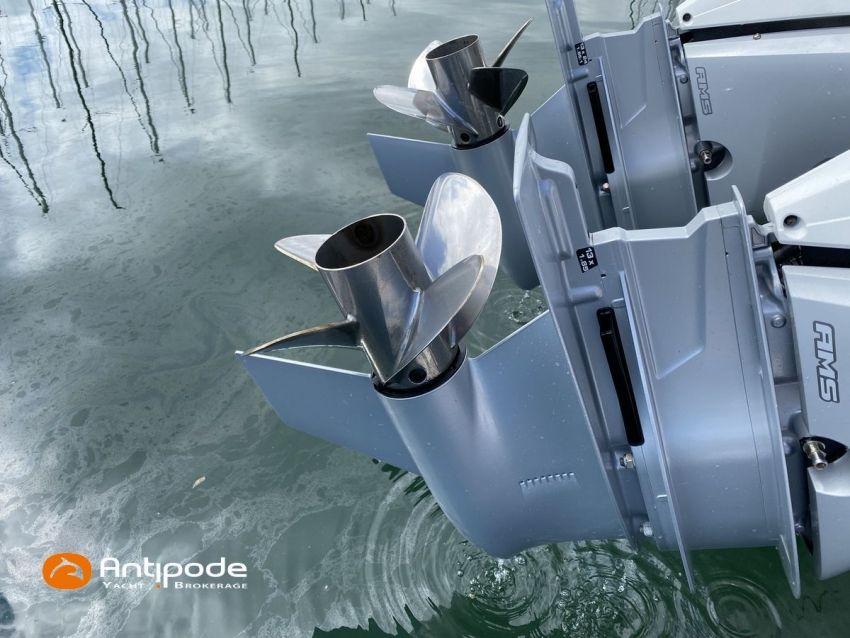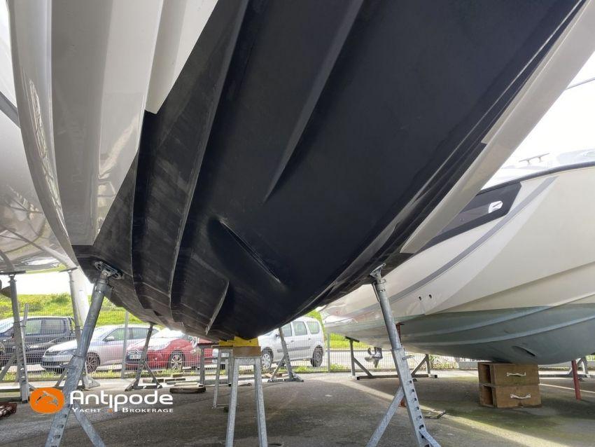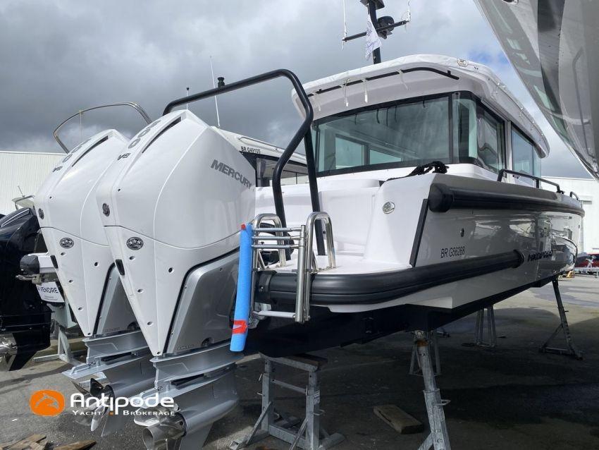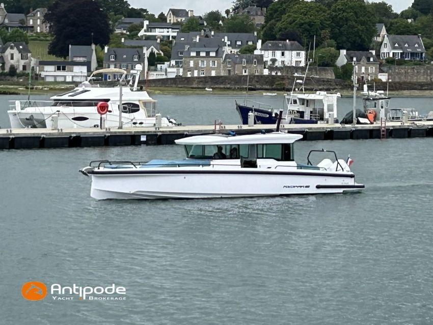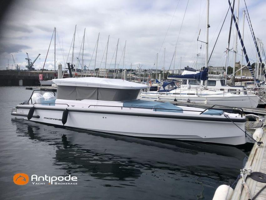 AXOPAR 37 XC CROSS CABIN + aft cabin, 2023, first hand, never chartered, 2 X MERCURY V8, 2 X 300 hp (59 hrs), Bow thruster, Version - BRABUS, Aft cabin version, Interior layout version 1 forward cabin, 1 aft cabin, GRP cockpit table , Sun awning front and aft, Winter covering - roof, Sun bathing aft deck mastresses + cover, Cockpit electric windlass remote control, Ski pool, Roof top handle bar, Windscreen covers., GPS and chartplotter (cockpit) - 2x 12, AIS receiver, Joystick Mercury + Skyhook, Trim tab+Joystick, Fridge unit 12 V (front opening door), Water heater 220 V , Electric toilets, Hot and cold cockpit shower, 12kg Stanless Anchor + chain, Located Brittany. For more information or to make an appointment for a visit, contact : François Mouchel 06 62 30 97 30 - francois@antipode-yachts.com