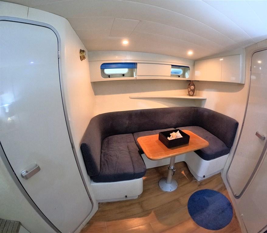 The external sofa is C-shaped and covers the entire perimeter of the boat.