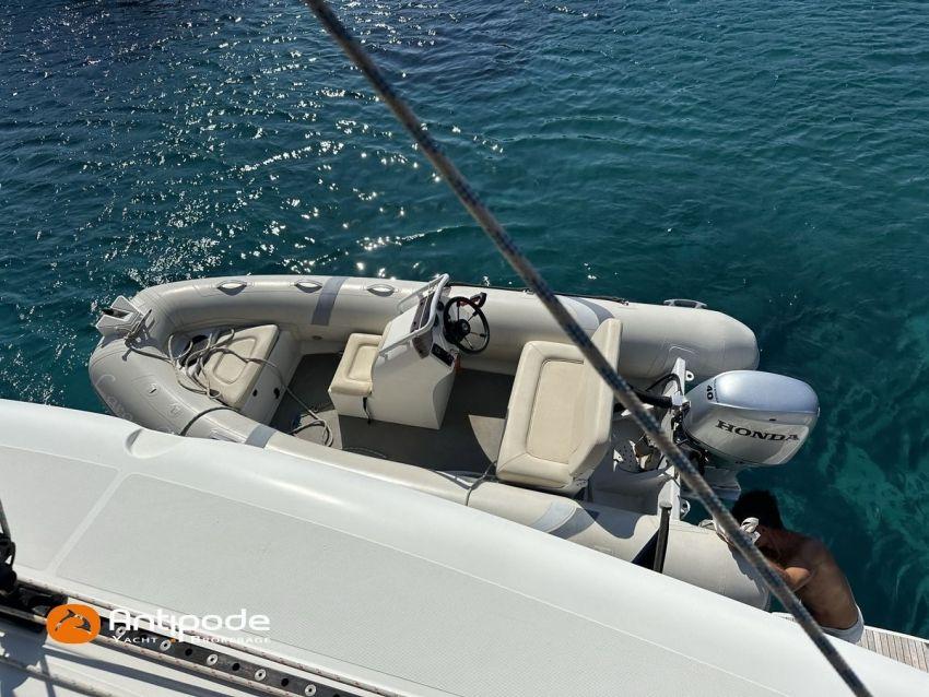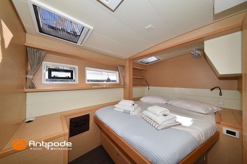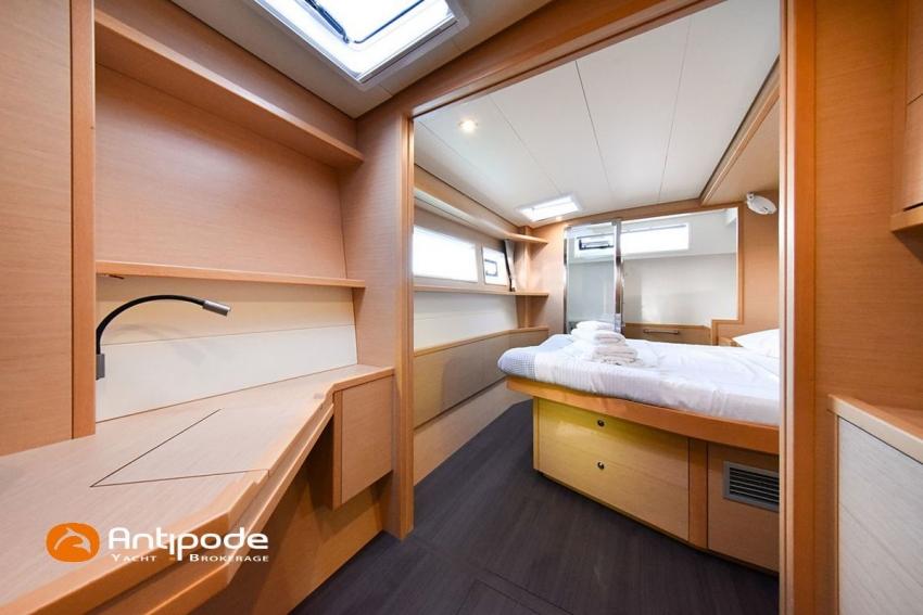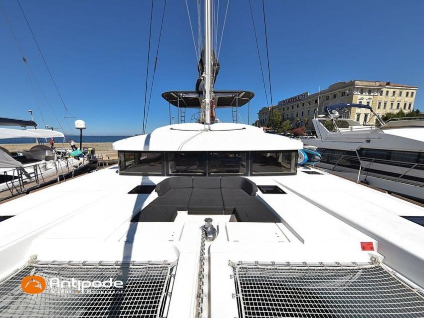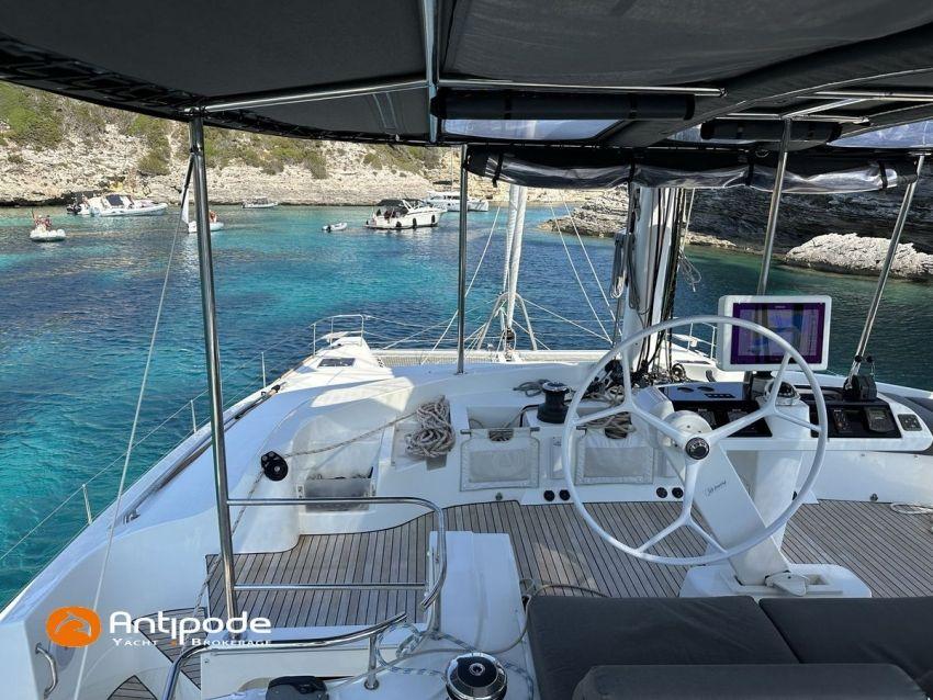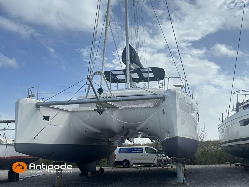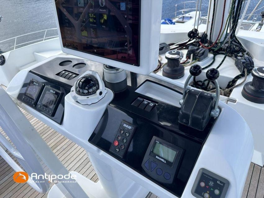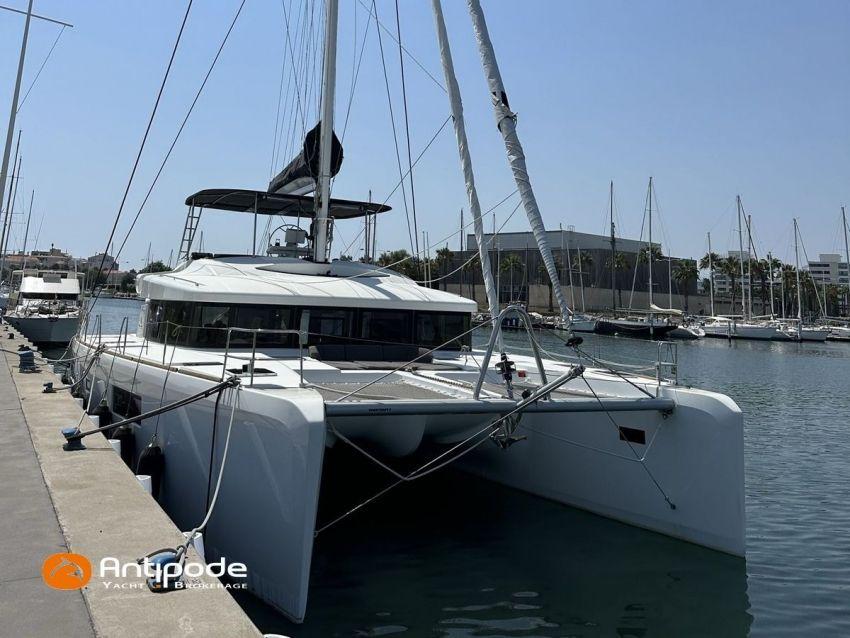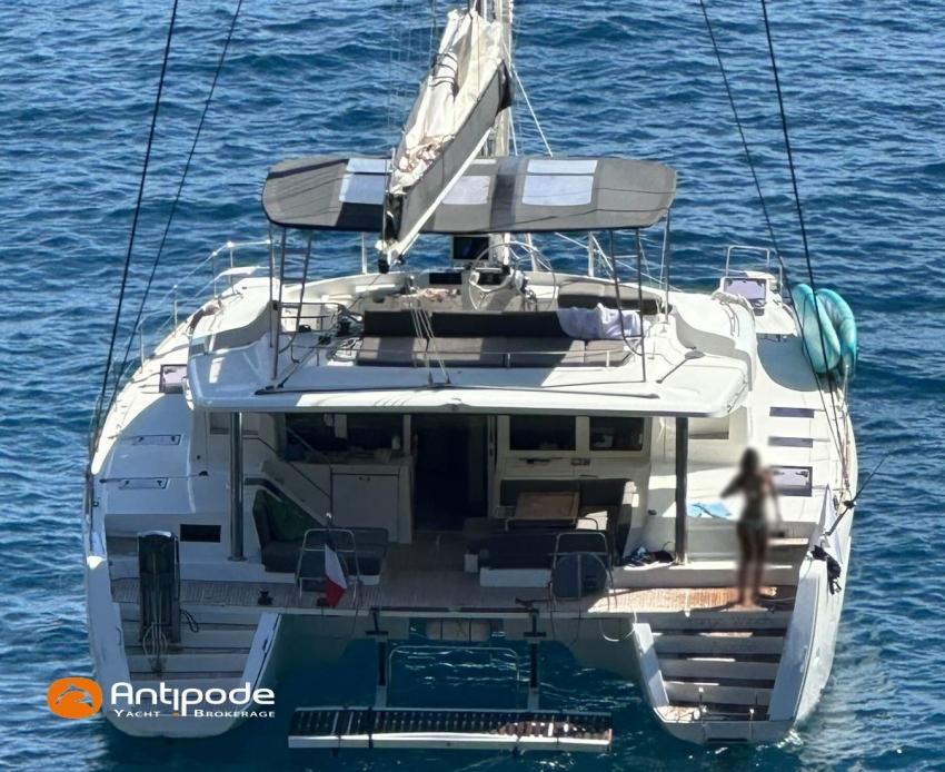 LAGOON 52 F, 2017, VAT PAID, first hand, 2 X Yanmar 4JH80, 2 X 80 hp (3372 hrs), Bow thruster, Interior layout version 5 cabins, Galley to port and saloon table to starboard, Starboard hull : owner's cabin, access from saloon, Separated shower and toilets in owner's cabin, Port hull : single berth in forepeak, Leather pockets in cabins, Aft cabins : Extra opening hatches and curtains, Interior woodwork - Alpi Chêne blond, Saloon upholstery - 2023, Teak slatted cockpit and aft hulls stairs, Flying bridge : teak slatted floor, Teak refit 2024 (levelling, sanding, oiling), Extra storage in starboard cockpit, Tilting wheel steering system - Jefa steering, GRP sandwich wheel, Sun bathing foredeck mastresses - 2023, Flying bridge seats cushions - 2023, Cockpit cushions - 2023, Full cockpit enclosure, Folding teak cockpit table, Cockpit chain counter and remote control - Maxwell 2023, Port hull : hydraulic gangway - Bridge 27 (2023), Hydraulic tender lift system 500 kg - 2023, Flying bridge bimini top - 2023, Deck stepped aluminium mast and canoe boom, white painted, Full batten squared head main sail - 2023, Main sail mast track + batten cars - Facnor, Main sail lazy bag - Sunbrella 2023, Furling genoa - 2023, Code 0 riggings and bowsprit, Furlable Code 0, Navigation center pack B & G 2017, 2 chartplotters / GPS / radar (chart table and cockpit) - B & G - B & G, In board autopilot - B & G, Autopilot display (chart table) 2024, Autopilot remote control - B & G, Radar with radome radar fitted on mast with stainless steel protection - B & G 4G, VHF and dual station to flying bridge - B & G RS 90, Handheld VHF - D 130 2024, Audio music system - Fusion MS RA 205, 4 speakers saloon, 4 speakers cockpit and flying bridge, Television (saloon) on lifting system - LED 32, Yanmar engines remote control (chart table and flying bridge), Cockpit fridge 80 l, Flying bridge fridge 110 l, Micro wave owen - 220 V, Dish machine 220 V - Miele, 220 V shore power + 2 battery chargers - Mastervolt 100 amp (1 from 2024), 4 bow thrusters batteries - Optima 55 amp 2023, 12 V to 220 V Inverter - 3000 W - Victron, Air conditionning 220 V - 60000 BTU, Deck washing pump, sea and fresh water, Generator 220 V - ONAN 17.5 KVA, Watermaker (refitted 2023 and serviced 2024) - Sea Revovery Aquamatic 280 l/h 220 V, Fresh water inlet, Deck machine pump, sea and fresh water, 2 X Liferafts - 2 X 6 man container 2023, Anchor + chain - Spade 35 kg 2023, Dinghy - Highfield, Outboard engine - Honda DF 40, Lying Med. For more information or to make an appointment for a visit, contact : Jérôme Le Joubioux +33 6 07 45 71 73 - jerome@antipode-yachts.com