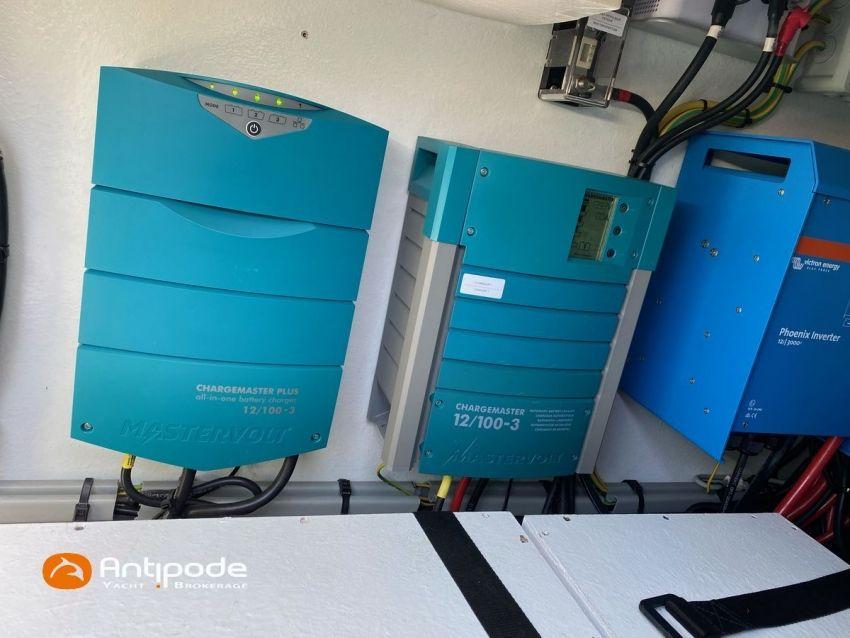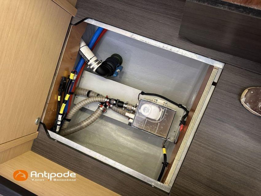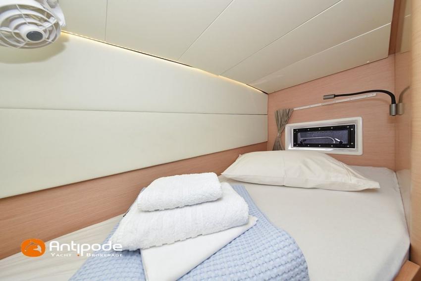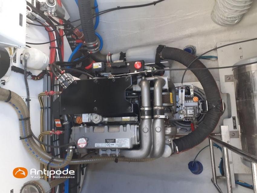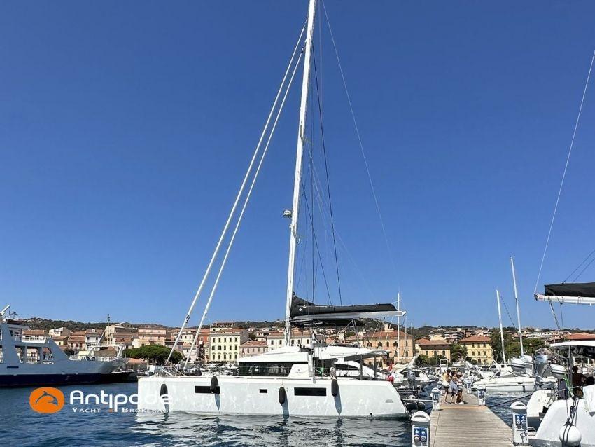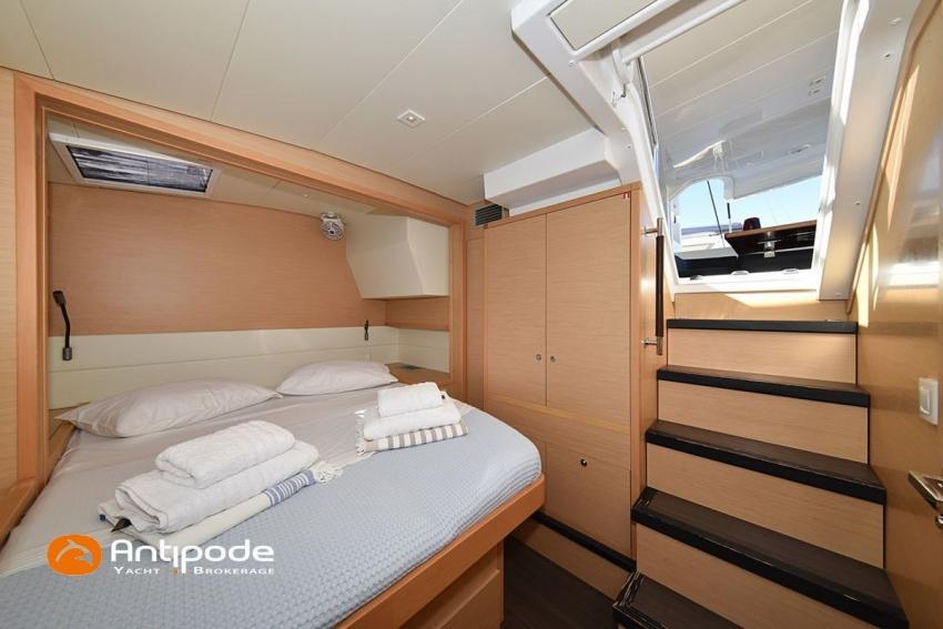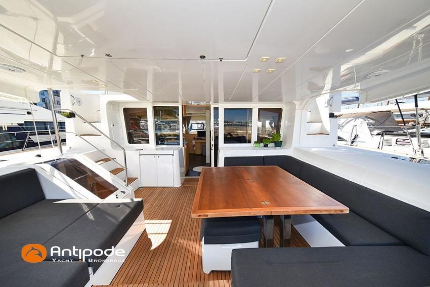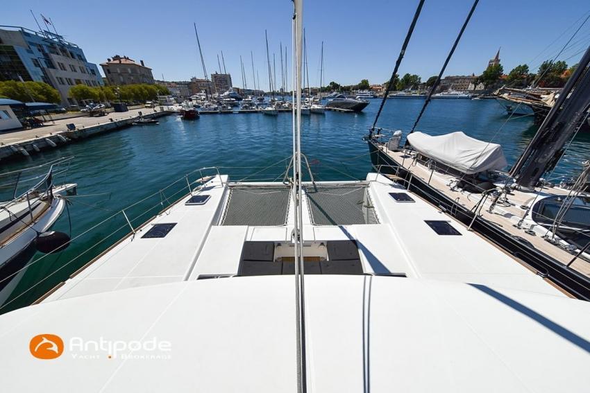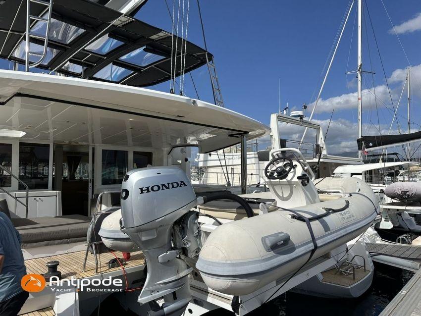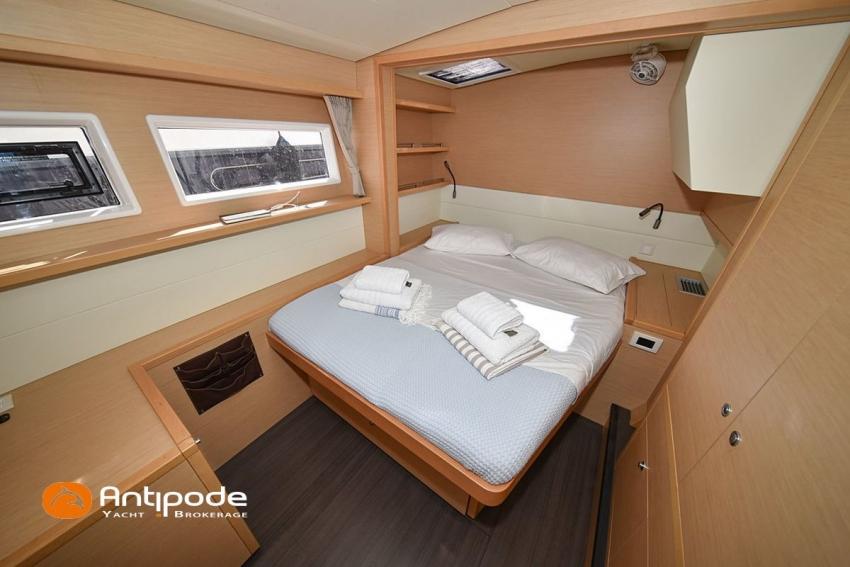 LAGOON 52 F, 2017, VAT PAID, first hand, 2 X Yanmar 4JH80, 2 X 80 hp (3372 hrs), Bow thruster, Interior layout version 5 cabins, Galley to port and saloon table to starboard, Starboard hull : owner's cabin, access from saloon, Separated shower and toilets in owner's cabin, Port hull : single berth in forepeak, Leather pockets in cabins, Aft cabins : Extra opening hatches and curtains, Interior woodwork - Alpi Chêne blond, Saloon upholstery - 2023, Teak slatted cockpit and aft hulls stairs, Flying bridge : teak slatted floor, Teak refit 2024 (levelling, sanding, oiling), Extra storage in starboard cockpit, Tilting wheel steering system - Jefa steering, GRP sandwich wheel, Sun bathing foredeck mastresses - 2023, Flying bridge seats cushions - 2023, Cockpit cushions - 2023, Full cockpit enclosure, Folding teak cockpit table, Cockpit chain counter and remote control - Maxwell 2023, Port hull : hydraulic gangway - Bridge 27 (2023), Hydraulic tender lift system 500 kg - 2023, Flying bridge bimini top - 2023, Deck stepped aluminium mast and canoe boom, white painted, Full batten squared head main sail - 2023, Main sail mast track + batten cars - Facnor, Main sail lazy bag - Sunbrella 2023, Furling genoa - 2023, Code 0 riggings and bowsprit, Furlable Code 0, Navigation center pack B & G 2017, 2 chartplotters / GPS / radar (chart table and cockpit) - B & G - B & G, In board autopilot - B & G, Autopilot display (chart table) 2024, Autopilot remote control - B & G, Radar with radome radar fitted on mast with stainless steel protection - B & G 4G, VHF and dual station to flying bridge - B & G RS 90, Handheld VHF - D 130 2024, Audio music system - Fusion MS RA 205, 4 speakers saloon, 4 speakers cockpit and flying bridge, Television (saloon) on lifting system - LED 32, Yanmar engines remote control (chart table and flying bridge), Cockpit fridge 80 l, Flying bridge fridge 110 l, Micro wave owen - 220 V, Dish machine 220 V - Miele, 220 V shore power + 2 battery chargers - Mastervolt 100 amp (1 from 2024), 4 bow thrusters batteries - Optima 55 amp 2023, 12 V to 220 V Inverter - 3000 W - Victron, Air conditionning 220 V - 60000 BTU, Deck washing pump, sea and fresh water, Generator 220 V - ONAN 17.5 KVA, Watermaker (refitted 2023 and serviced 2024) - Sea Revovery Aquamatic 280 l/h 220 V, Fresh water inlet, Deck machine pump, sea and fresh water, 2 X Liferafts - 2 X 6 man container 2023, Anchor + chain - Spade 35 kg 2023, Dinghy - Highfield, Outboard engine - Honda DF 40, Lying Med. For more information or to make an appointment for a visit, contact : Jérôme Le Joubioux +33 6 07 45 71 73 - jerome@antipode-yachts.com
