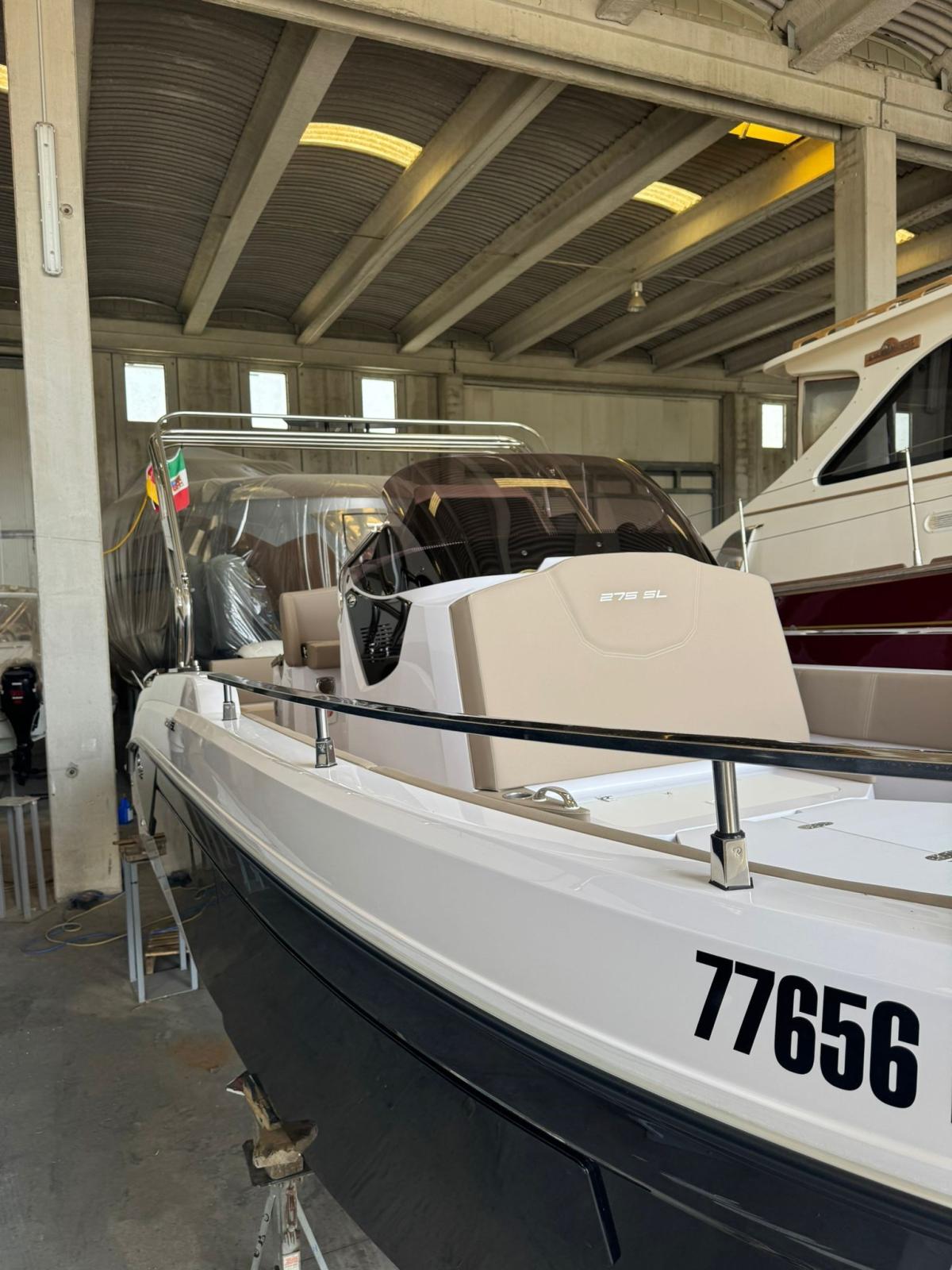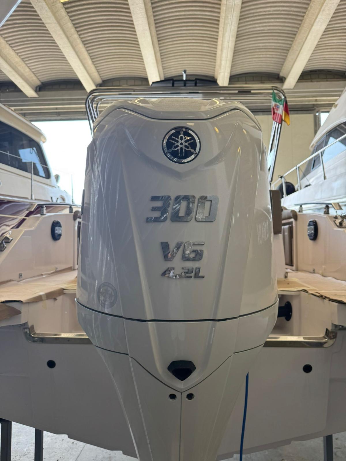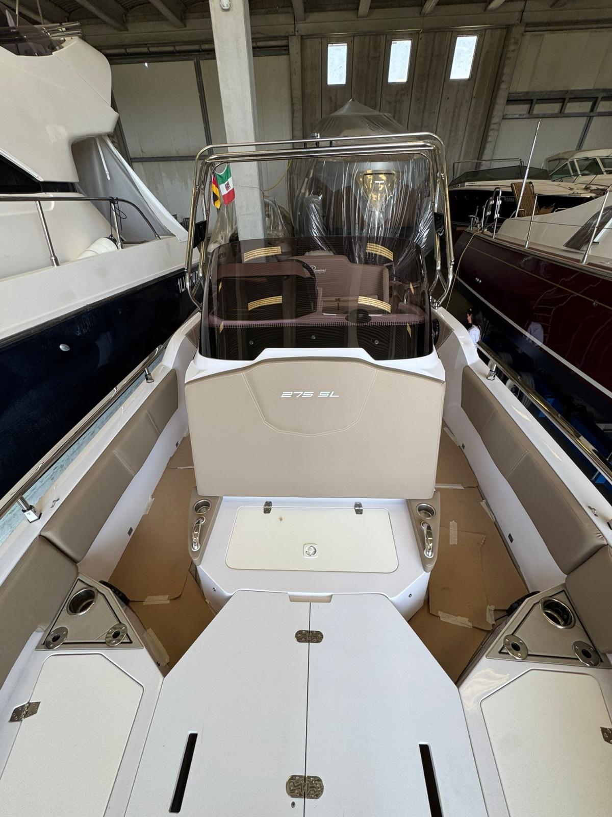 2 Console portholes with black plexiglass cover - 2 S-Line comfort seats with boolster - 8 Cup holders - Luxury cabin equipment - Gas extractor - Compass - Stainless steel anchor cubia - Bow "C" dinette with sunbathing extension - Refrigerator - Complete shower system - Fuel level indicator - Navigation lights - Dark grey oak cabin furniture - N° 2 Bow seat backrest - King engine cable cover - Stern platforms at walking surface level - Fuel pump bilge with automatic/manual control - Storage compartment - Cockpit with Seadeck - Black Plex hull profiles - Redan HIS Gen III hull - Electric windlass - White hull - Telescopic stainless steel climbing ladder - Bow seat - Water tank - Fuel tank - Complete set of stainless steel handrails - Tilting backrest for stern seat - Standard external upholstery - Internal upholstery - King Starboard stern table - Complete hydraulic steering up to 300HP (Monopropeller) - Electric Horn - Electric Marine Toilet with Black Water Tank