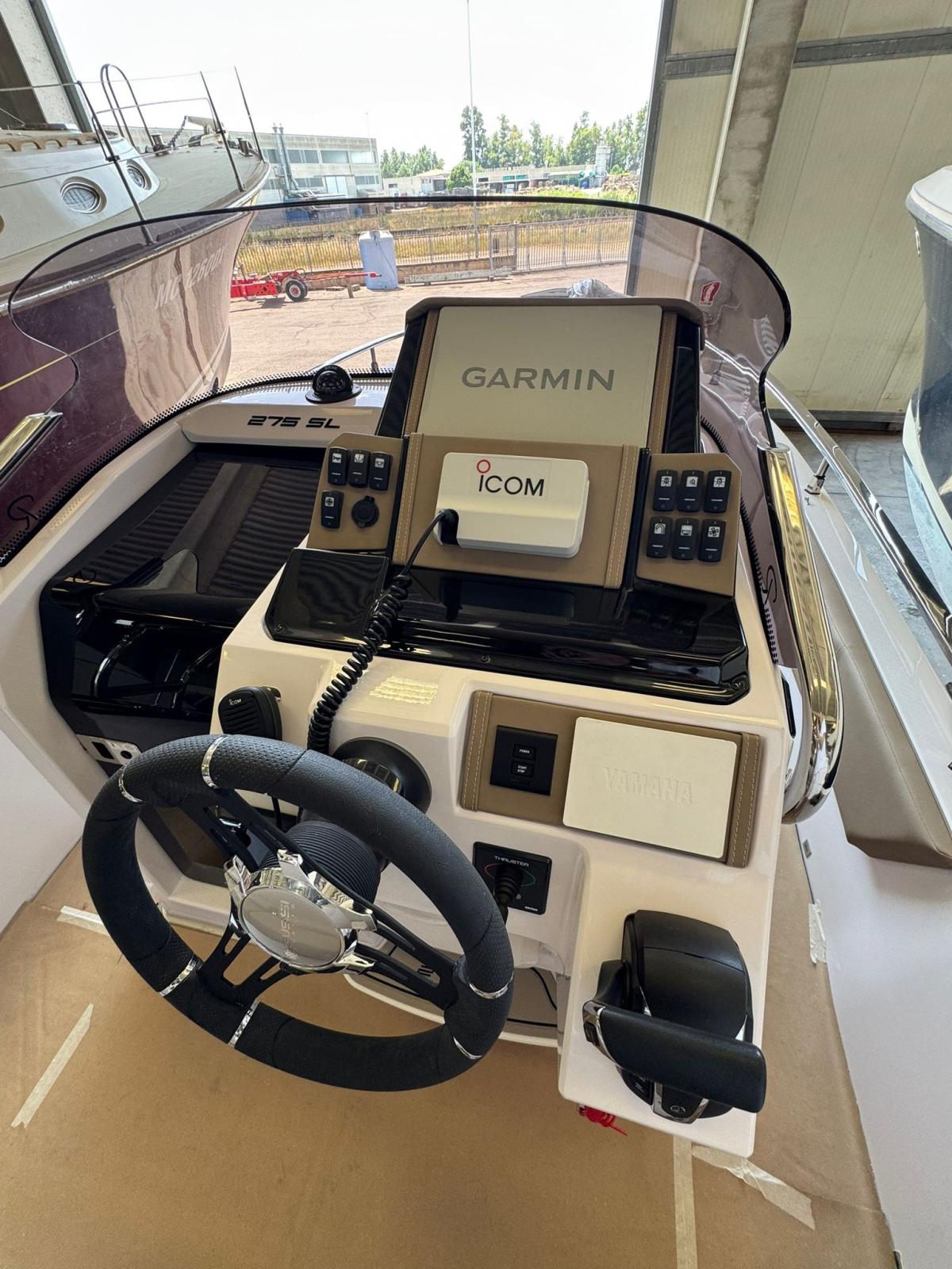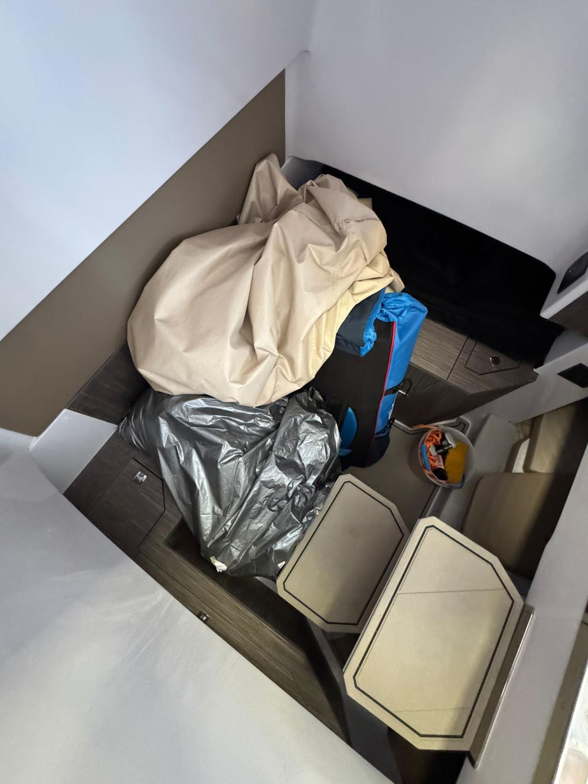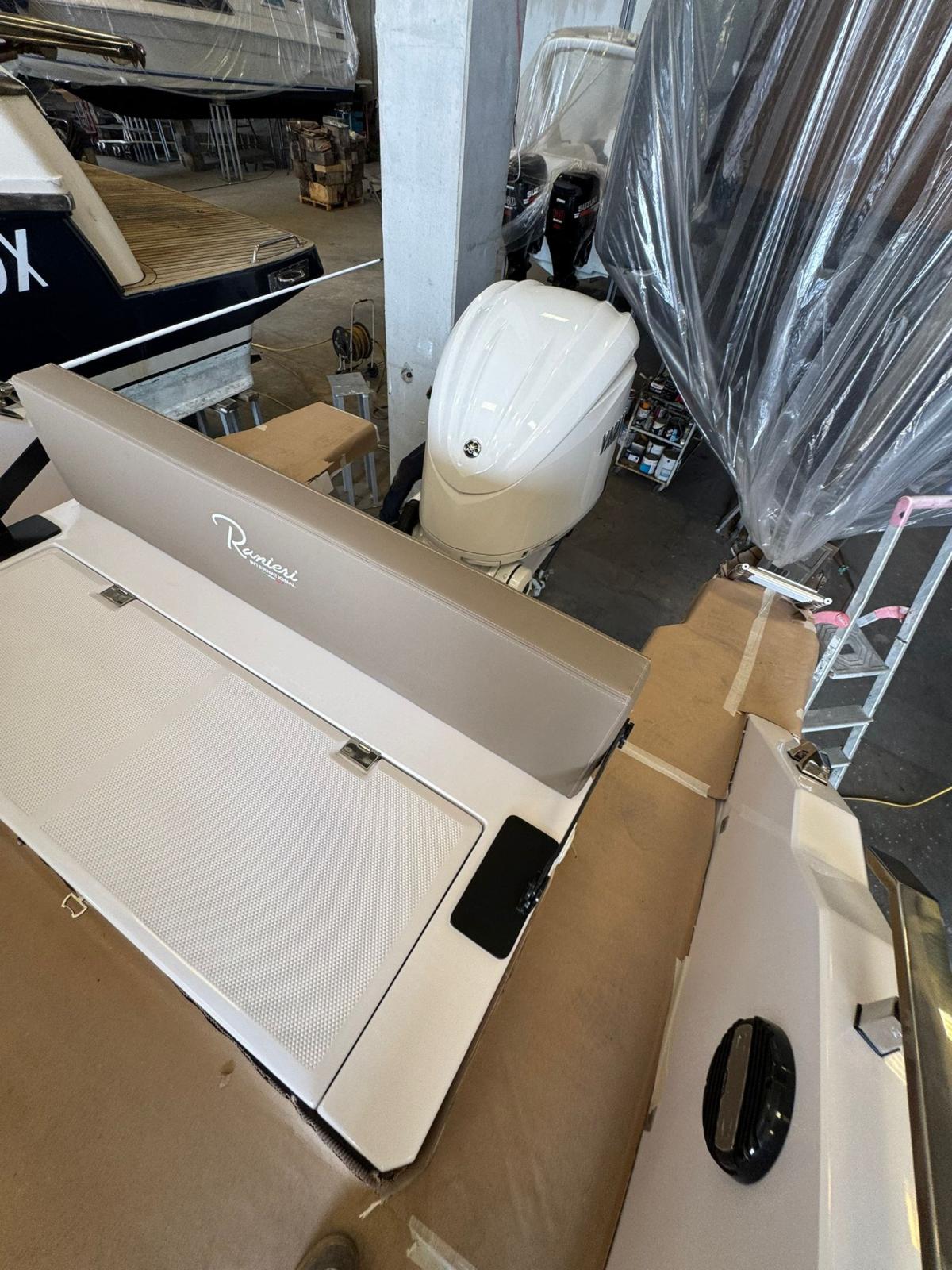 2 Console portholes with black plexiglass cover - 2 S-Line comfort seats with boolster - 8 Cup holders - Luxury cabin equipment - Gas extractor - Compass - Stainless steel anchor cubia - Bow "C" dinette with sunbathing extension - Refrigerator - Complete shower system - Fuel level indicator - Navigation lights - Dark grey oak cabin furniture - N° 2 Bow seat backrest - King engine cable cover - Stern platforms at walking surface level - Fuel pump bilge with automatic/manual control - Storage compartment - Cockpit with Seadeck - Black Plex hull profiles - Redan HIS Gen III hull - Electric windlass - White hull - Telescopic stainless steel climbing ladder - Bow seat - Water tank - Fuel tank - Complete set of stainless steel handrails - Tilting backrest for stern seat - Standard external upholstery - Internal upholstery - King Starboard stern table - Complete hydraulic steering up to 300HP (Monopropeller) - Electric Horn - Electric Marine Toilet with Black Water Tank