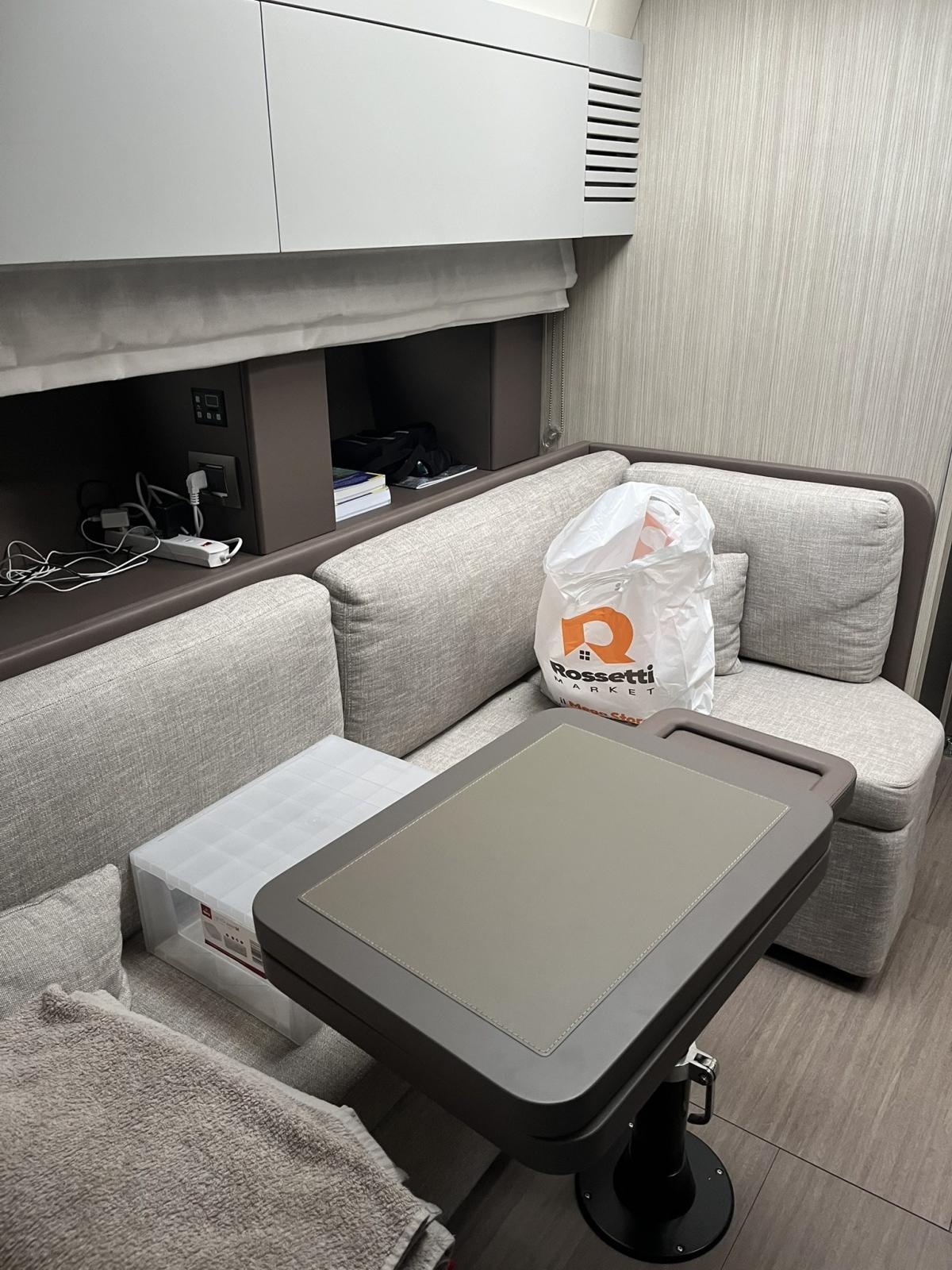 Engine Alarm, Bilge Alarm, Electric Engine Compartment Opening, Water pressure pump, Special Colour, 2 Deck Shower (Una a prua e una a poppa), Hydraulic Flaps, Tender Garage, Hard top (Con tenda), Washbasin in the cockpit, Underwater lights, Gangway (Idraulica a scomparsa), Platform (AD IMMERSIONE IDRAULICA), Automatic Bilge Pump, Teak deck, Teak Cockpit, Shorepower connector, Water harbor connector system, Rollbar, Electric Windlass, swimming ladder, cockpit table.