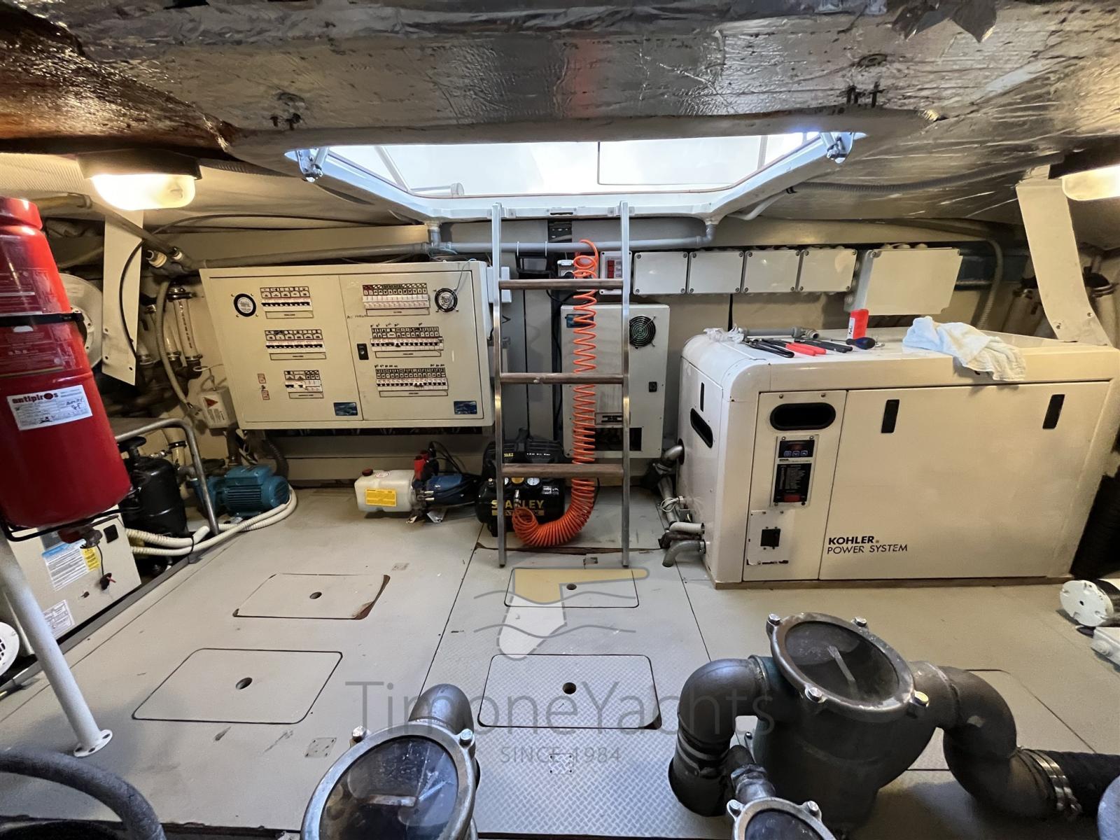 Engine Alarm, Anchor (Catena nuova 50 mt), Water pressure pump, 2 Battery charger (Nuovi barca e generatore), Deck Shower, Twin Steering, Directional Spotlight, Hydraulic Flaps, Fire Extinguishing System, Flaps Indicators, Anchor Chain Washdown, Underwater lights (2 bianche e 2 blu), Gangway (in teak), Platform (in teak), Automatic Bilge Pump, Teak Cockpit, Shorepower connector, Rollbar, Electric Windlass, swimming ladder, Saddles for tender, cockpit table (in teak e acciaio), Tender (SUR 350 30cv con trim idraulico), 2 Stern Winches.