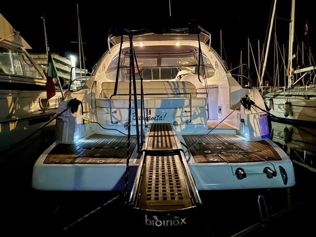 Engine Alarm, 4 Batteries (2 motori + 2 servizi), Teak Side Decks, 2 Deck Shower (1 a poppa 1 a prua), Hydraulic Flaps, Flaps Indicators, Washbasin in the cockpit, Courtesy Lights, Gangway, Platform (teak), Manual Bilge Pump, Entry door, Teak Cockpit, Shorepower connector, Water harbor connector system, Rollbar, Electric Windlass, swimming ladder, cockpit table, Tender (+ fuoribordo Honda 1,7 Kw).