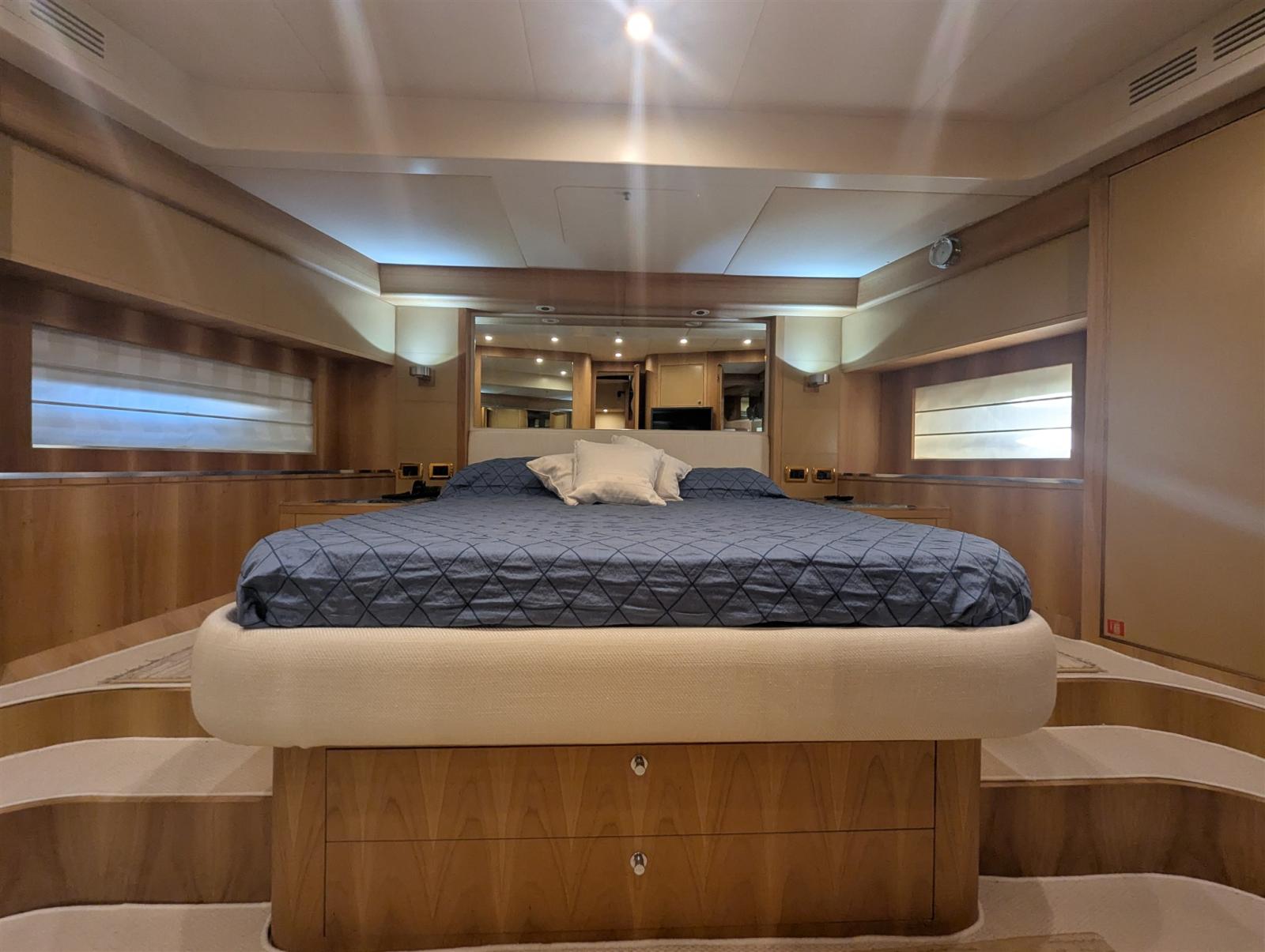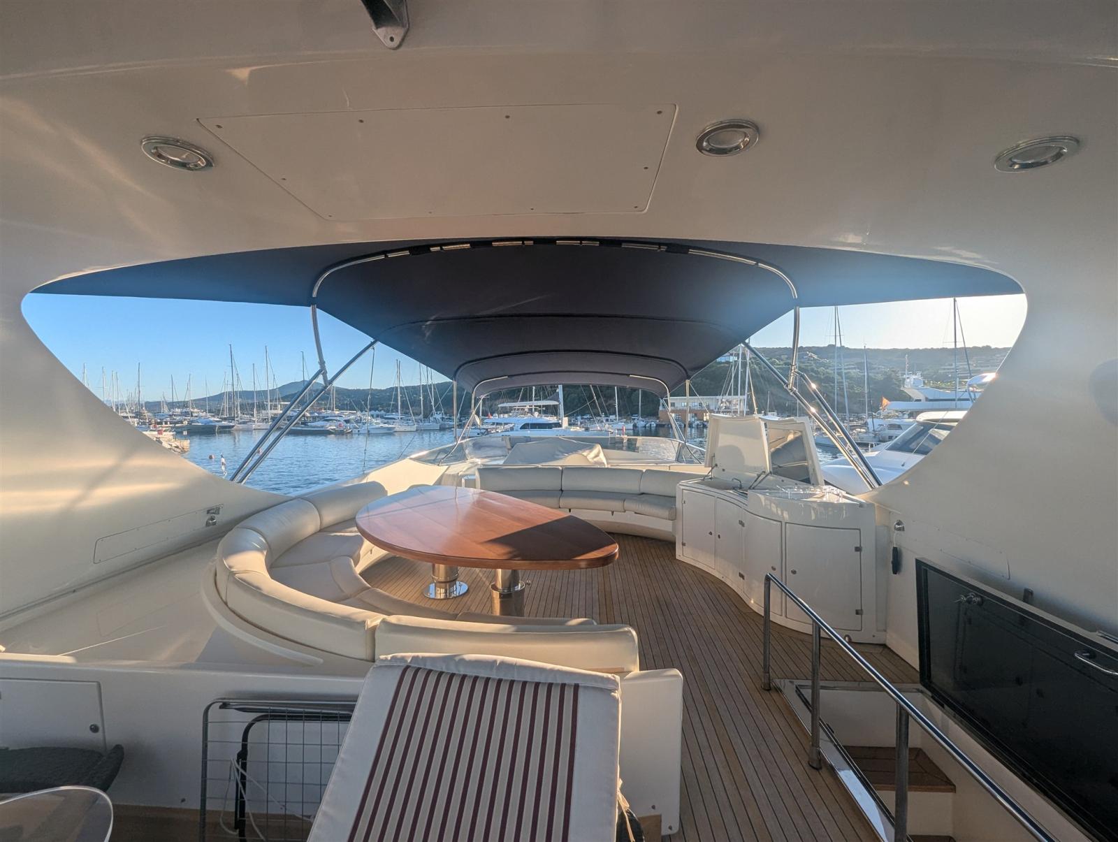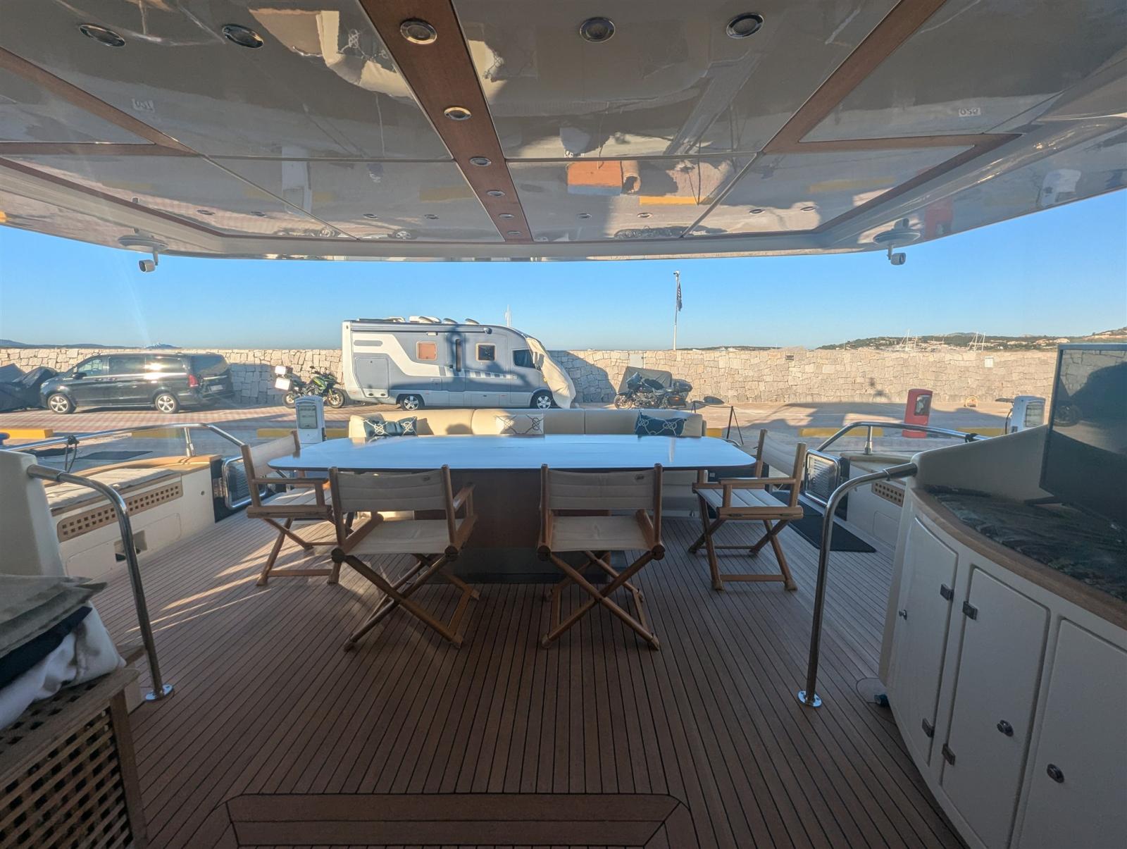 2 Engine Alarm, Bilge Alarm, Alternator, Water pressure pump, Teak Side Decks, 2 Battery charger, Special Colour (Blu), Deck Shower, Twin Steering, Headlights fixed on the stem, Directional Spotlight, Hydraulic Flaps, Tender Garage, Davits for tender on fly, Fire Extinguishing System, Flaps Indicators, Anchor Chain Washdown, Courtesy Lights, Underwater lights, Gangway (elettroidraulica), Platform (custom, elettroidraulica), 6 Automatic Bilge Pump, Teak deck, Entry door, 2 Side door, Teak Cockpit, Shorepower connector, Water harbor connector system, Voltage Rectifier, Rollbar (in Vtr), Electric Windlass, swimming ladder, Saddles for tender, cockpit table, Horn, 2 Stern Winches, 2 Bow Winches.