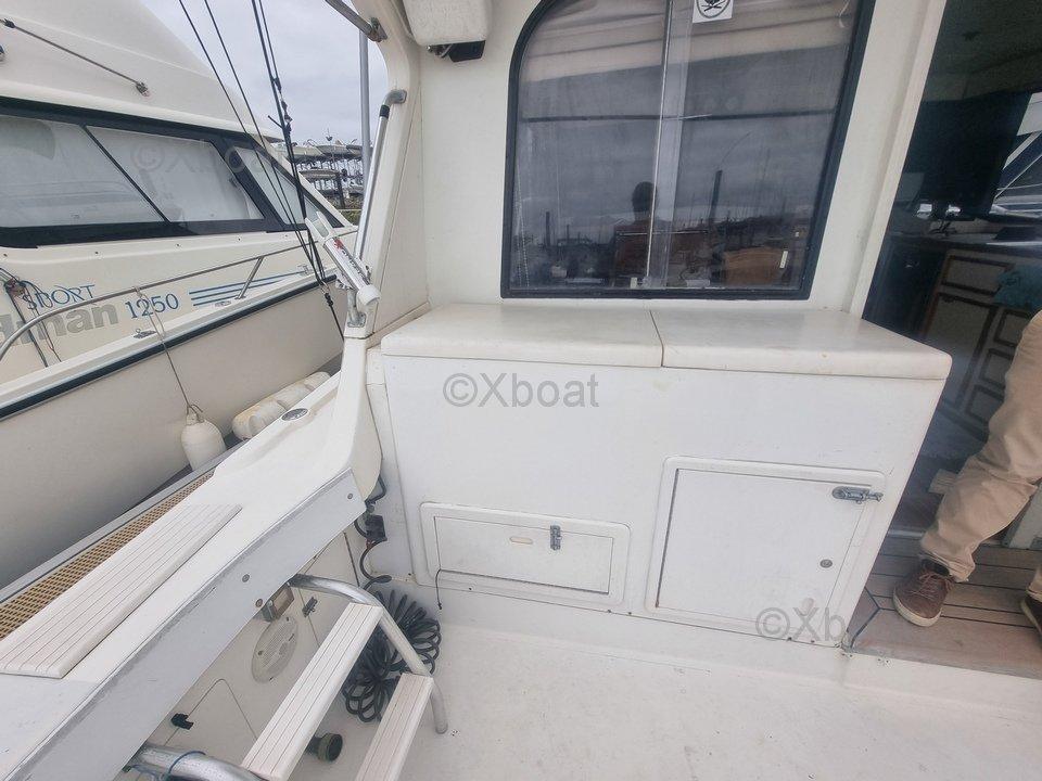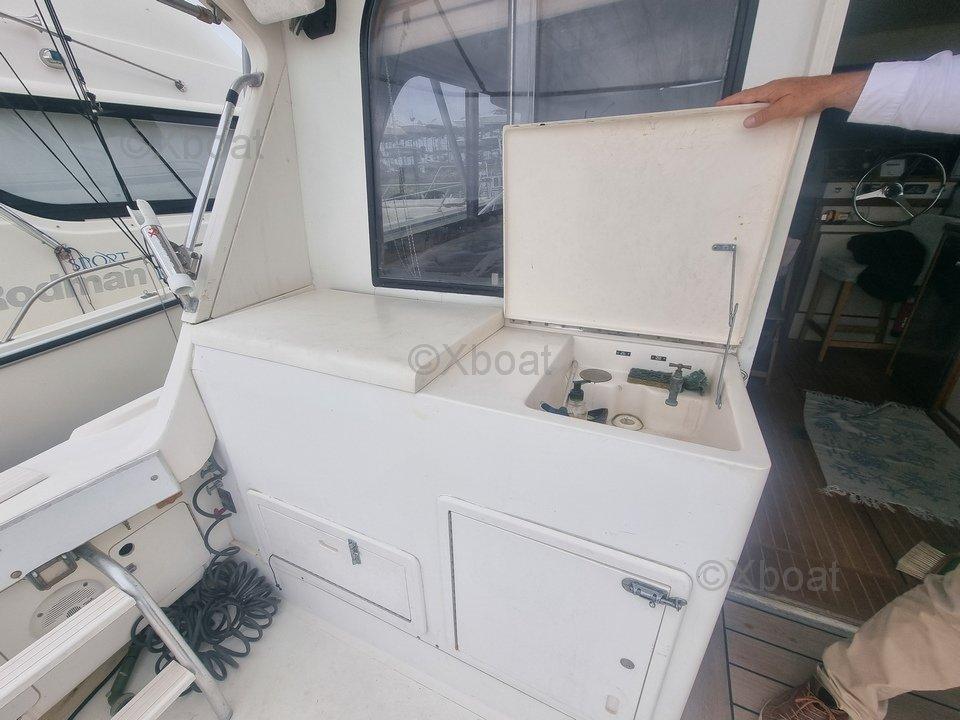 Spacious flybridge offering optimal visibility, large and secure cockpit, comfortable amenities, new flybridge upholstery.