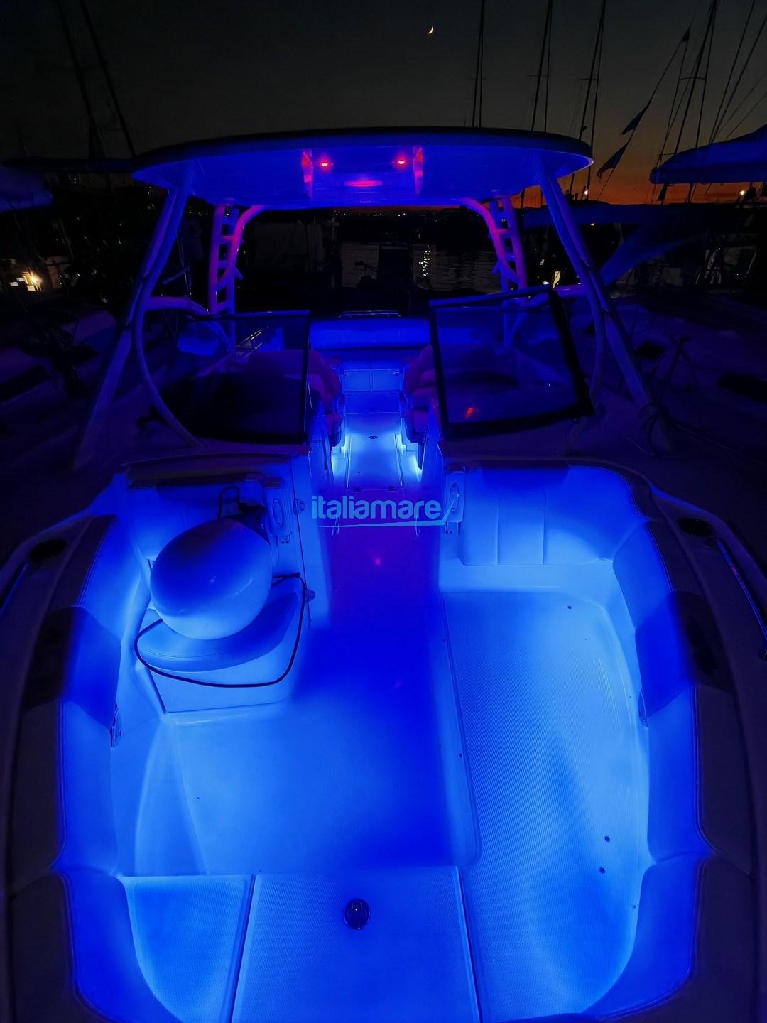 It is equipped with two outboard engines up to a total of 600 hp, guaranteeing a maximum speed of over 48 knots and a stable cruise of around 26–30 knots.