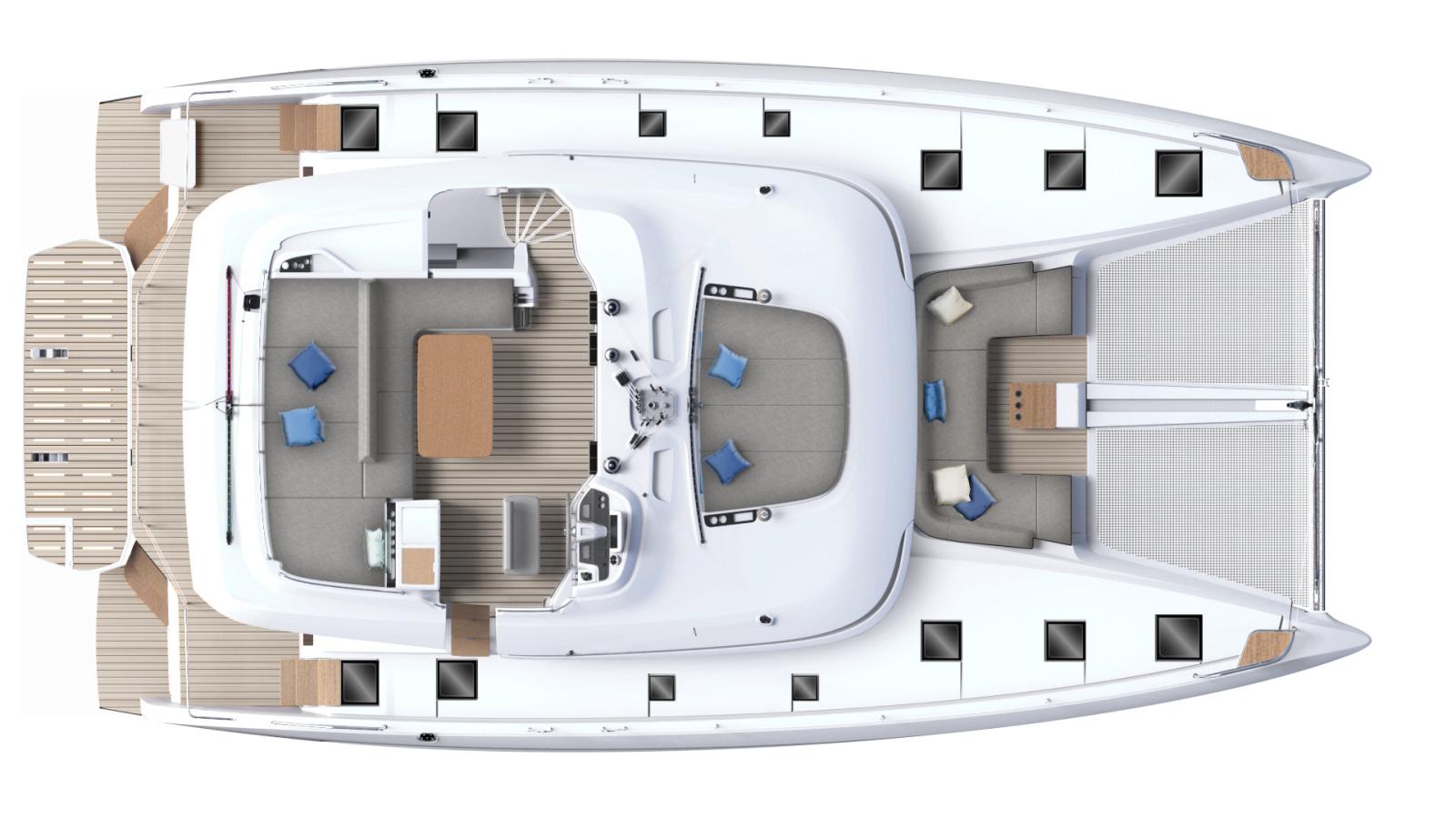 Le nouveau concept d'accès à bord et de circulation offre une sensation inédite. Les jupes arrière ne sont plus uniquement un espace de circulation, mais un véritable espace de vie au mouillage, pour cuisiner en plein air ou simplement rêver au ras de l’eau…