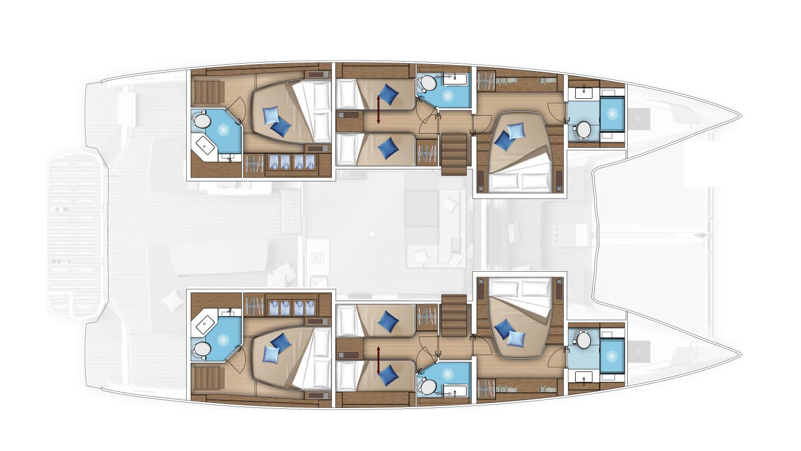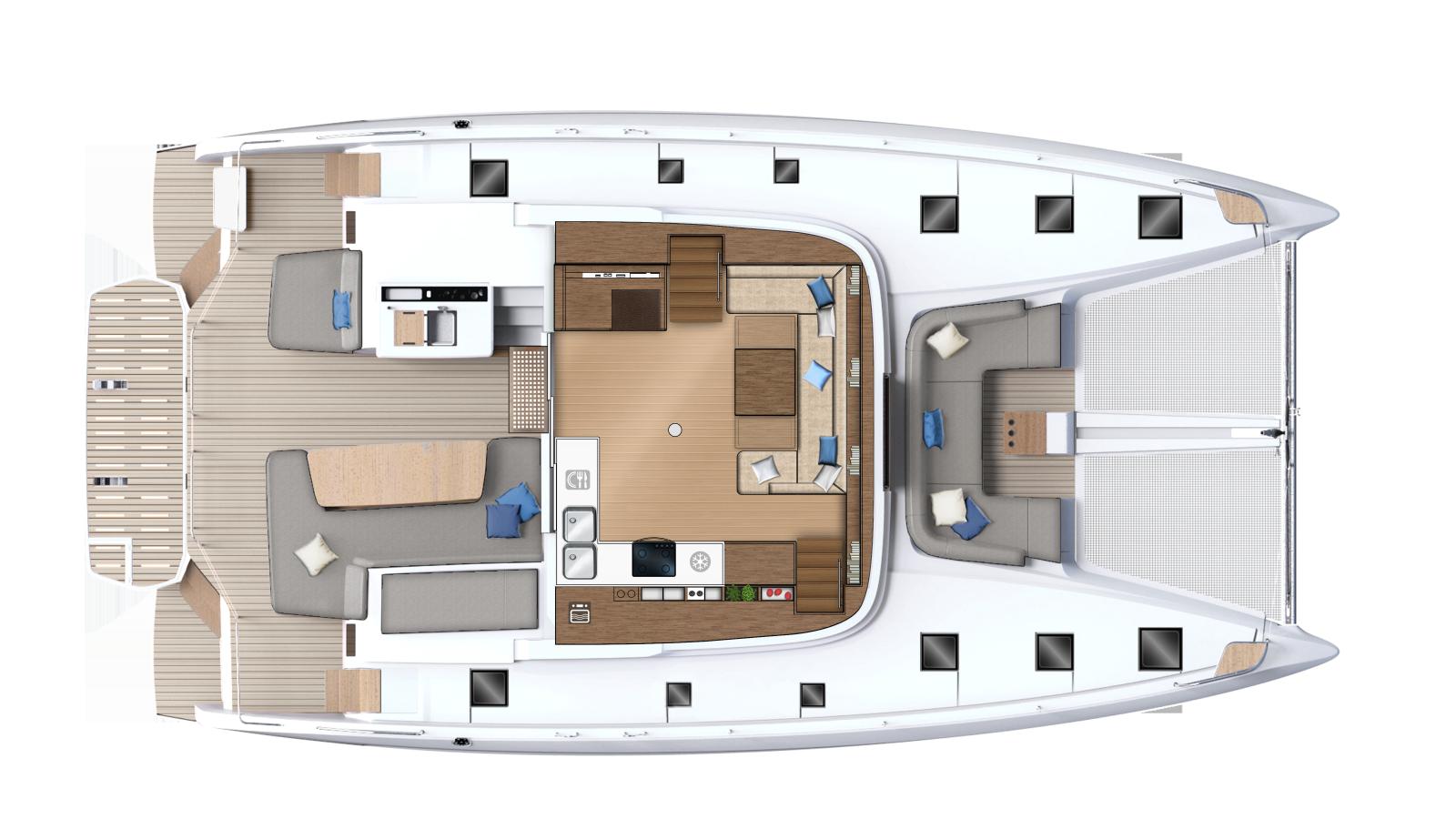 Comme dans toutes nos collaborations, Nauta Design a travaillé conjointement avec Lagoon pour concevoir le design intérieur du Lagoon 55. L'objectif premier du chantier, était de créer une grande qualité de vie à bord : des espaces lumineux et élégants, ainsi qu’une atmosphère sereine et harmonieuse, directement inspirés des yachts Lagoon. Nous étions en phase avec cet objectif. Nous avons œuvré avec Patrick le Quément, pour offrir de nouvelles perspectives, et ouvrir l’intérieur à des sources de lumière naturelle en utilisant des lignes horizontales, afin de profiter d’une continuité avec le paysage marin et l'horizon. Le champ visuel est libéré pour que les invités puissent profiter de la mer, du ciel, du soleil et de la beauté de l’environnement.