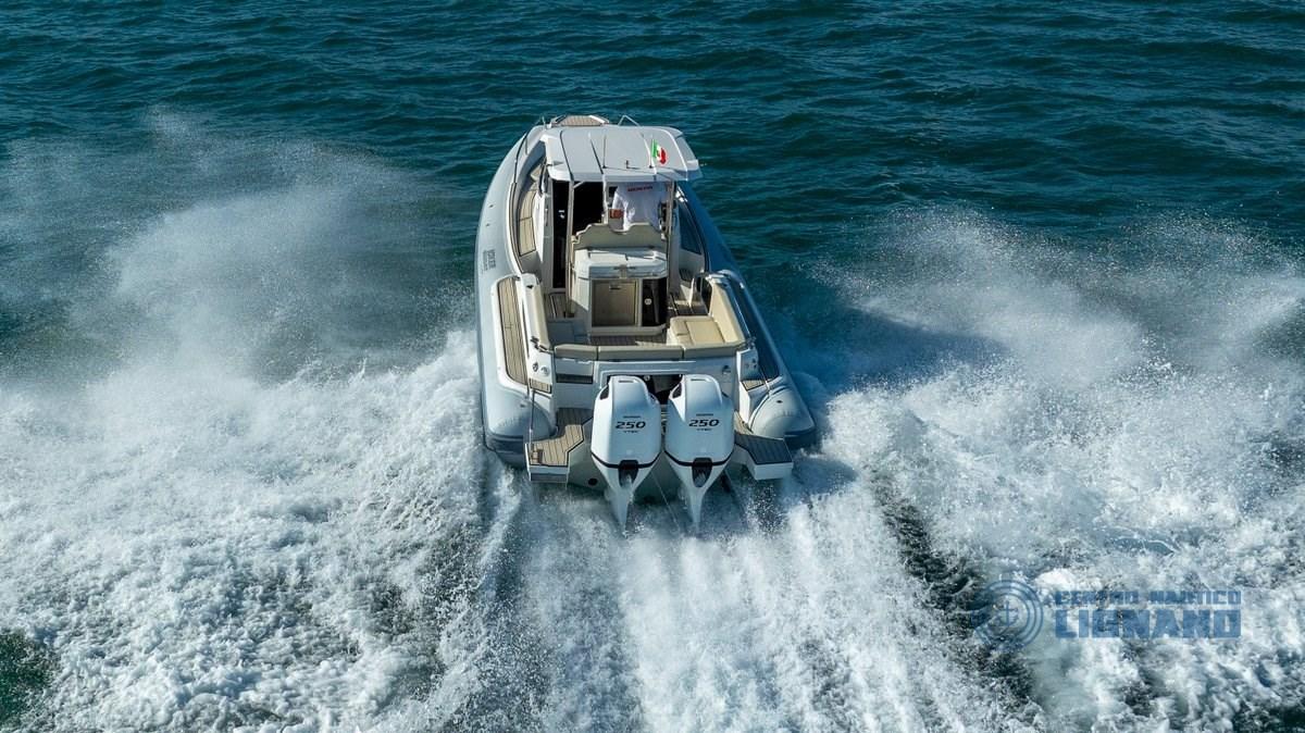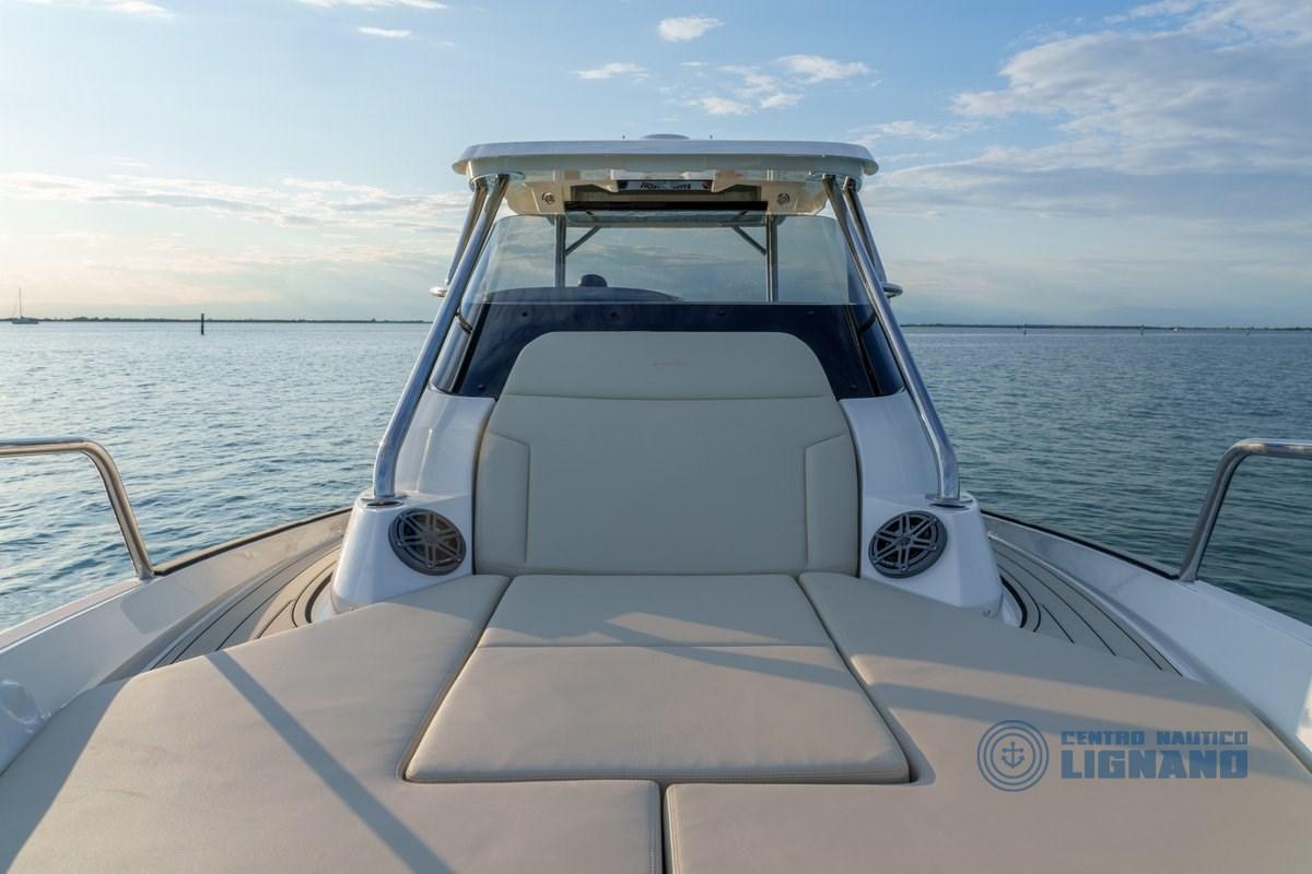 Standard equipment: Audio speakers x 4 - Battery charger 12V, 40 AMP with socket and shore cable - CE certified - Hull color - Console with windshield - Sunbathing cushions + driving seats - Hooks for suspension - Ski hooks - Electric inflator - Shower system - Repair kit - Navigation lights - User manual - Paddle with boat hook - Utility panel (16 functions) - Bilge pump - Cup holder (bow + stern) - Stainless steel recessed ladder - Acoustic signal - Tank water lt. 140 - Stainless steel fuel tank lt. 600 + Blower - Stern line pocket - Tienitibene in console - Table with stainless steel leg + Sunbathing extension cushion - Electric winch with anchor and chain, BOX GUIDE: Sink - Chopping board - Refrigerator lt. 62, CABIN: Upholstered Celini - Hull glass - Two-seater bed with large lockers - Storage cabinet - Cabinet with sink - Privacy bulkhead for toilet with door + sink and shower in the cabin - Toilet with macerator and black water tank with external bluetooth sensor - Mirror - Reading lights - RGB lighting - Dustbin - USB sockets - Hatch