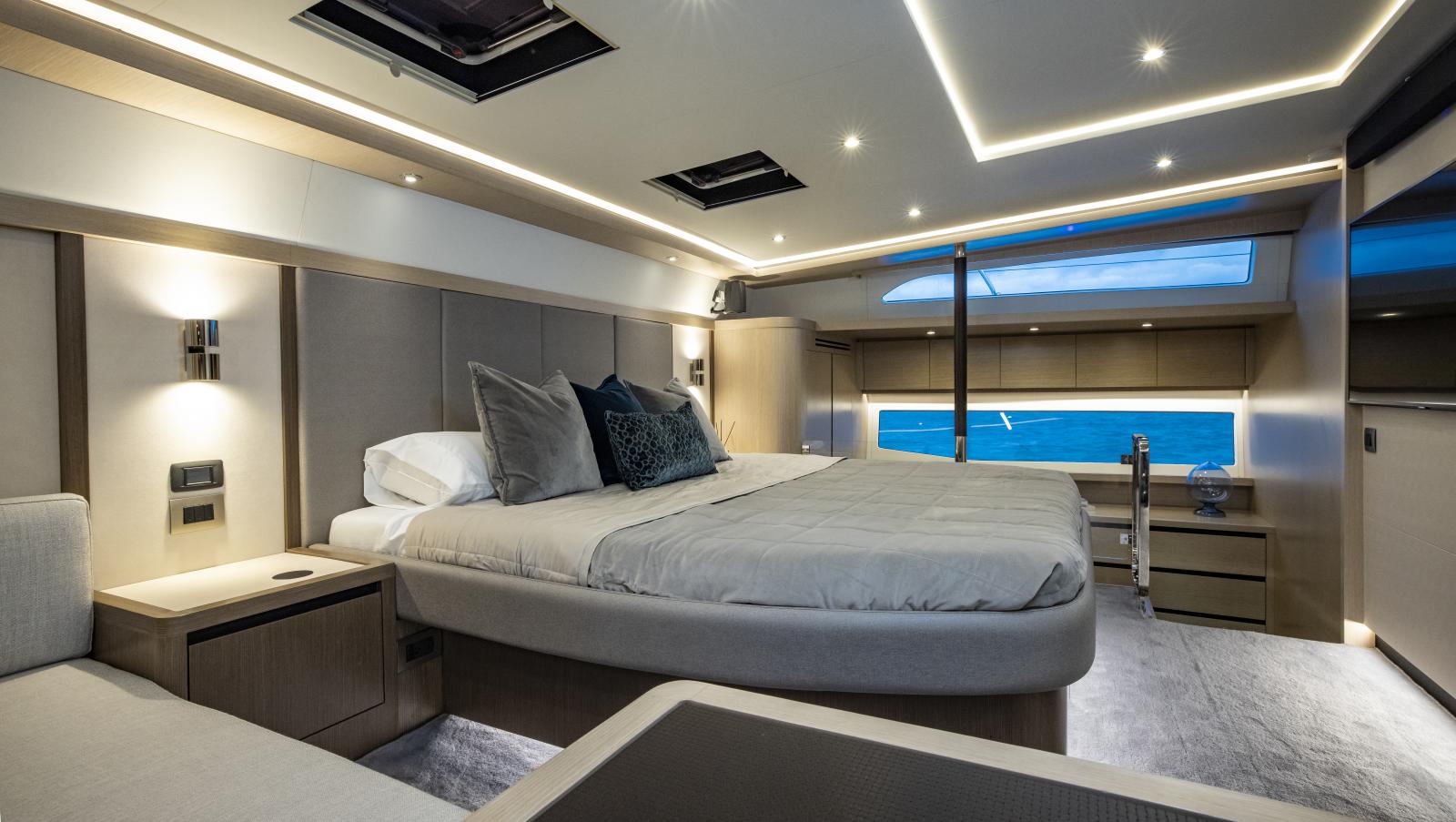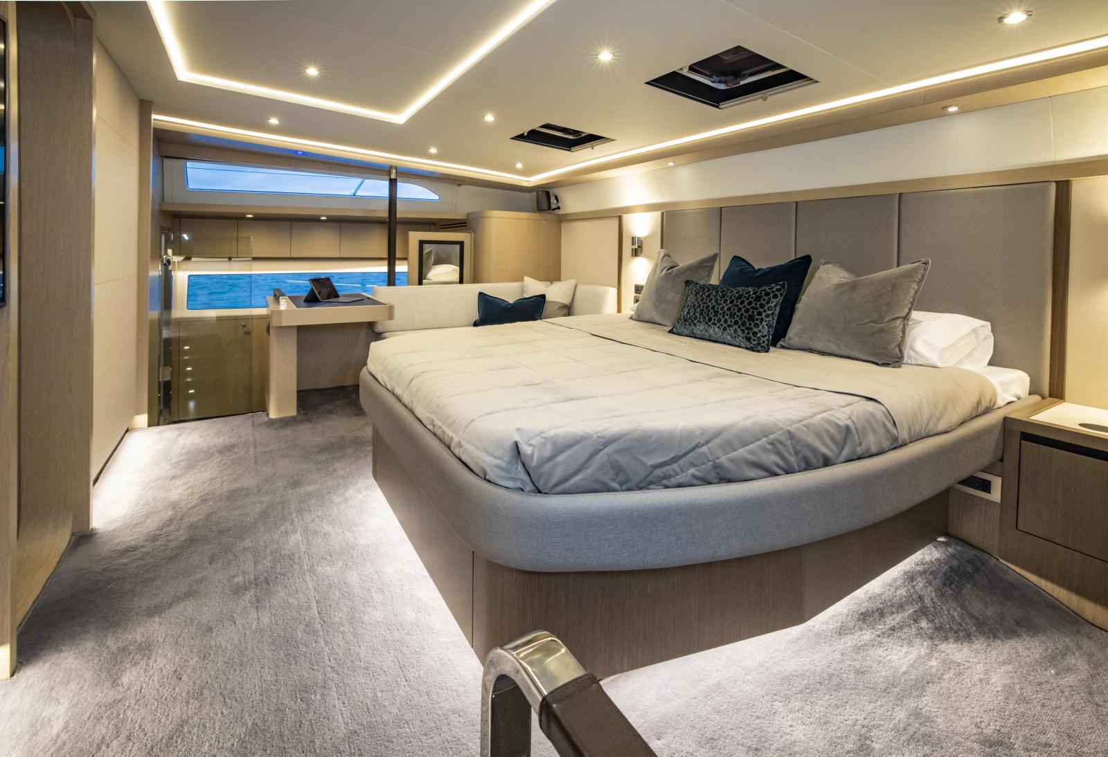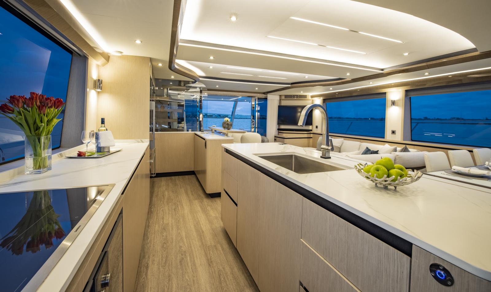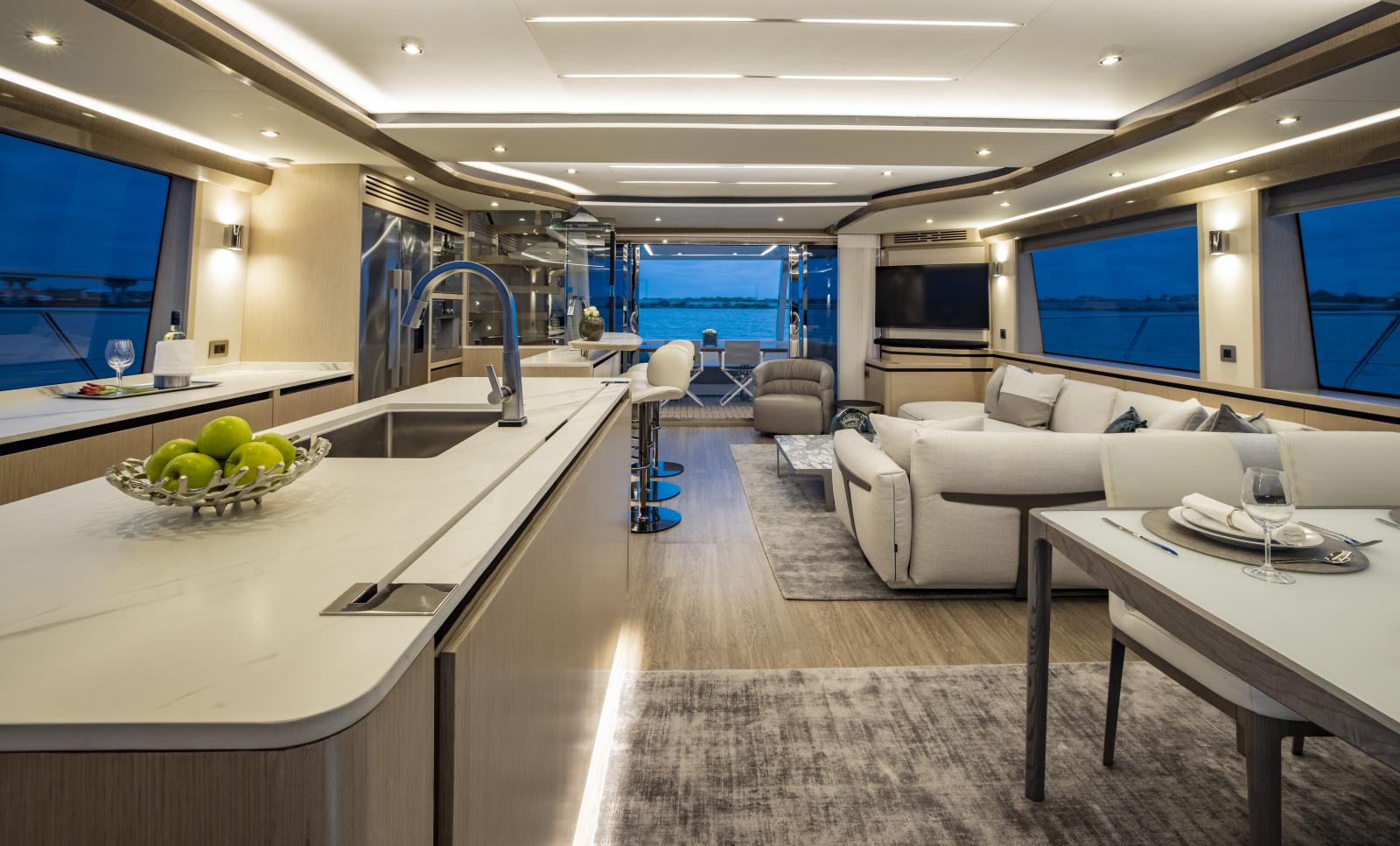 Volume et confort exceptionnels : grand salon lumineux, suite propriétaire de 27 pieds de large, options d’aménagement 3 ou 4 cabines, galley ‘up’ ou ‘down’, avec matériaux haut de gamme et nombreuses fenêtres panoramiques