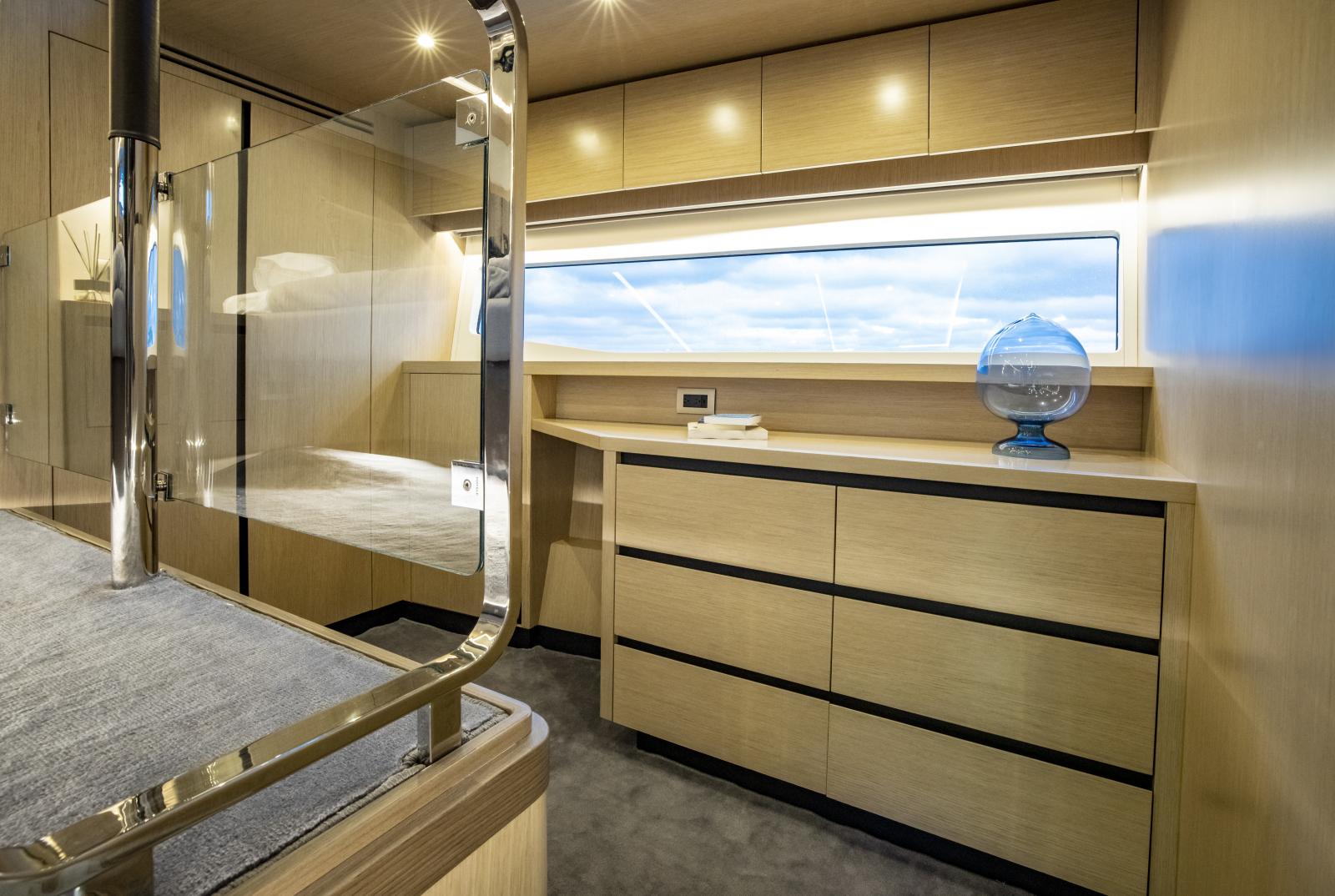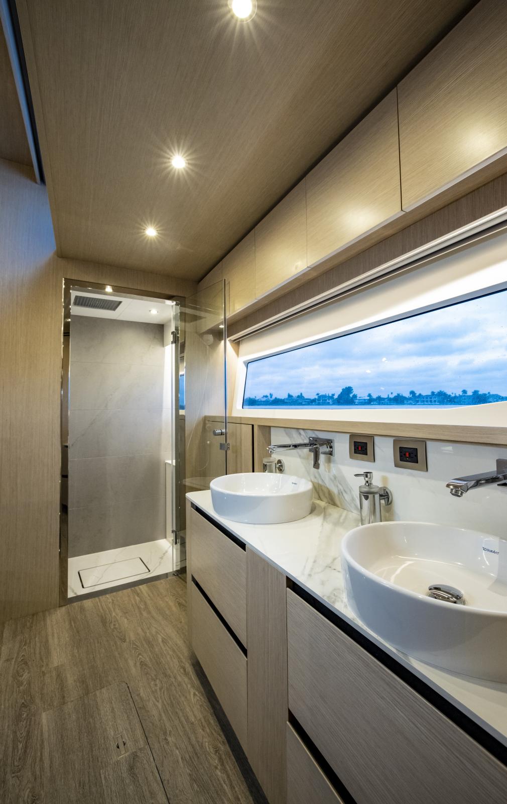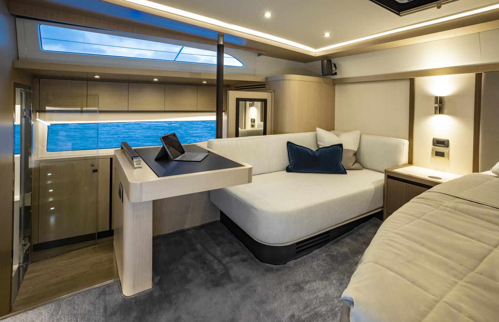 Volume et confort exceptionnels : grand salon lumineux, suite propriétaire de 27 pieds de large, options d’aménagement 3 ou 4 cabines, galley ‘up’ ou ‘down’, avec matériaux haut de gamme et nombreuses fenêtres panoramiques